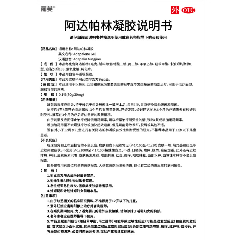 丽芙阿达帕林凝胶12g/盒第三代维a酸乳膏医用祛痘印修复淡化痘印痘坑修复祛痘药膏去黑头收缩毛孔粗大修复