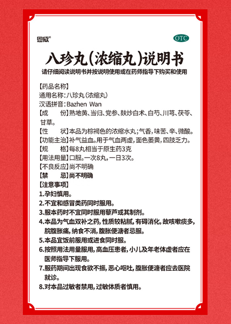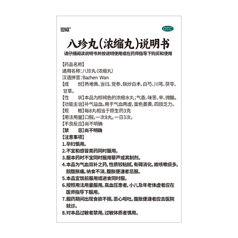 腾药 八珍丸 9g*10丸 补气益血 用于气血两虚 面色萎黄 食欲不振 四肢乏力 月经过多