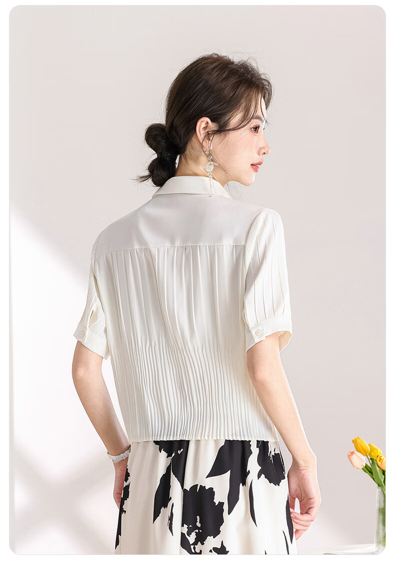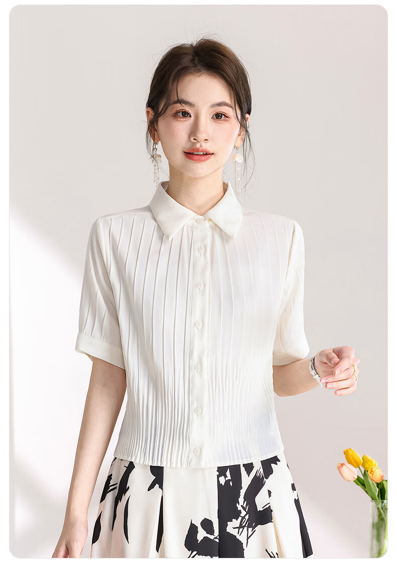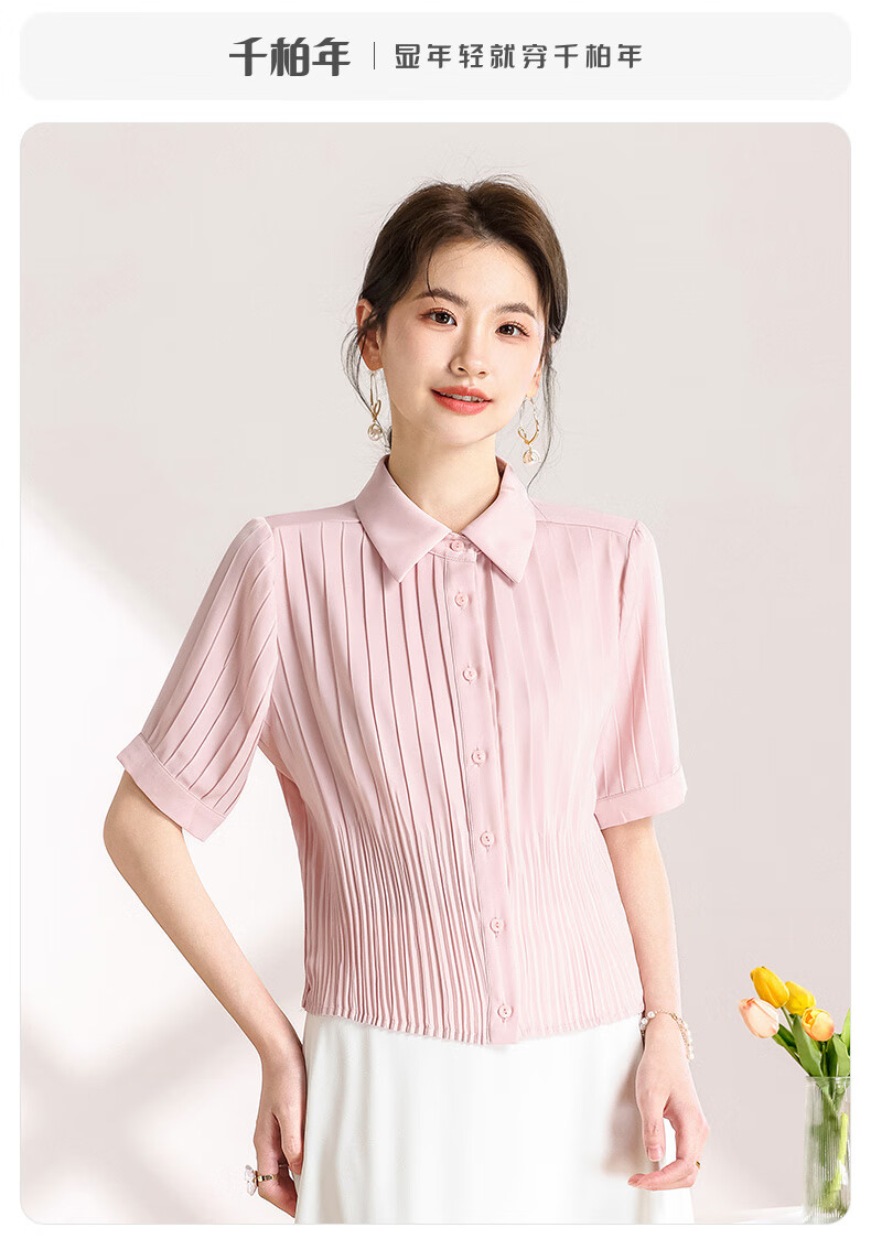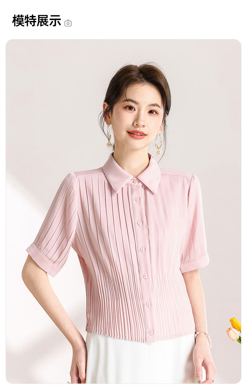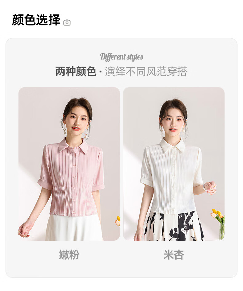 千柏年夏季新款翻领褶皱短袖正肩白衬衫女宽松透气收腰设计感通勤上衣 米杏 L (115-125斤)
