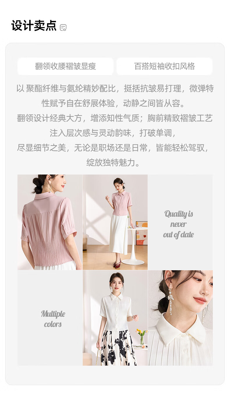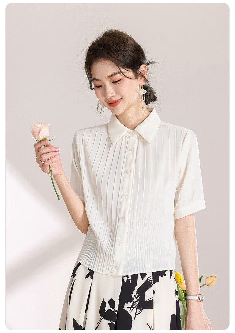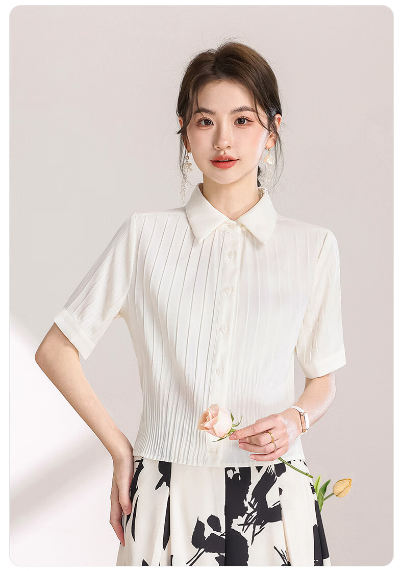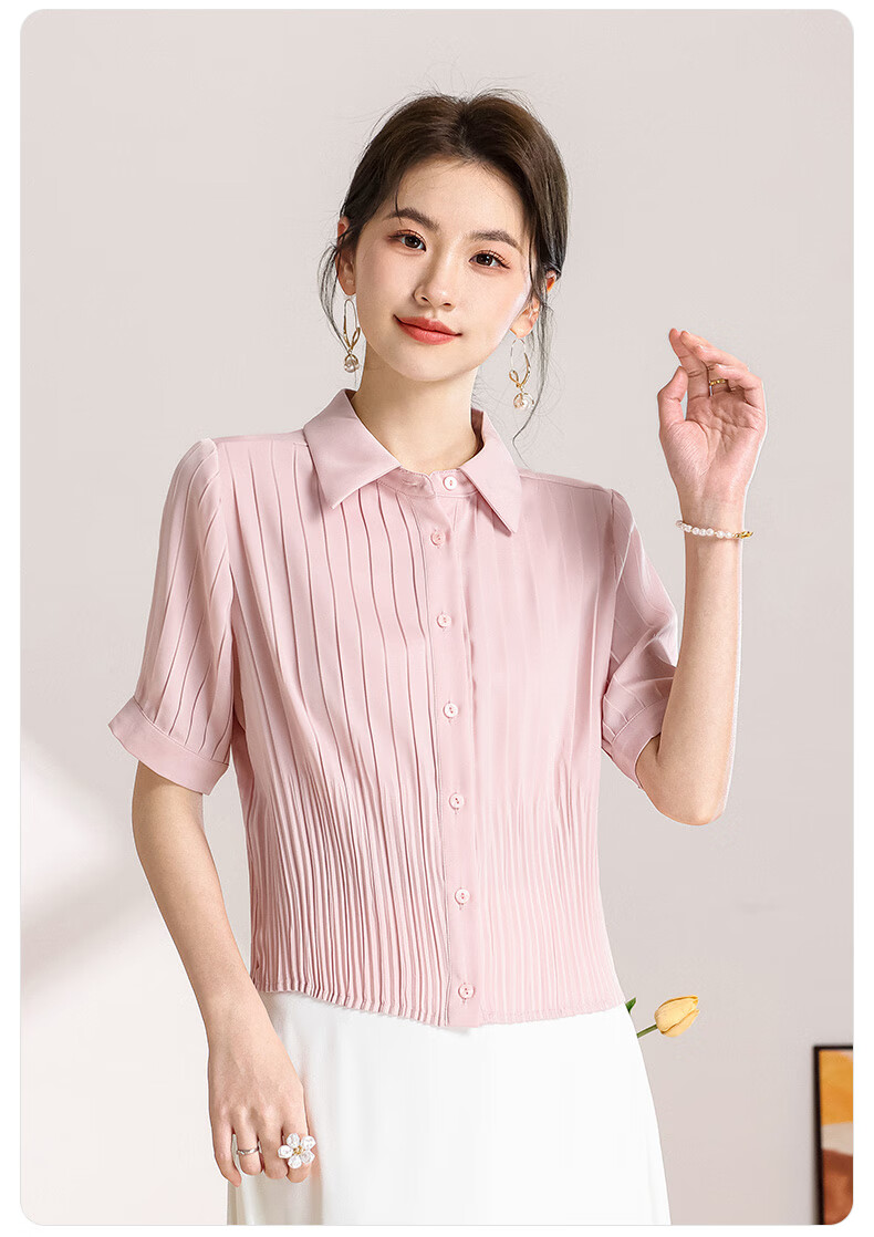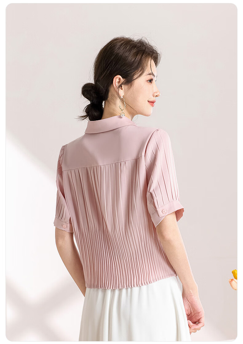 千柏年夏季新款翻领褶皱短袖正肩白衬衫女宽松透气收腰设计感通勤上衣 米杏 L (115-125斤)