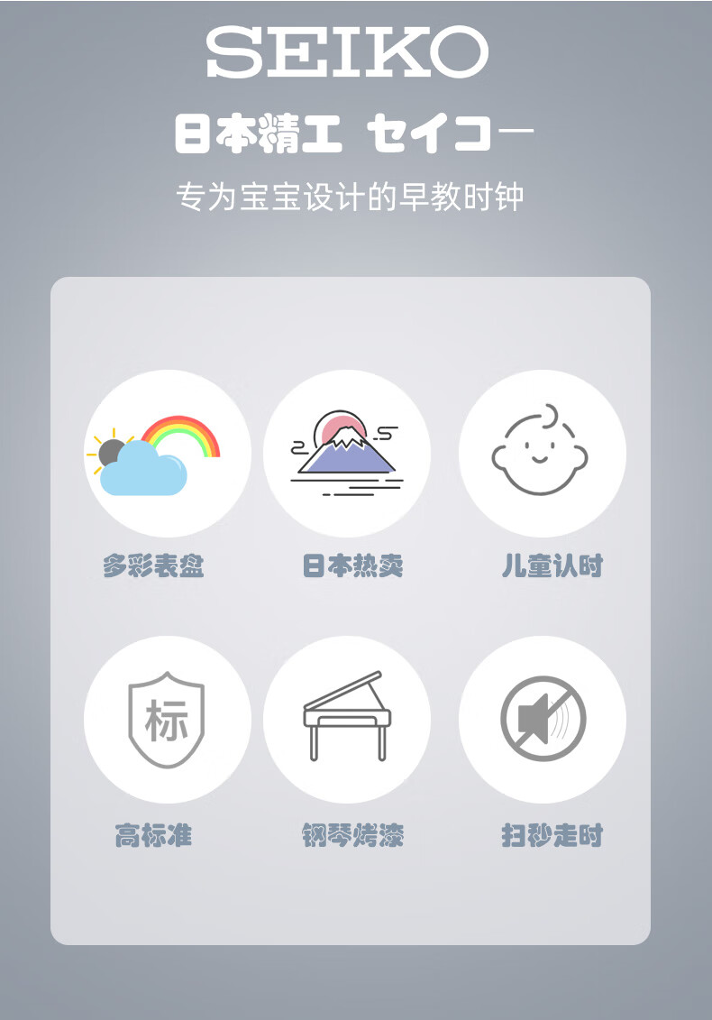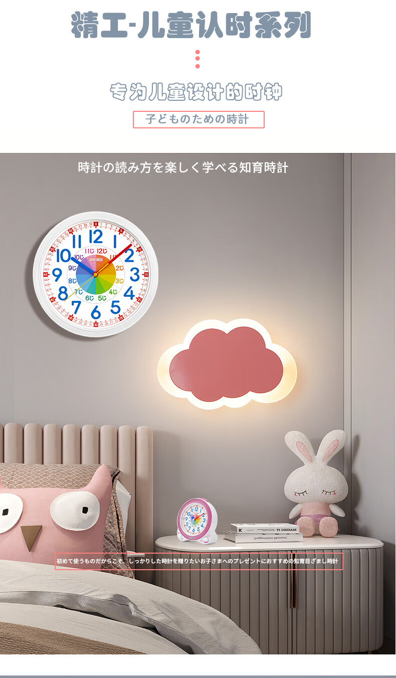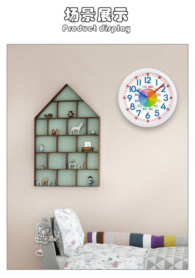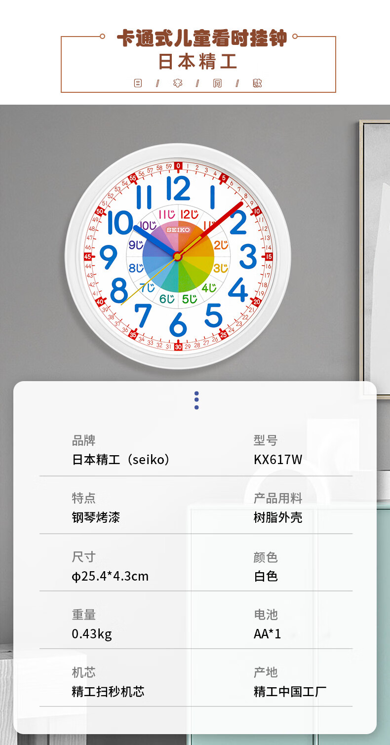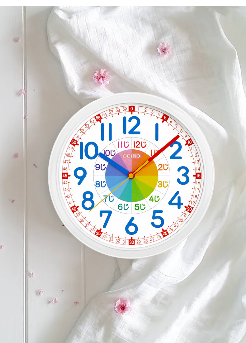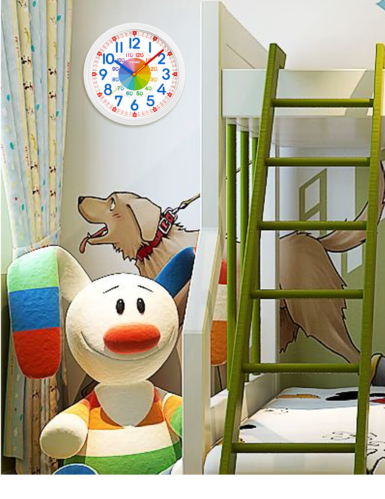 SEIKO精工家用免打孔10英寸25cm儿童认时钟表挂墙卧室扫秒学生挂钟