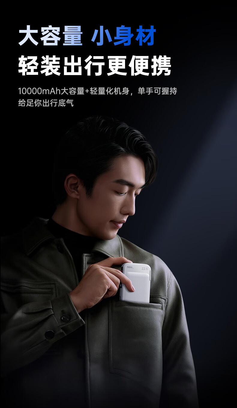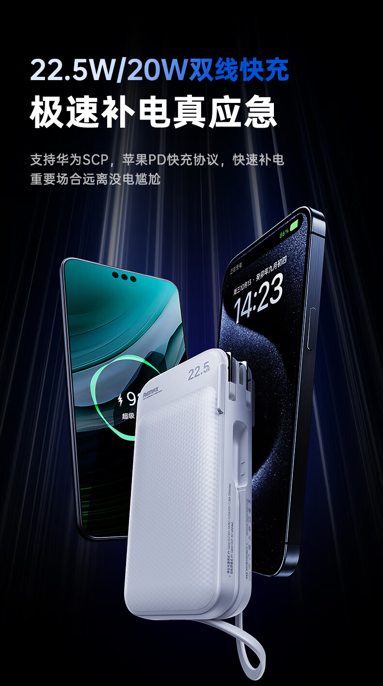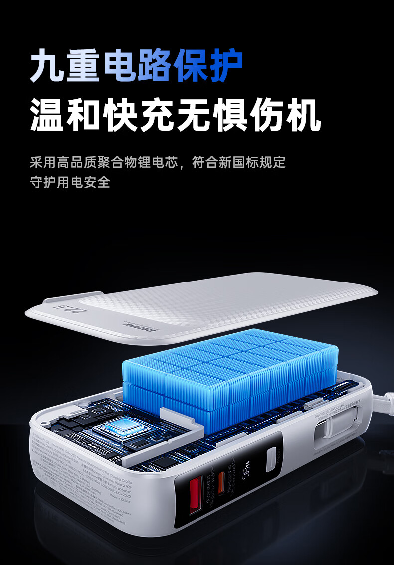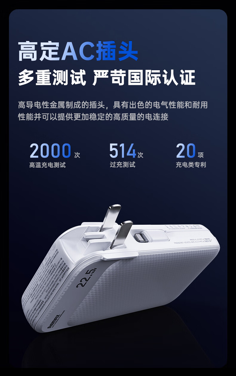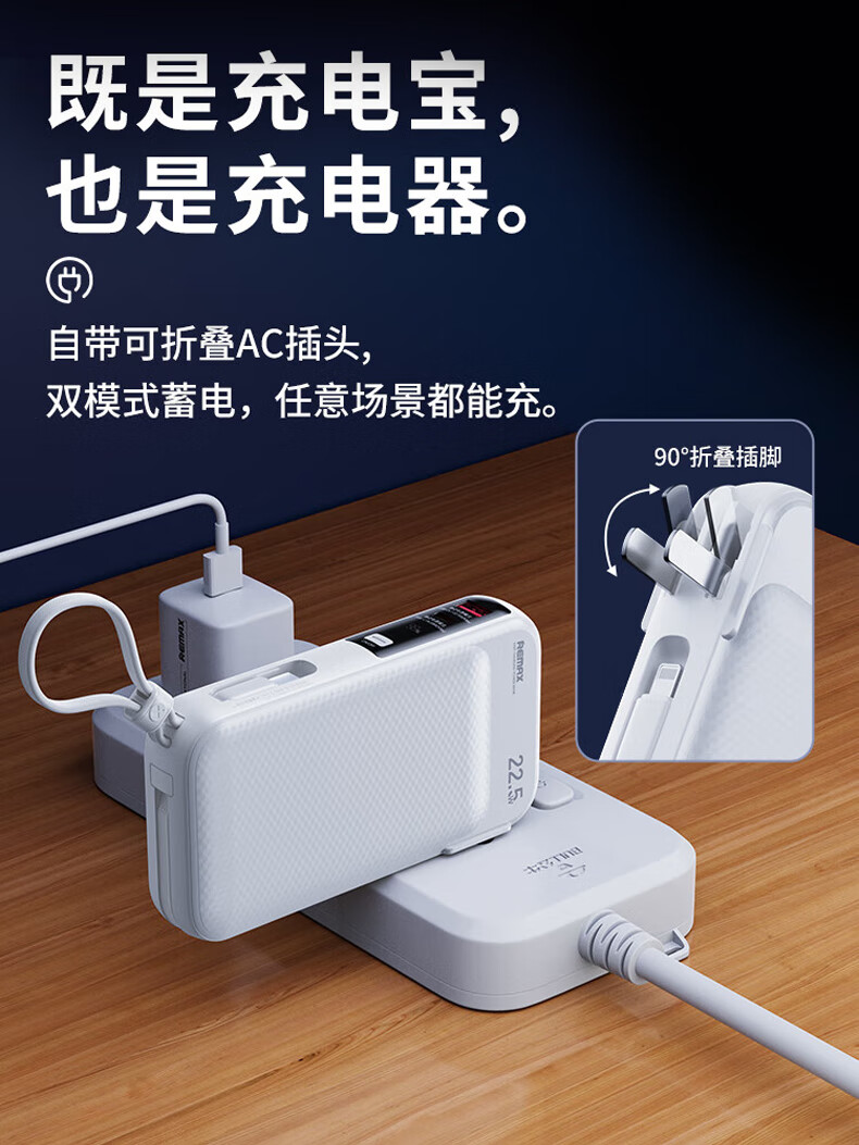 remax睿量3C认证丨三合一自带双线快充插头22.5W充电宝10000毫安移动电源可上飞机适用苹果1617华为小米