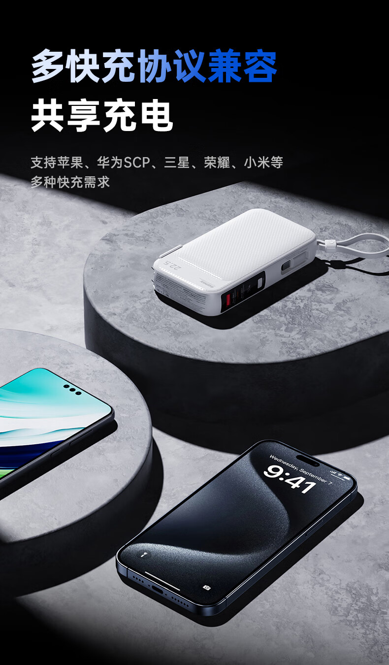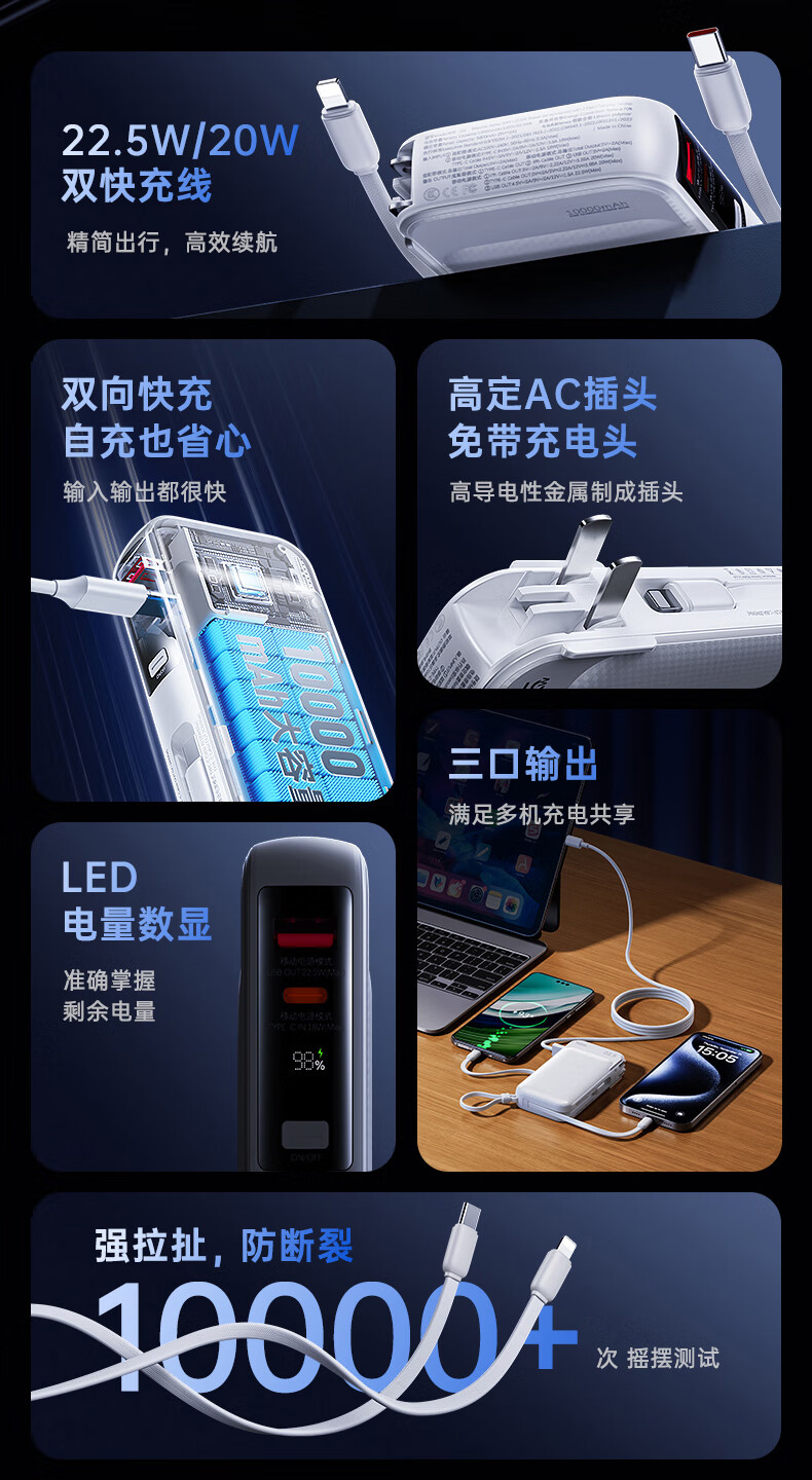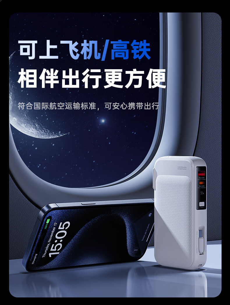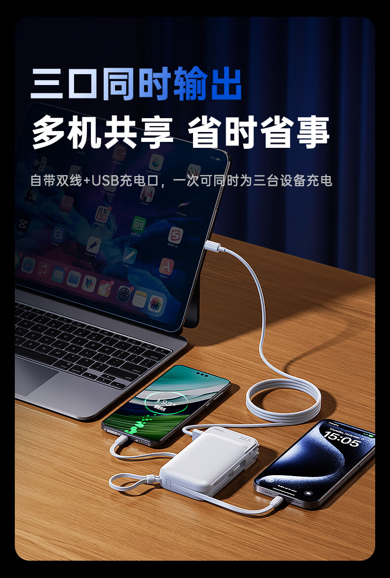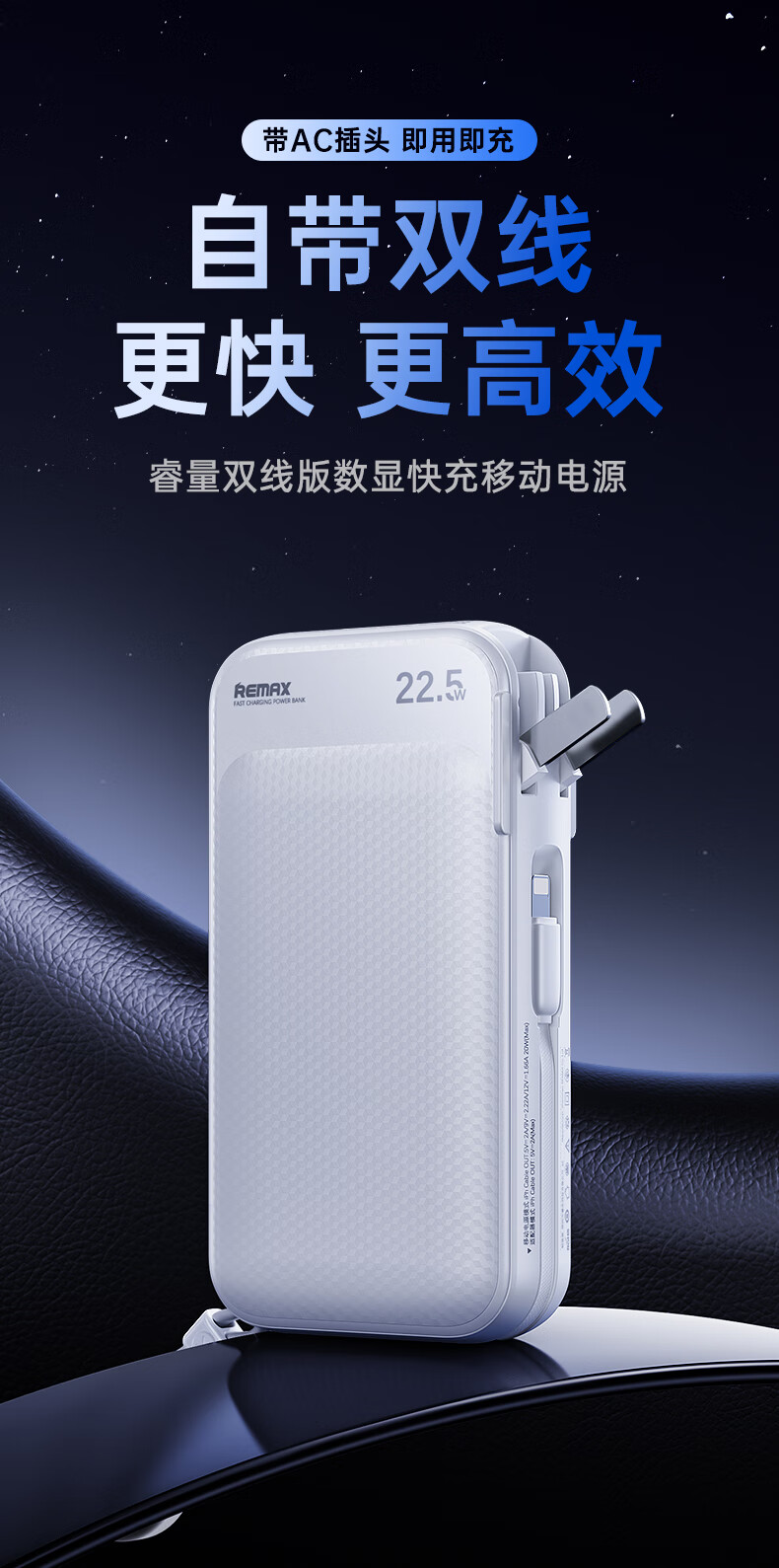 remax睿量3C认证丨三合一自带双线快充插头22.5W充电宝10000毫安移动电源可上飞机适用苹果1617华为小米