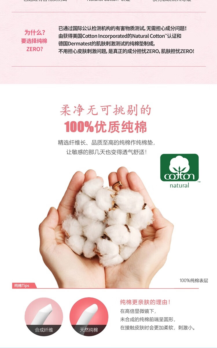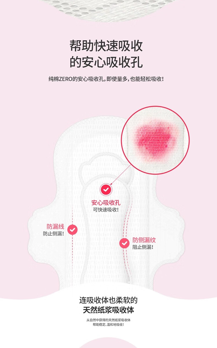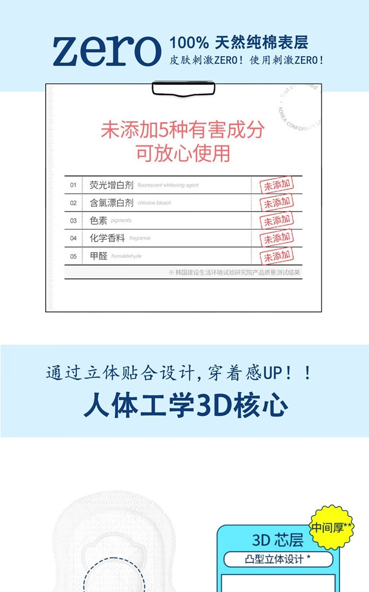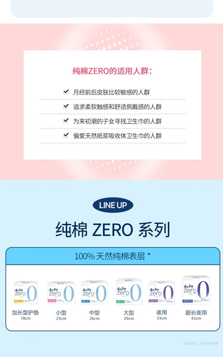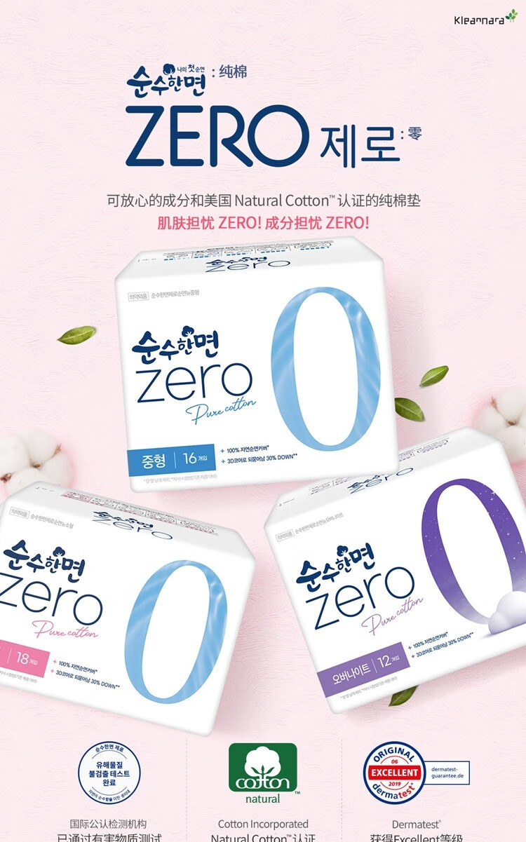可绿纳乐韩国进口zero卫生巾纯棉透气防漏无香无荧光剂夜用 33cm 12片