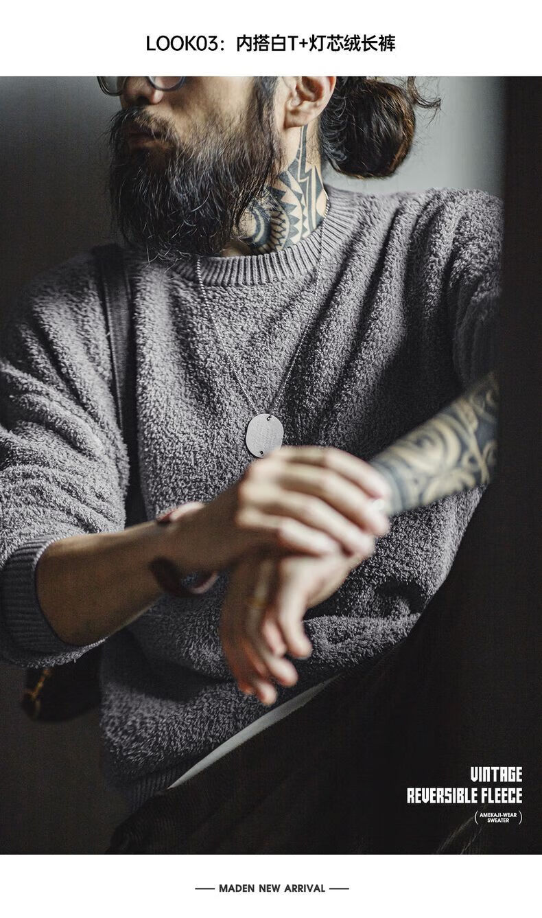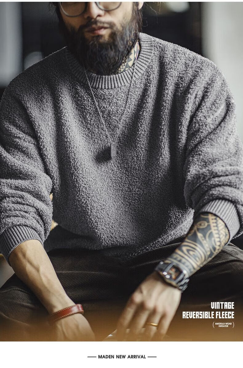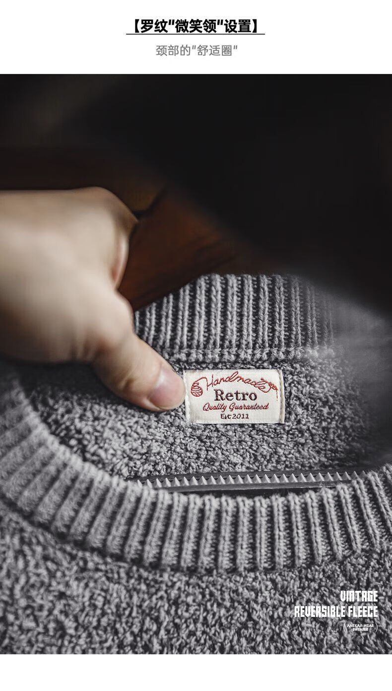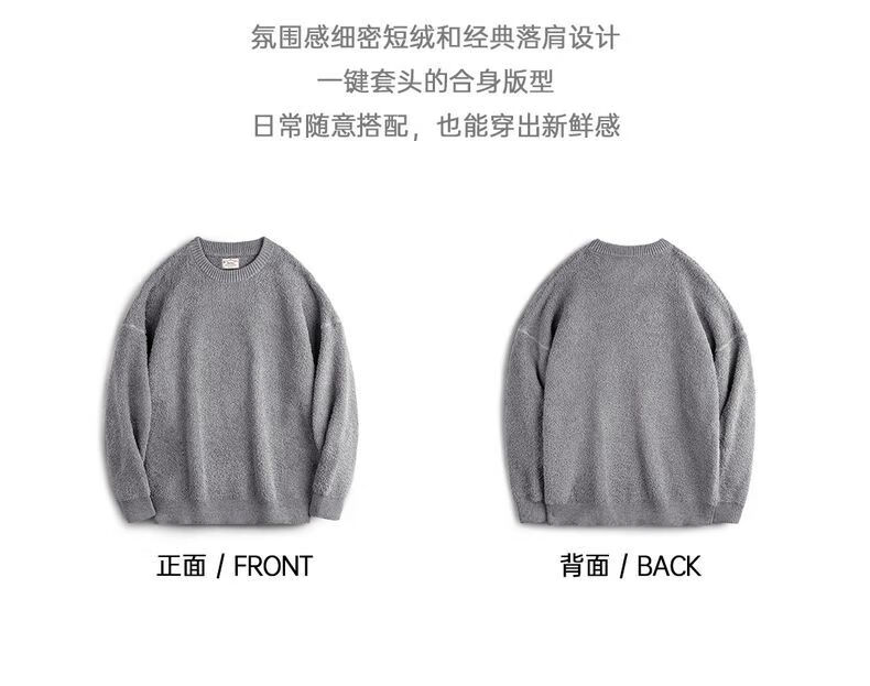 马登 MADEN美式复古单边绒套头毛衣男秋季罗纹圆领落肩慵懒风灰色保暖上衣 陨石灰 XL