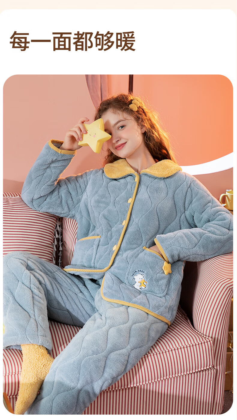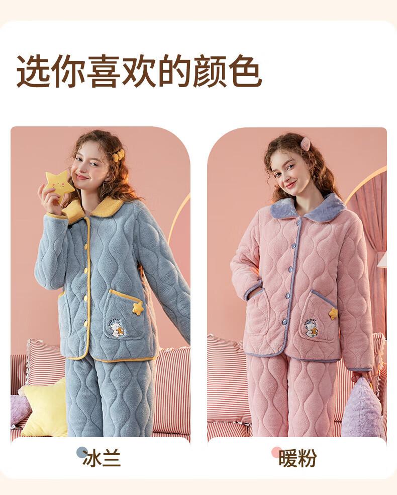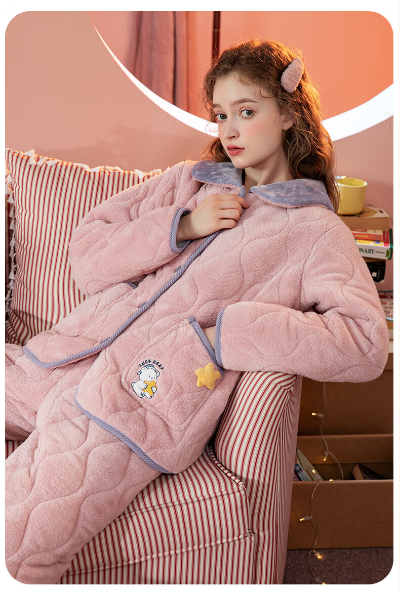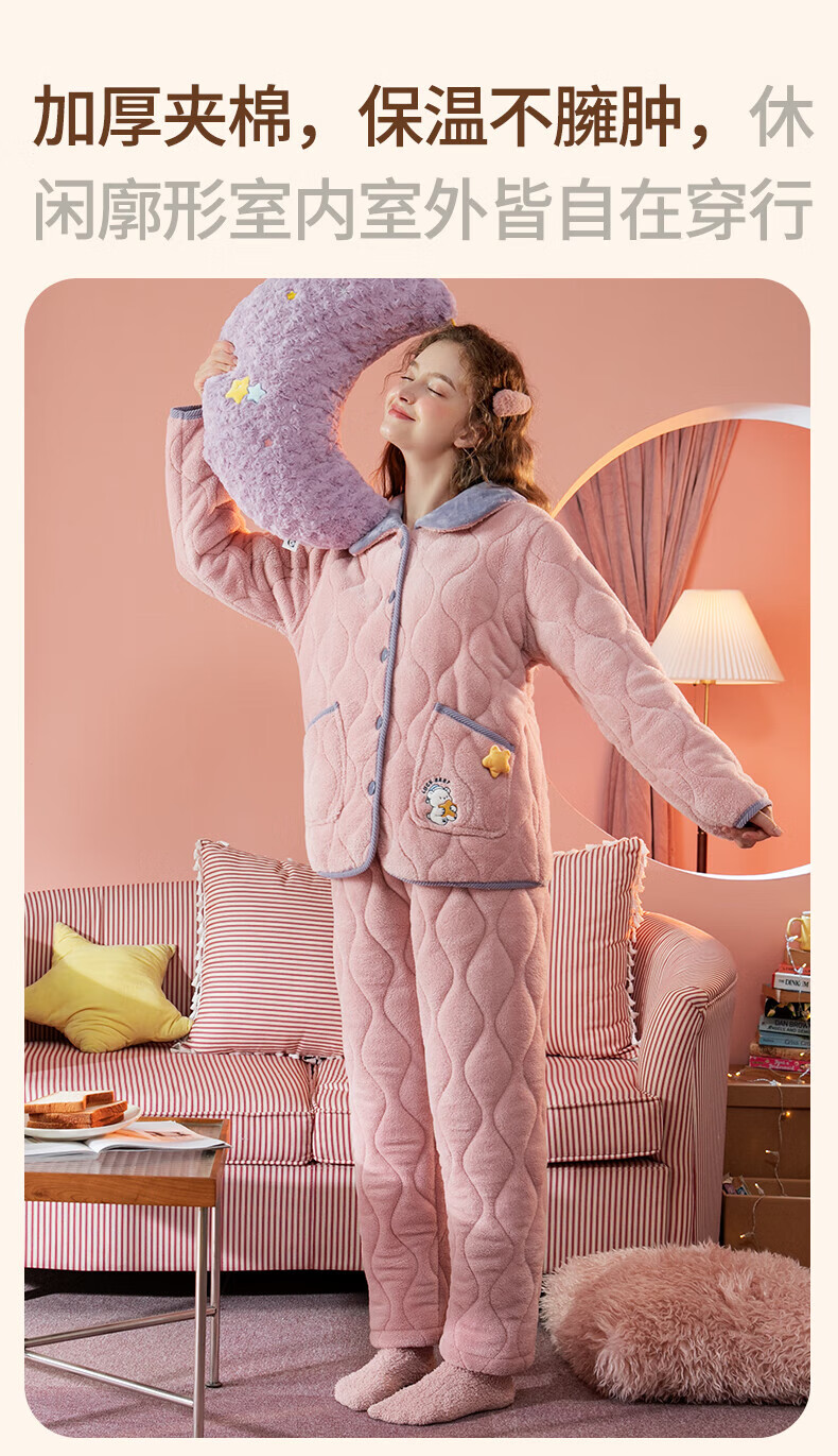 芬腾睡衣女【三层夹棉】秋冬暖绒翻领星星小熊保暖长袖家居服套装 暖粉 L