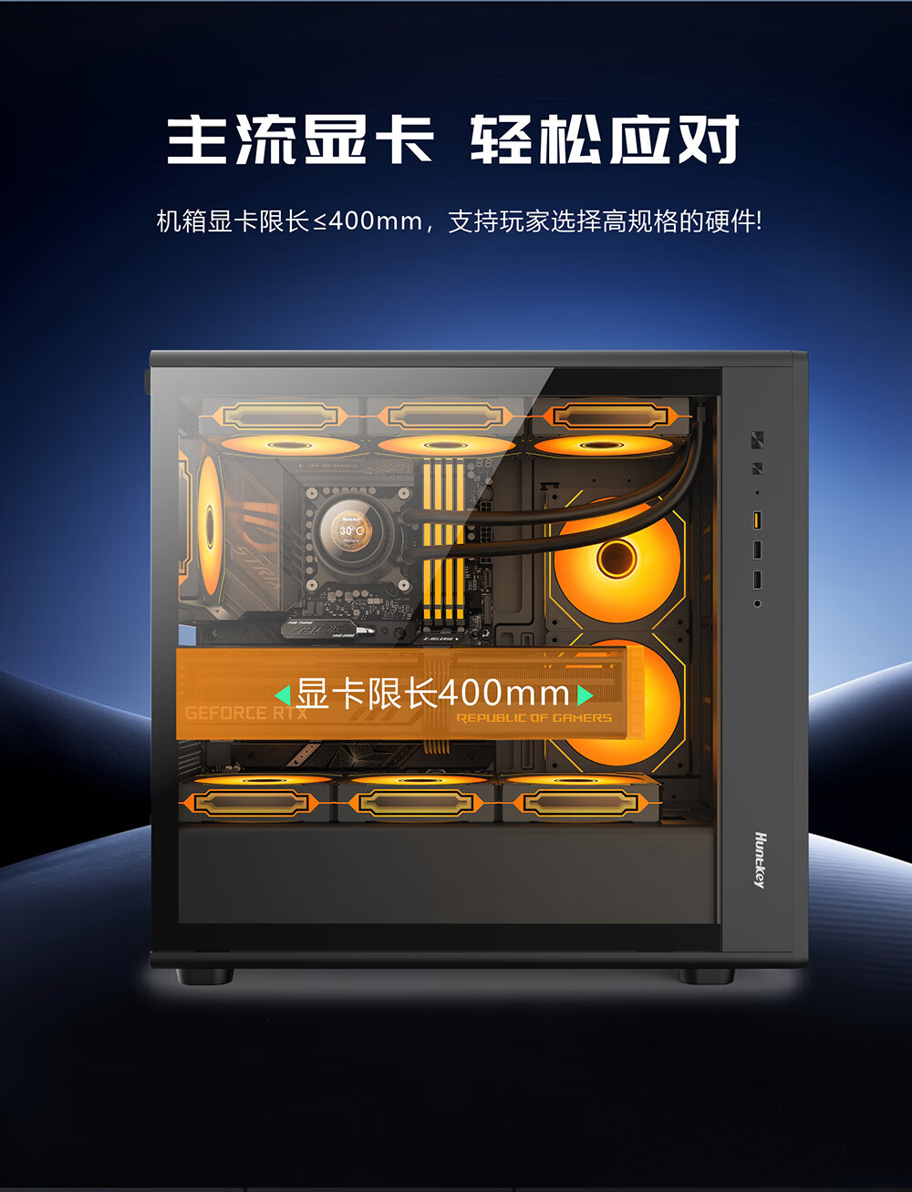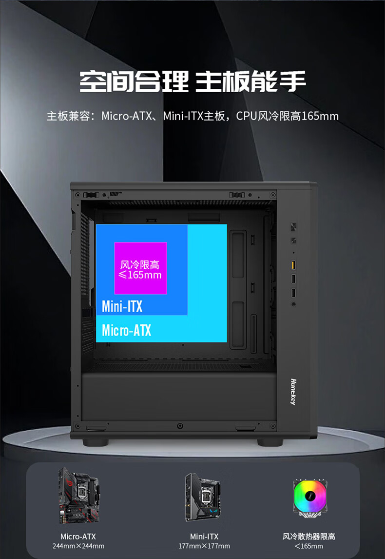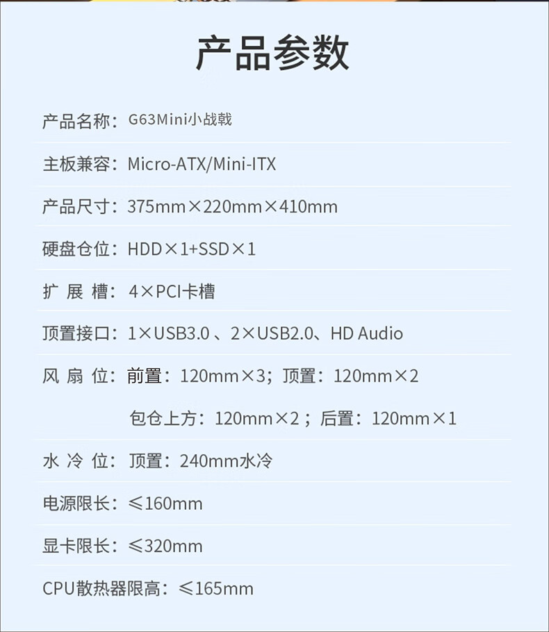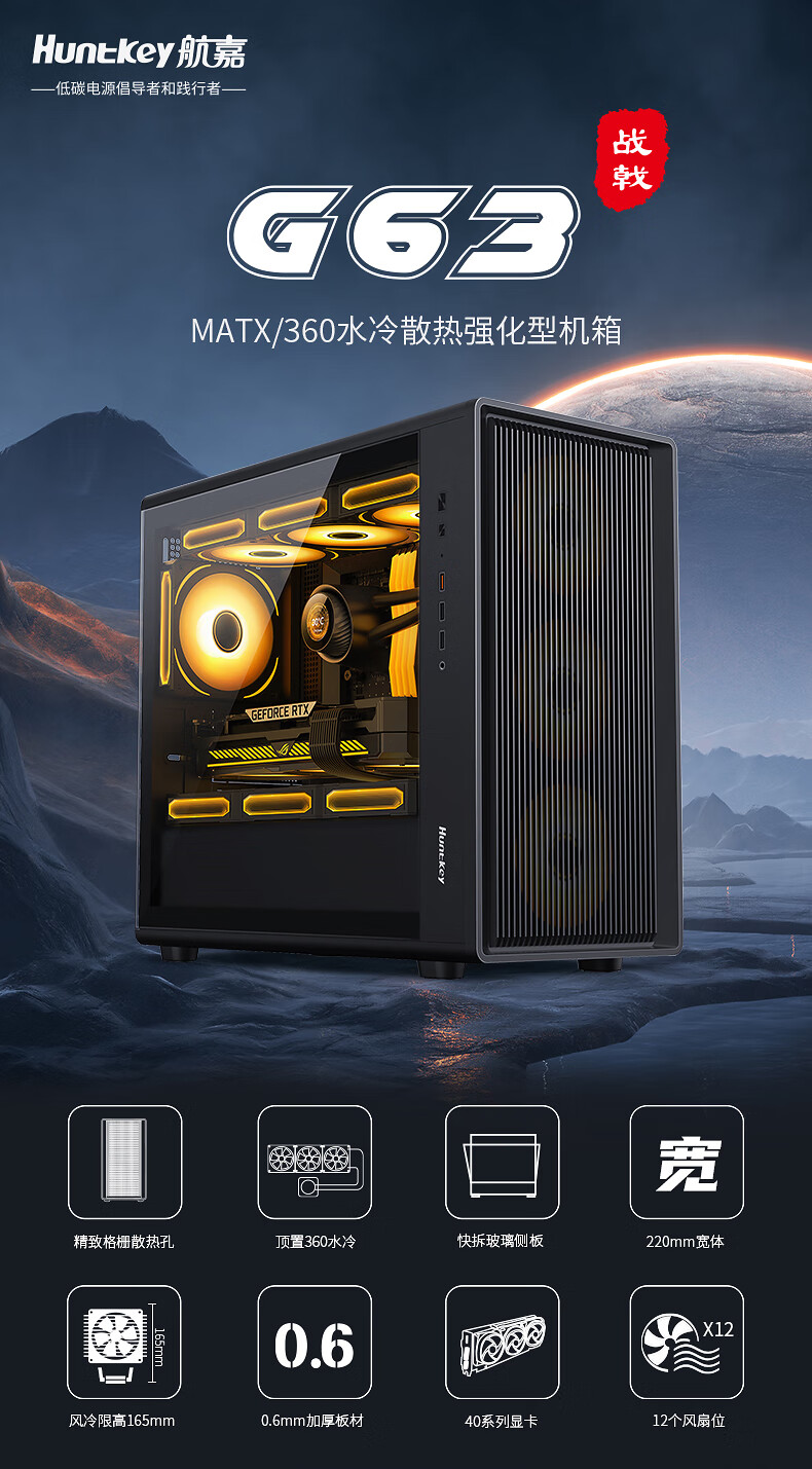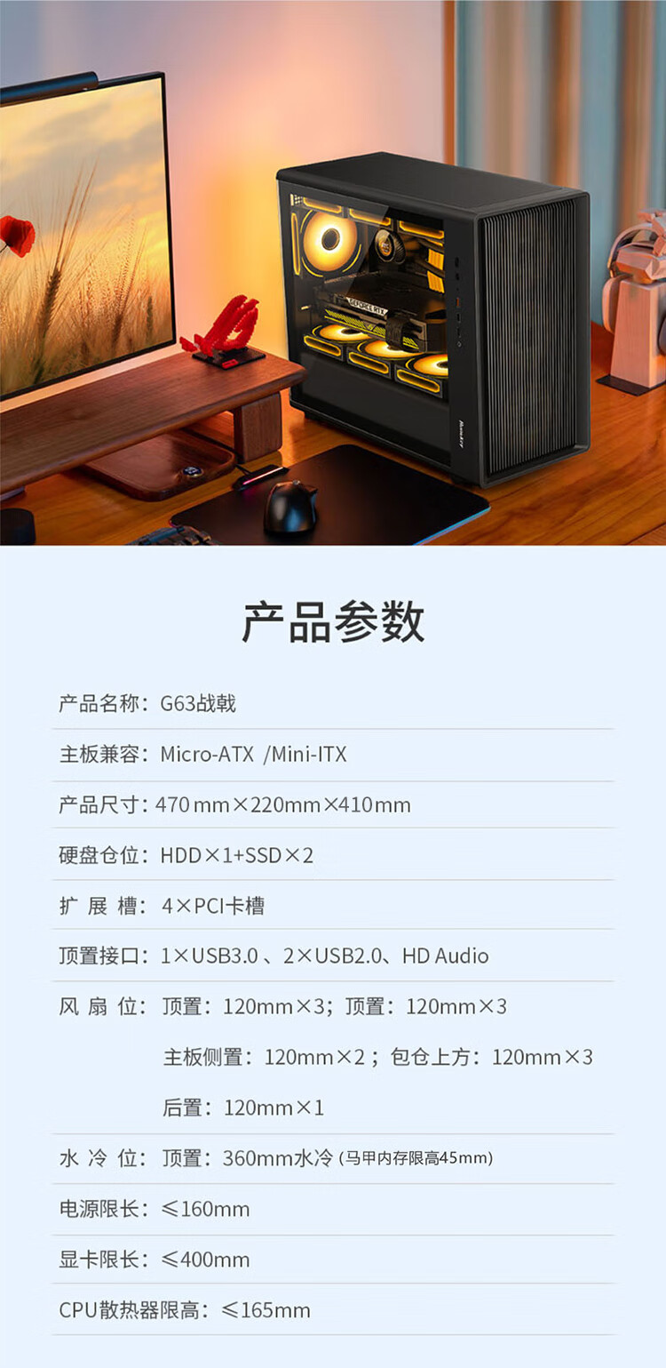 航嘉G63战戟 侧透玻璃机箱 M-ATX主板/长显卡/360水冷 G63mini台式机电脑主机机箱/卡扣式玻璃 G63mini黑色(显卡限长32厘米/240水冷)