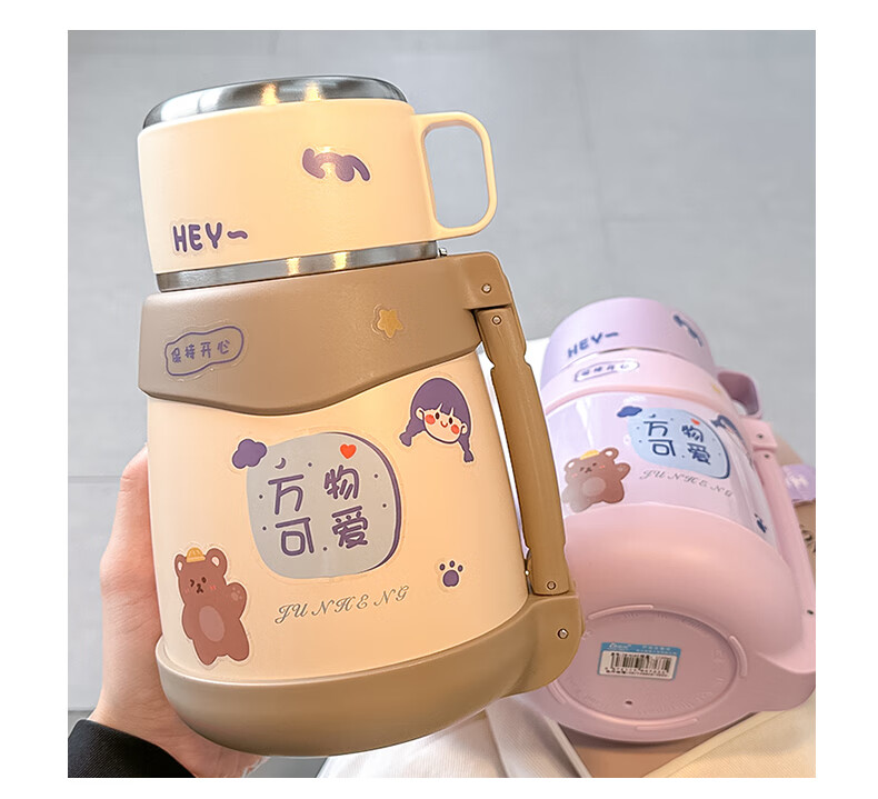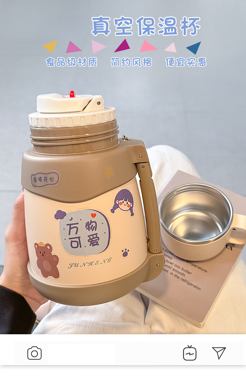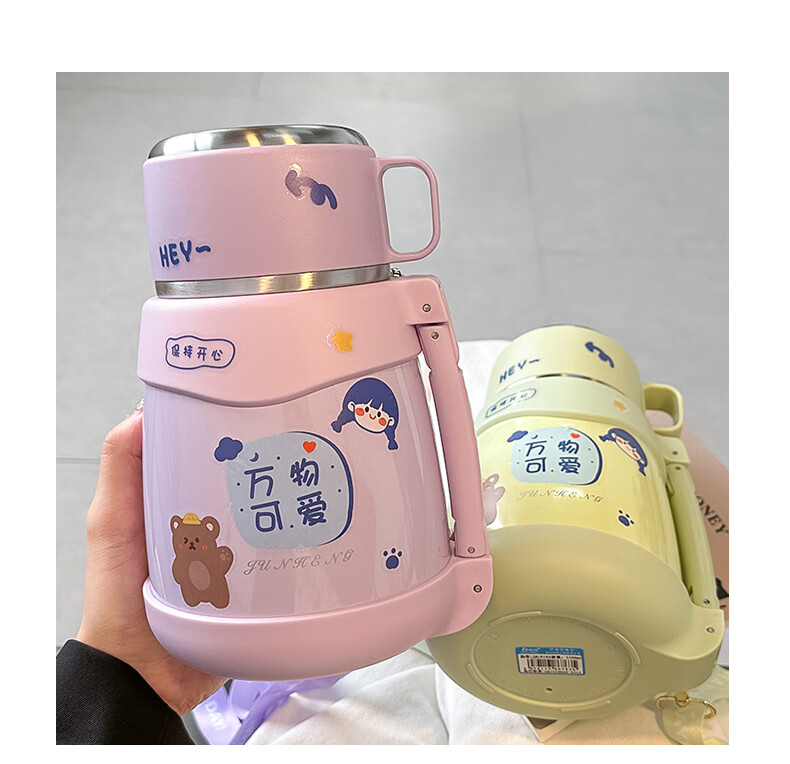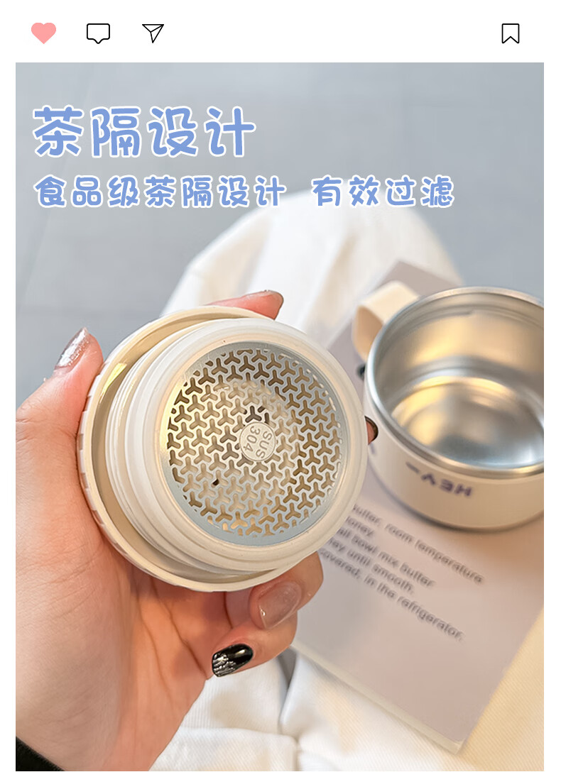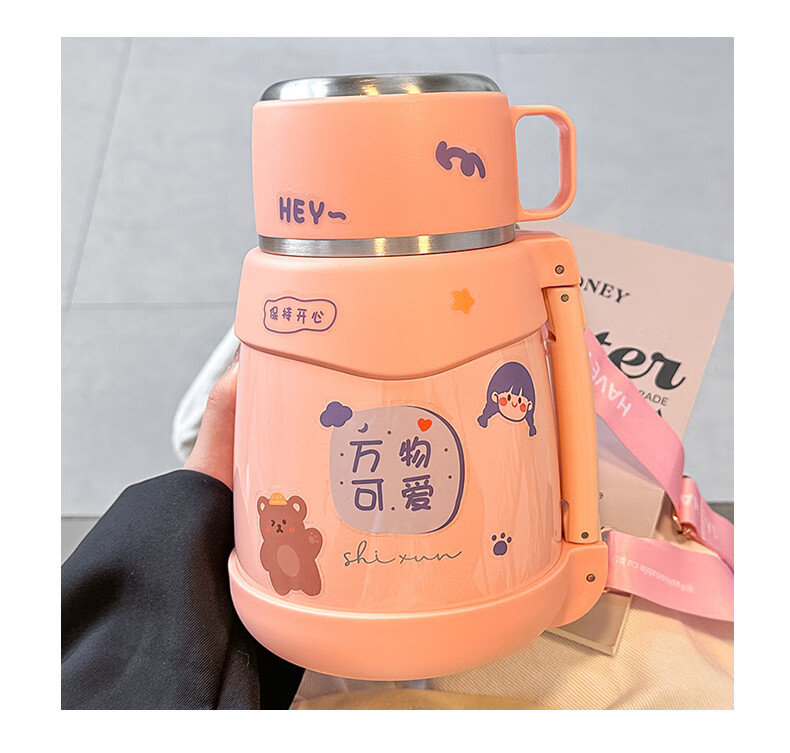 DEATKN德国大容量保温杯女生高颜值大肚杯子带盖便携可爱儿童316不锈钢 【一盖两用_带茶隔】粉色+3D立体贴* 1100ml