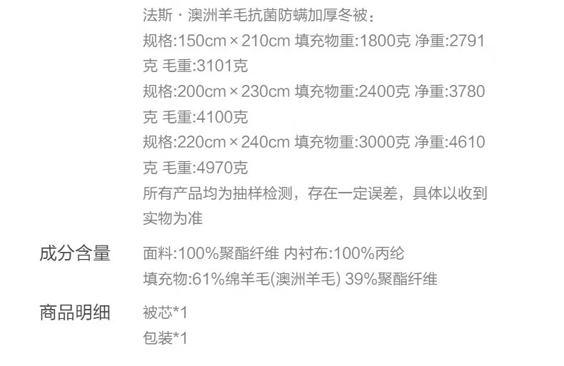 百丽丝被子澳洲羊毛被a类防螨被芯四季被冬被加厚冬被 法斯·澳洲羊毛抗菌防螨加厚冬被 200cm*230cm