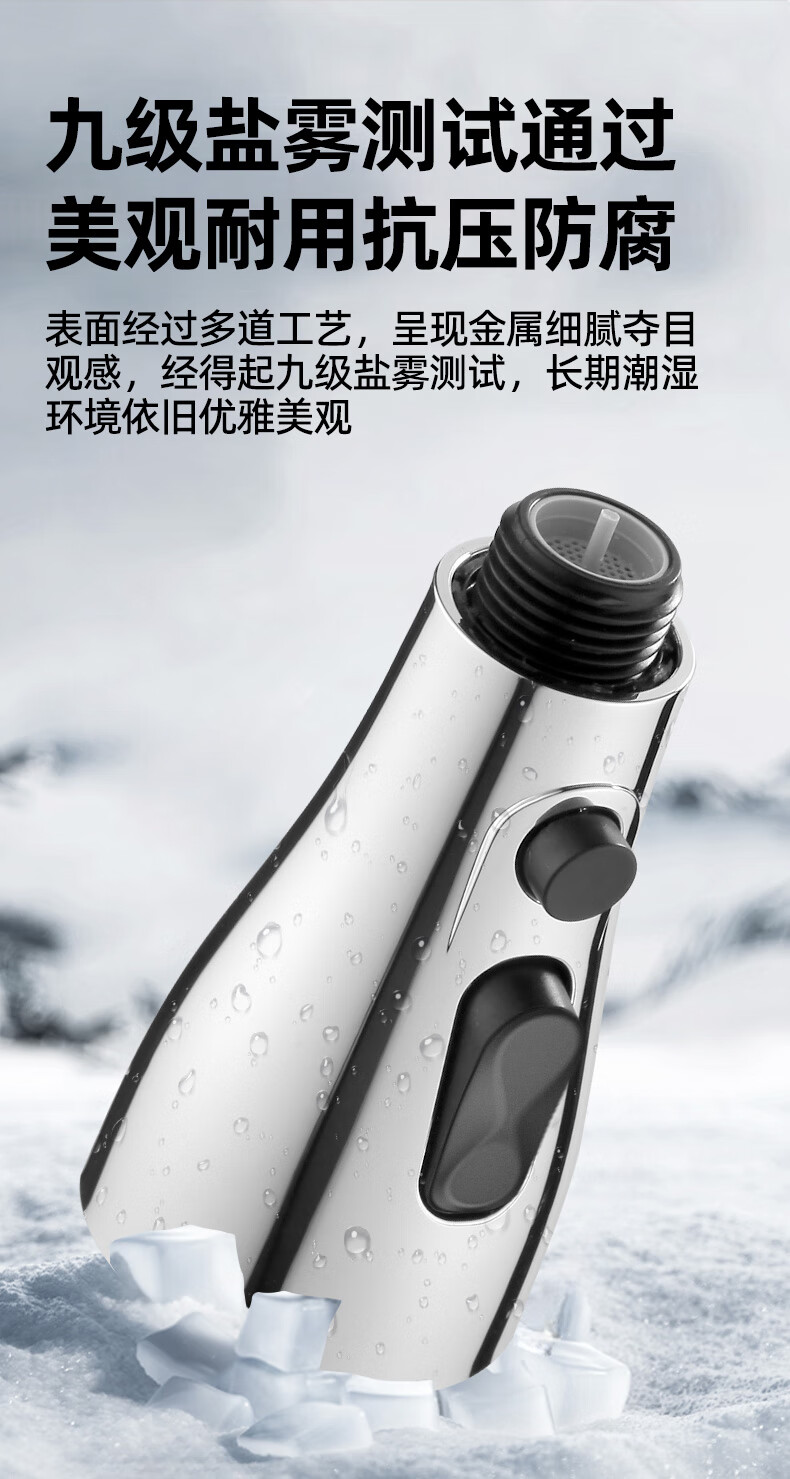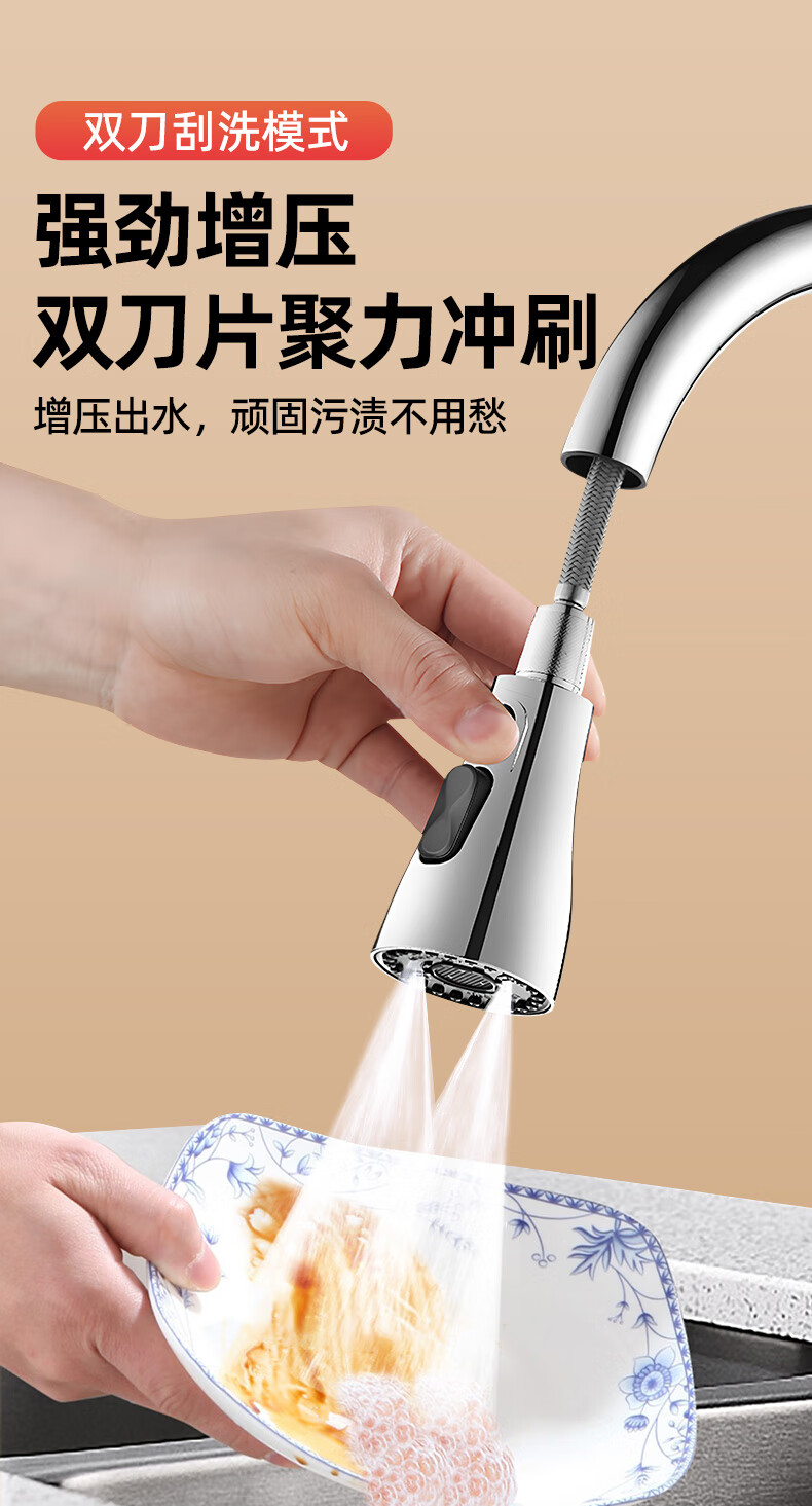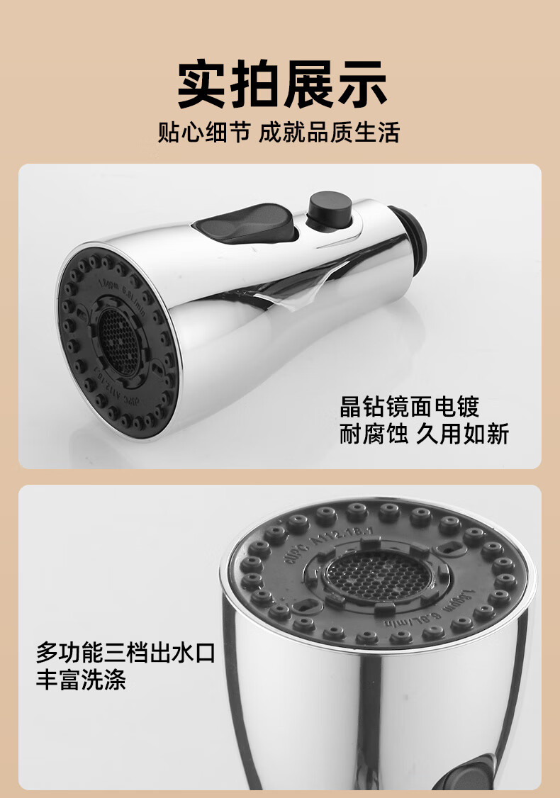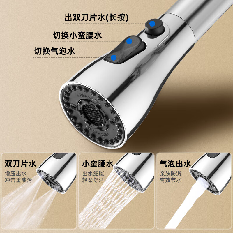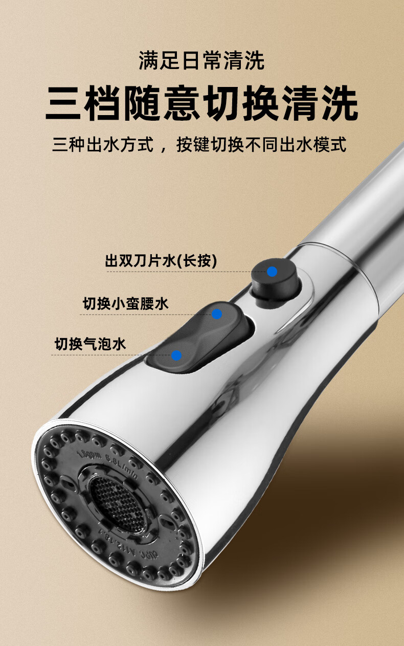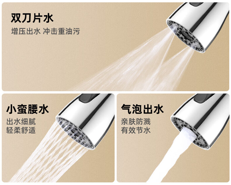 一靓双刀小蛮腰款电镀银厨房抽拉水龙头替换头起泡器水嘴防溅头3239