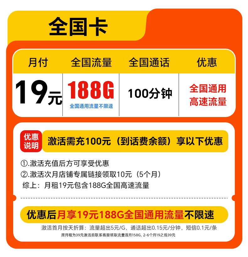 中国联通流量卡不限速纯上网通用电话卡手机卡5G卡大流量无限速流量卡联通流量卡 全国卡19元188G全国流量+100分钟|可发全国
