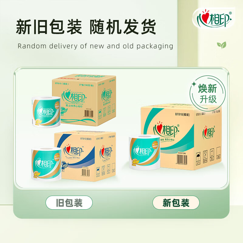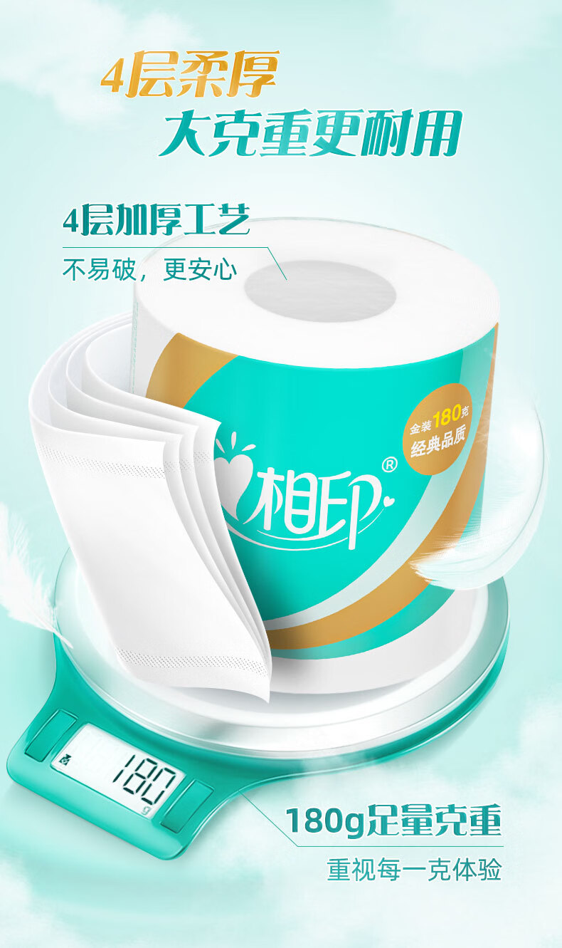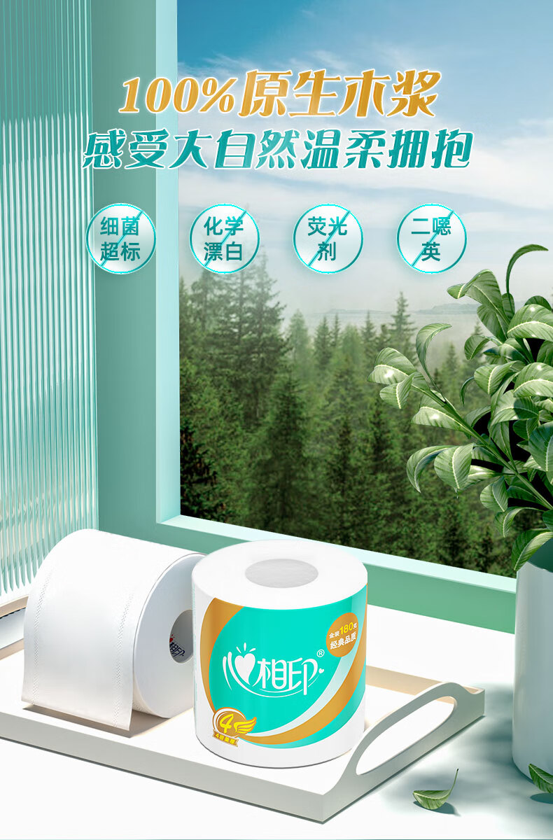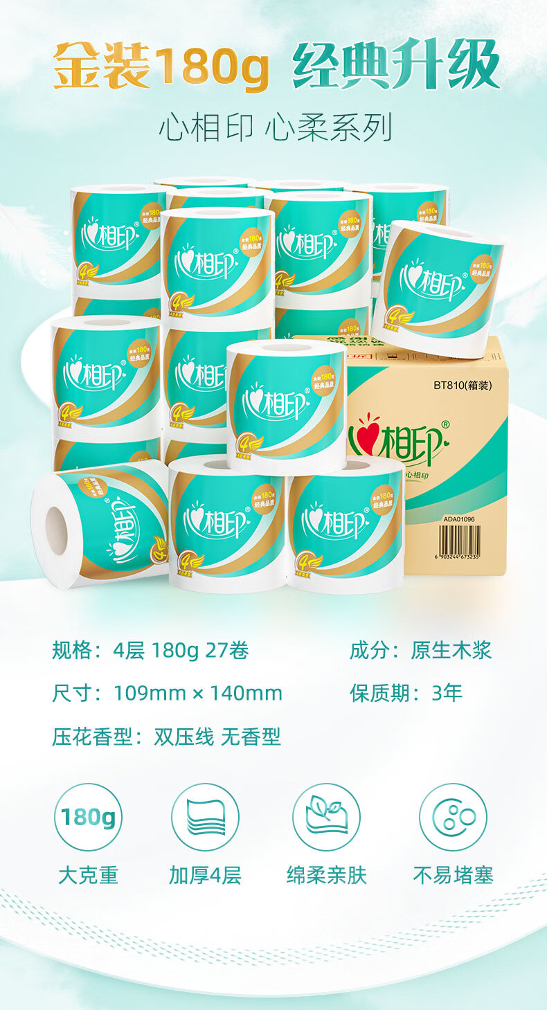 心相印卷纸 心柔有芯 4层180g*27卷卫生纸巾大克重 卷筒纸 整箱