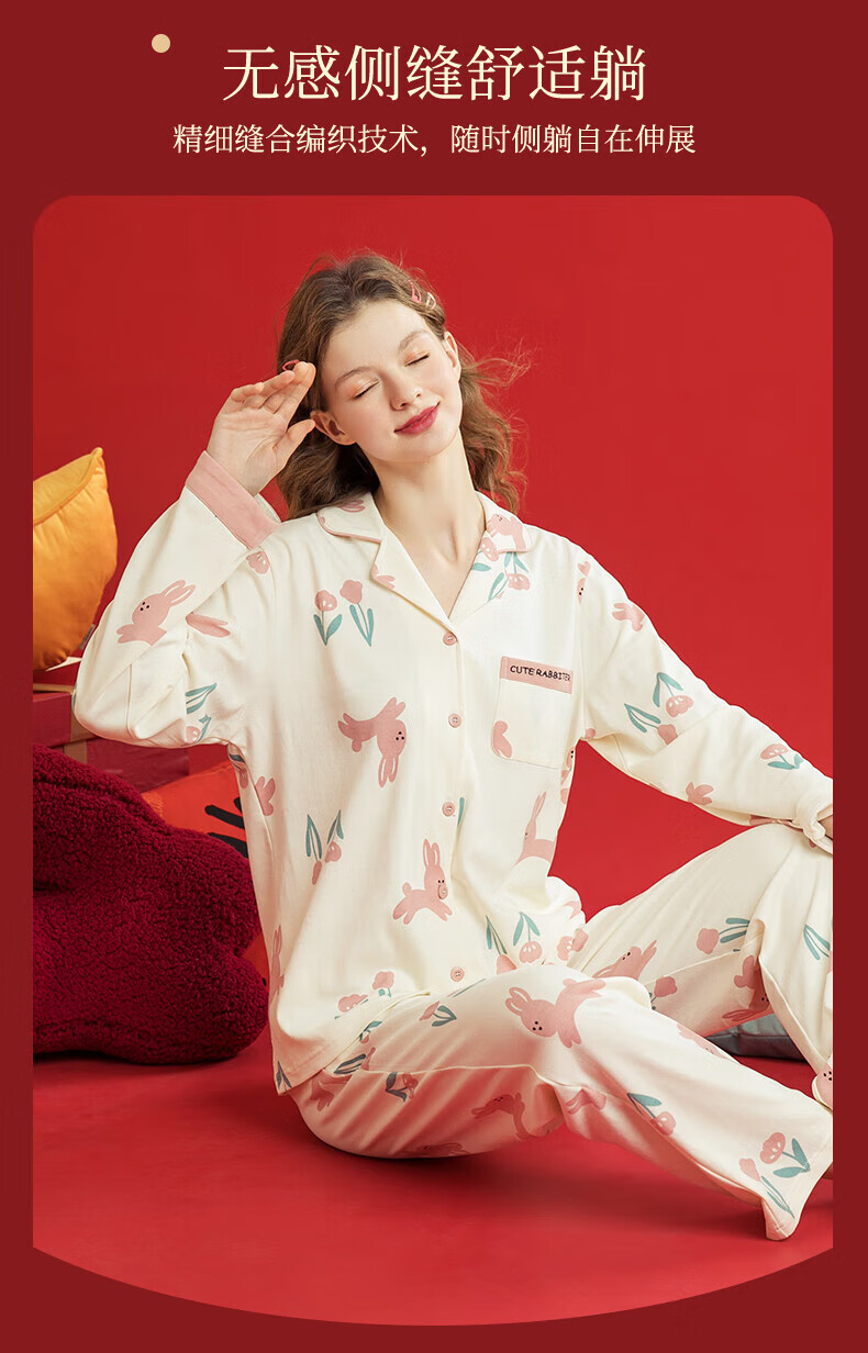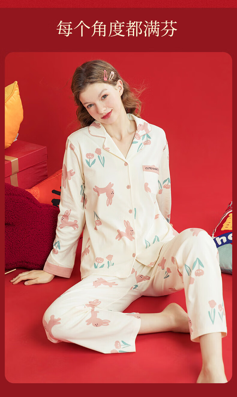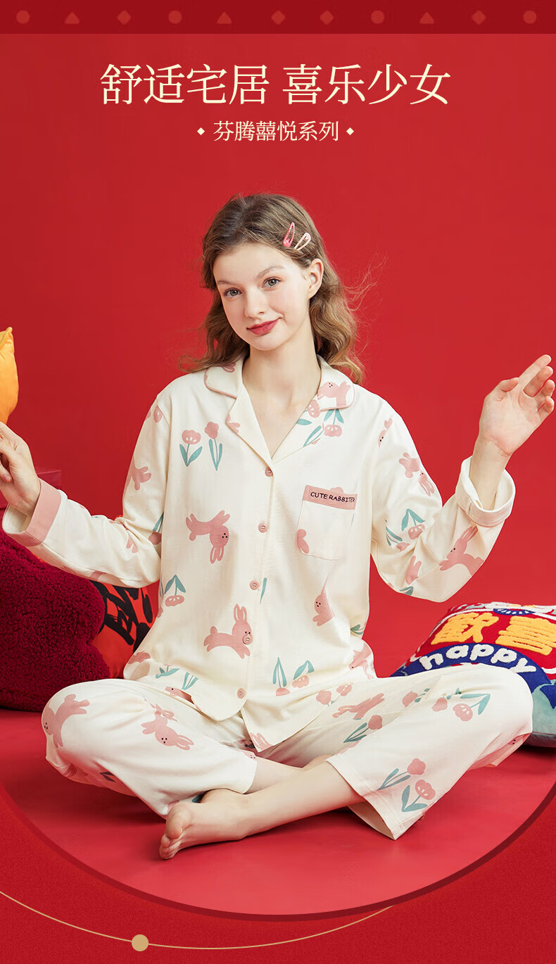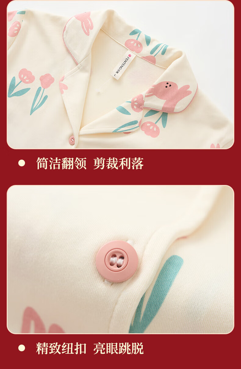 芬腾睡衣女翻领花卉宽松纯棉女棉家居服睡衣套装 豆沙粉 L