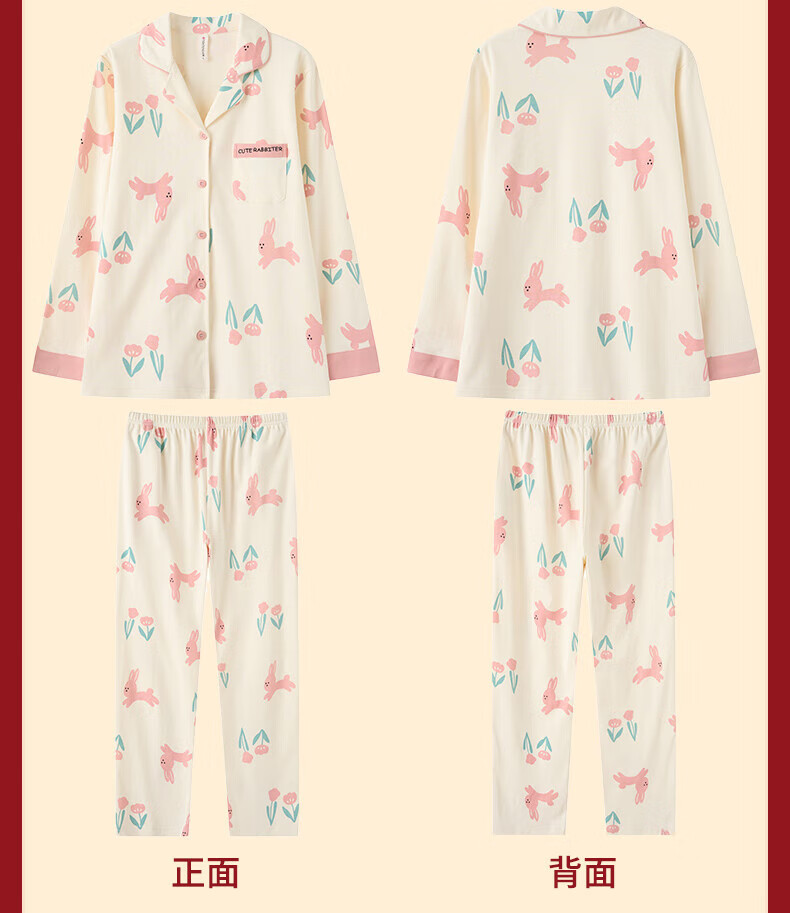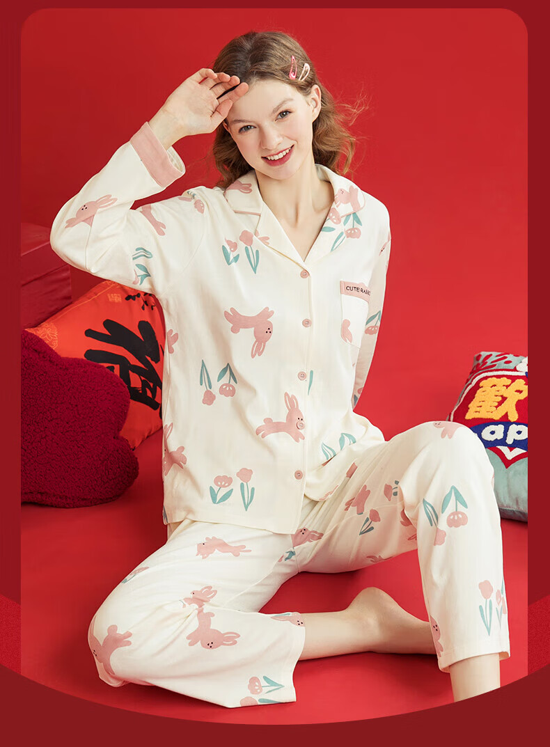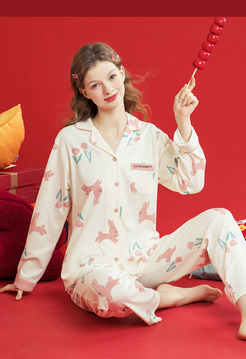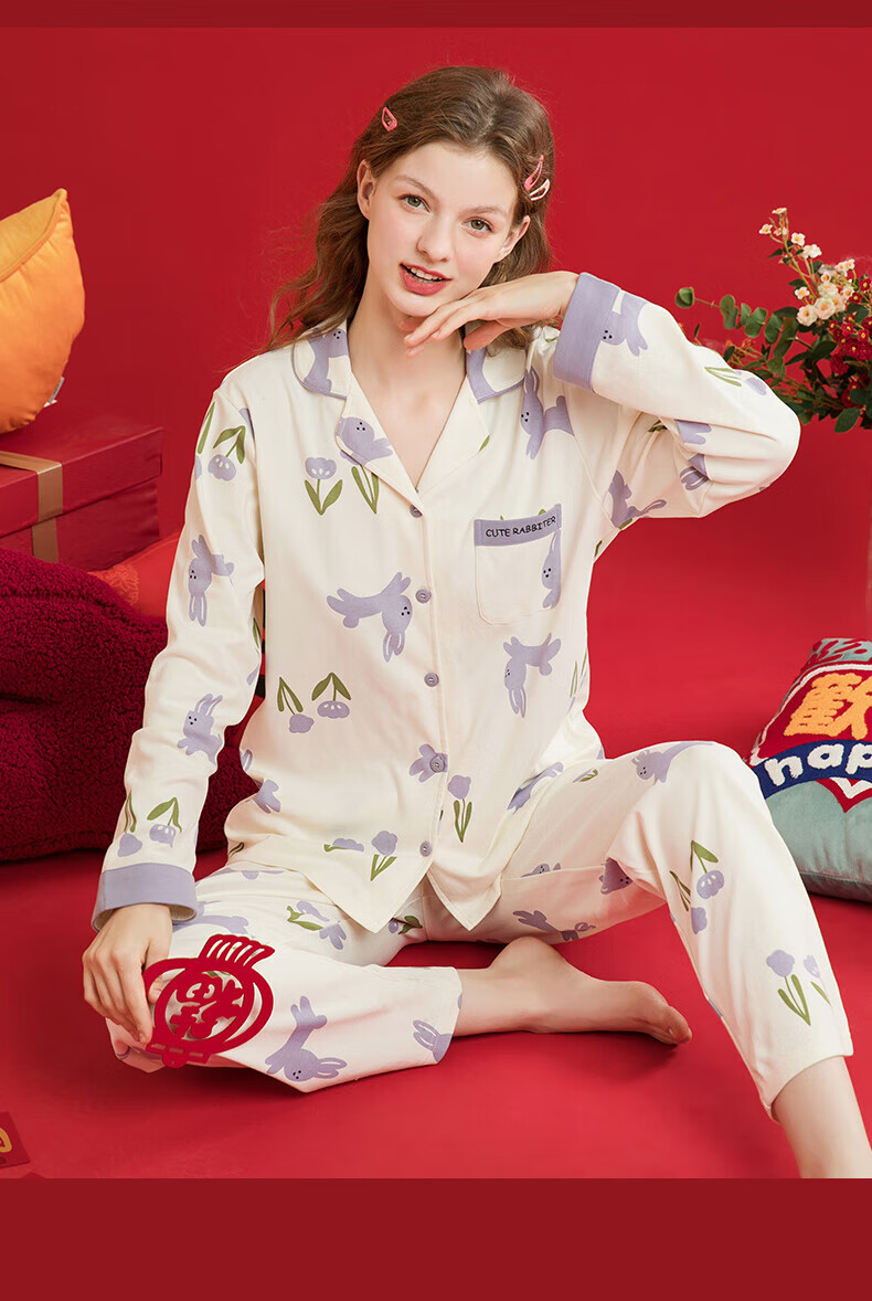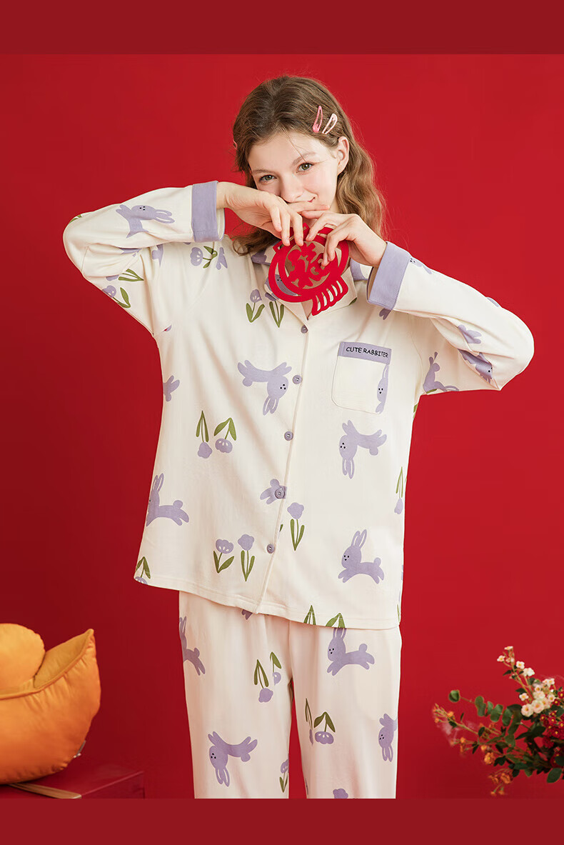 芬腾睡衣女翻领花卉宽松纯棉女棉家居服睡衣套装 豆沙粉 L