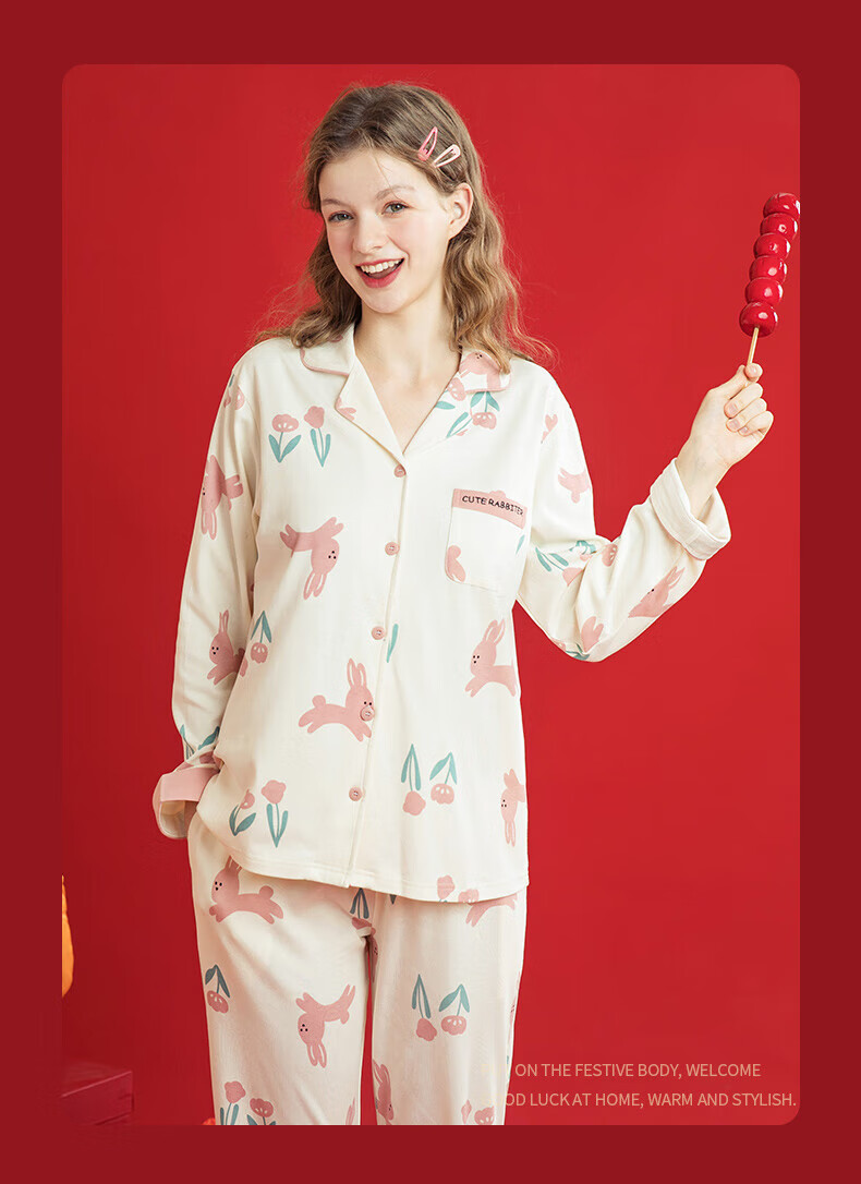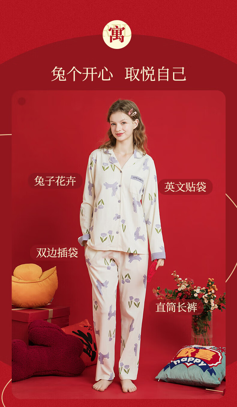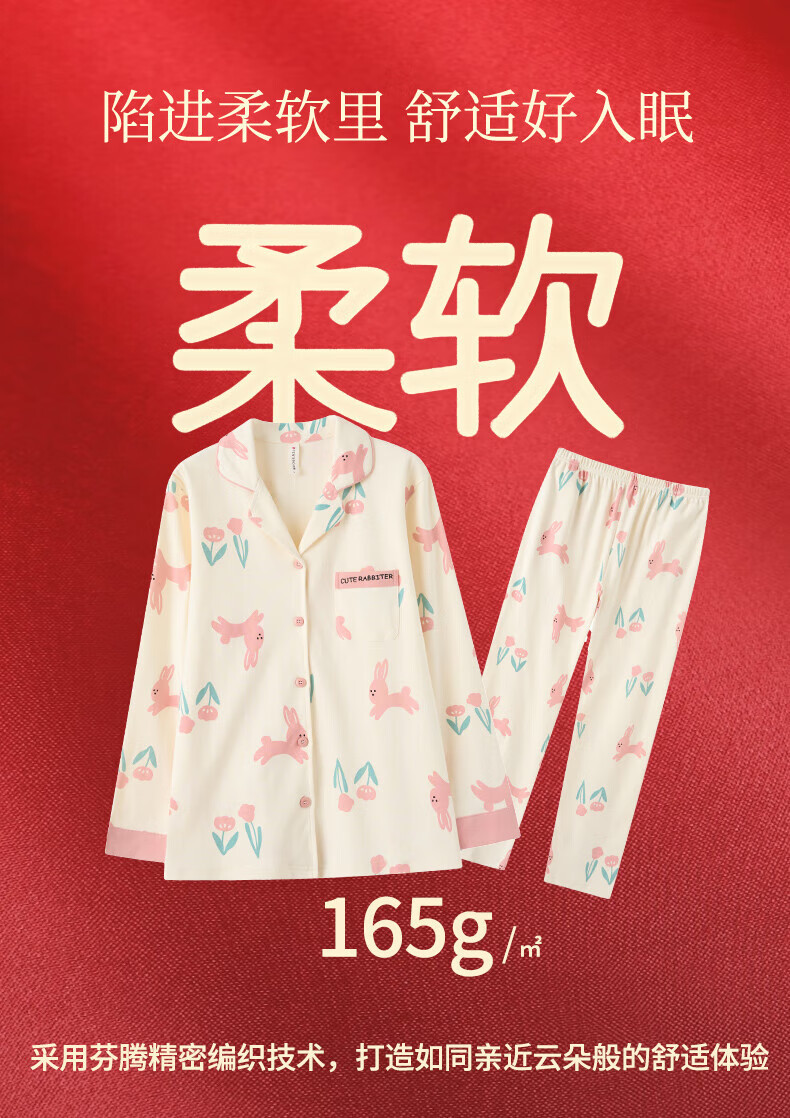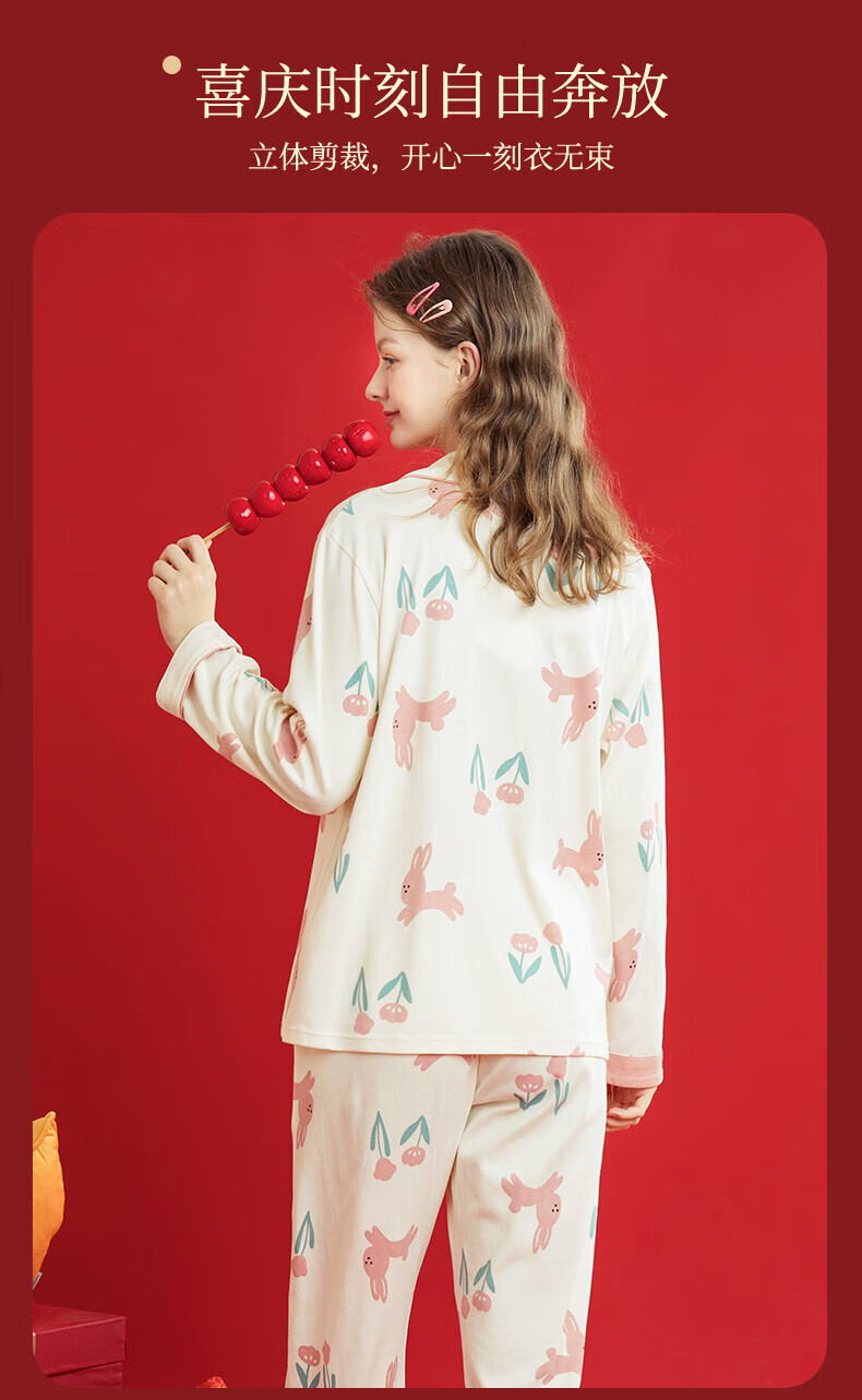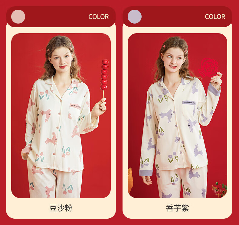 芬腾睡衣女翻领花卉宽松纯棉女棉家居服睡衣套装 豆沙粉 L