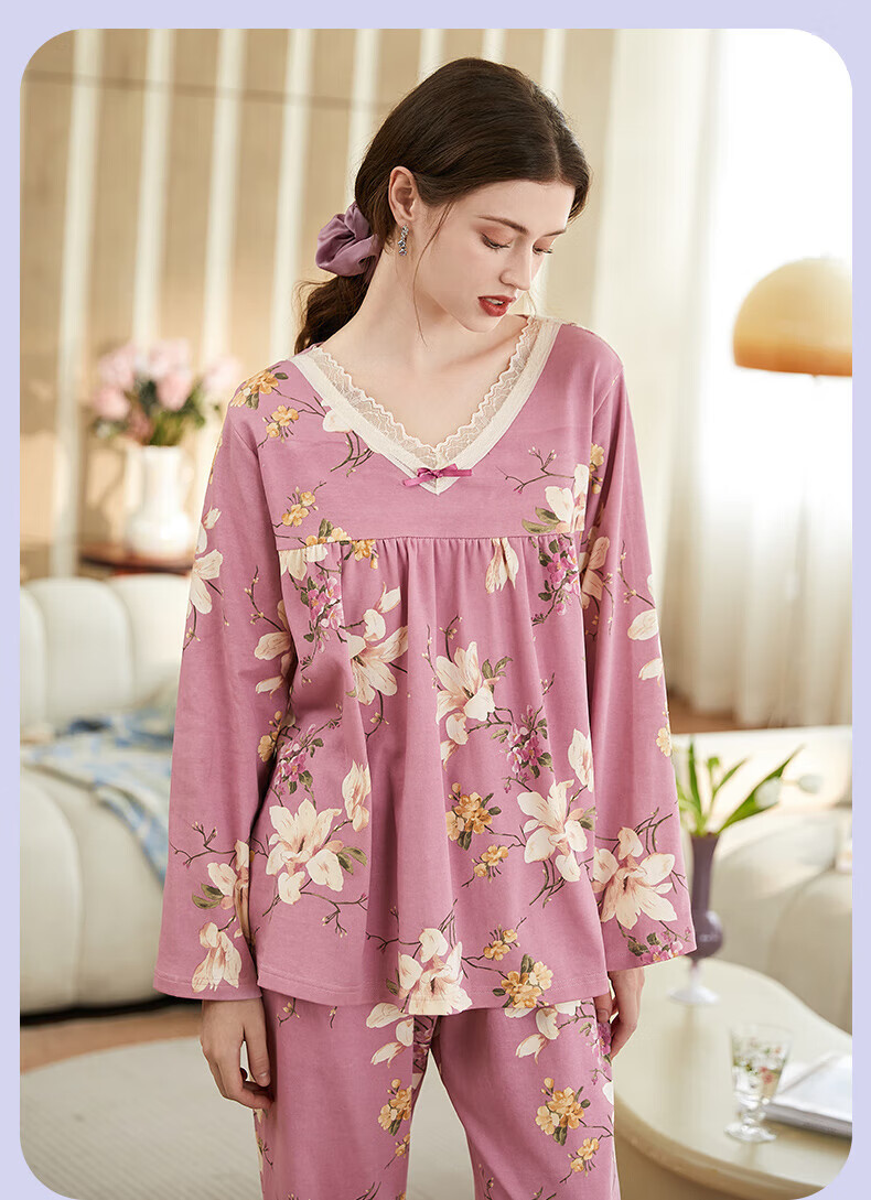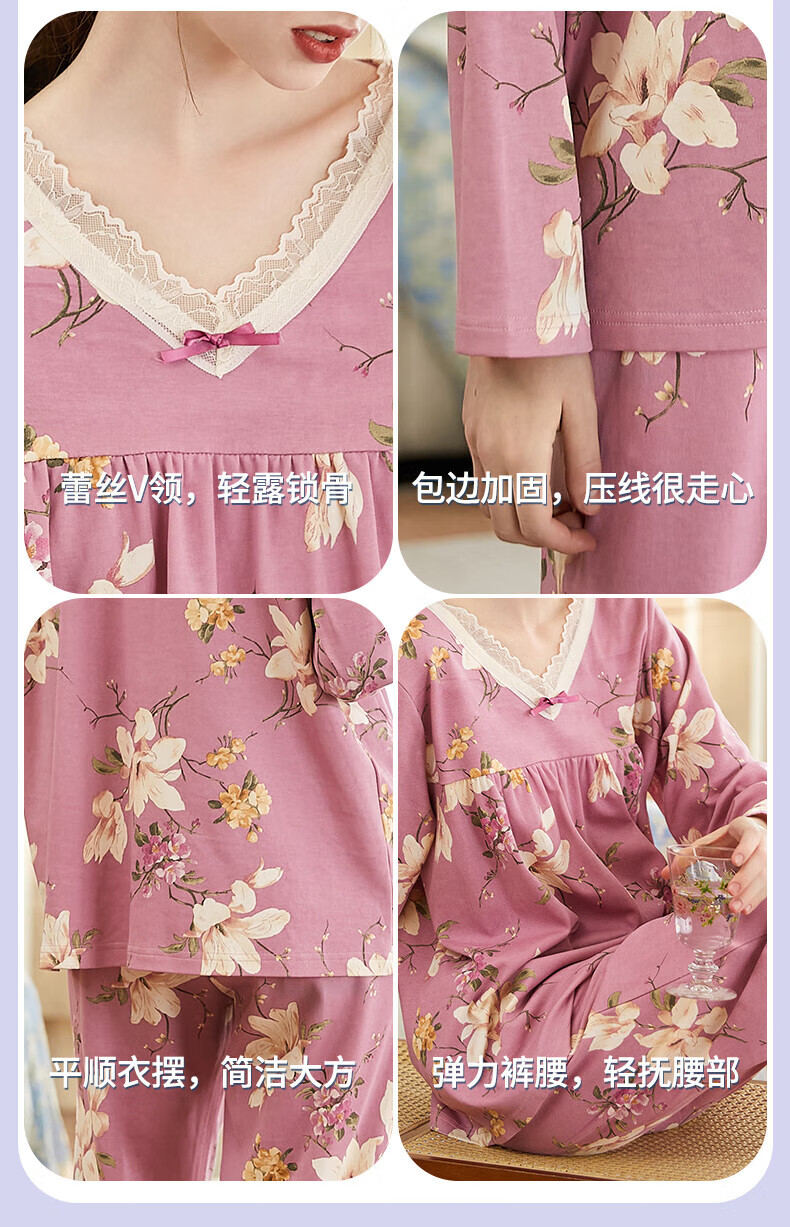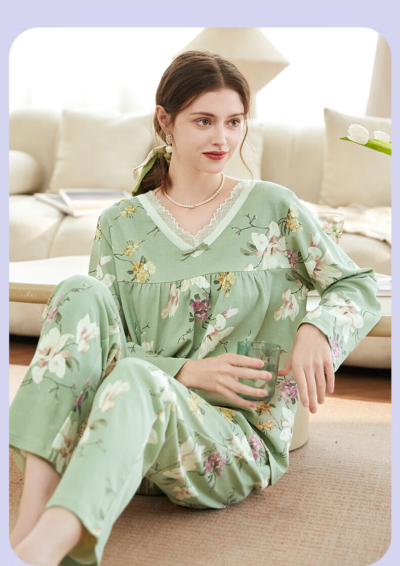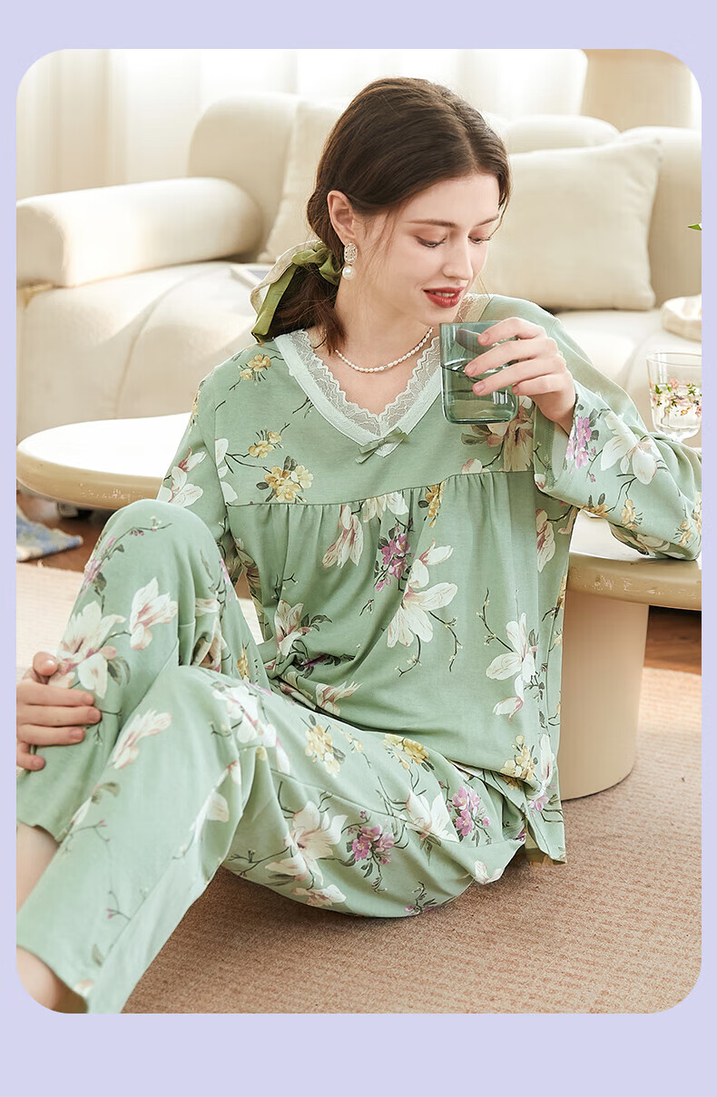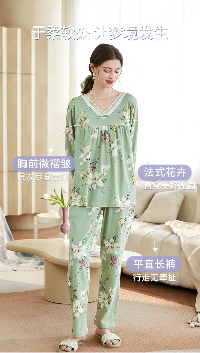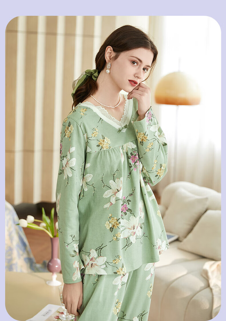 芬腾睡衣女早蕾丝V领法式优雅花卉睡衣套装纯棉棉家居服 草绿 S