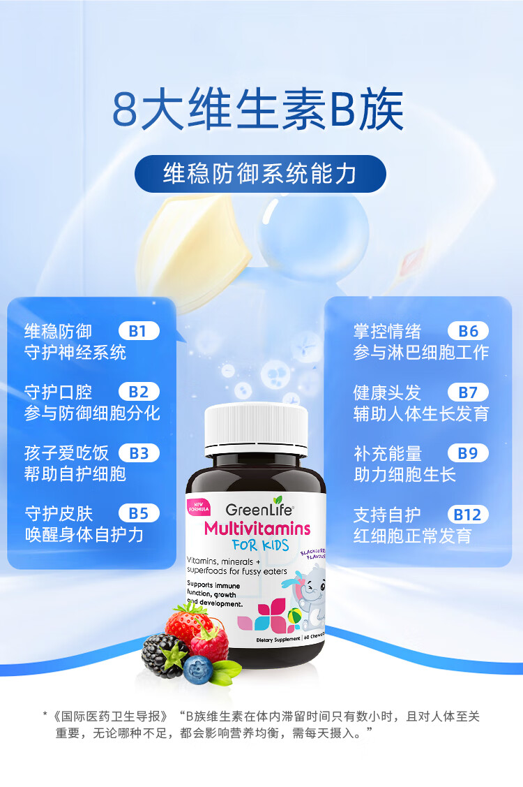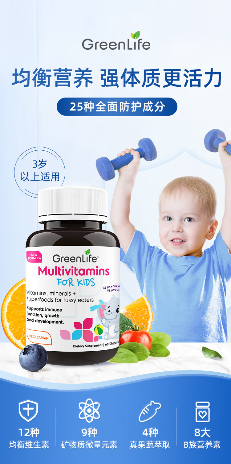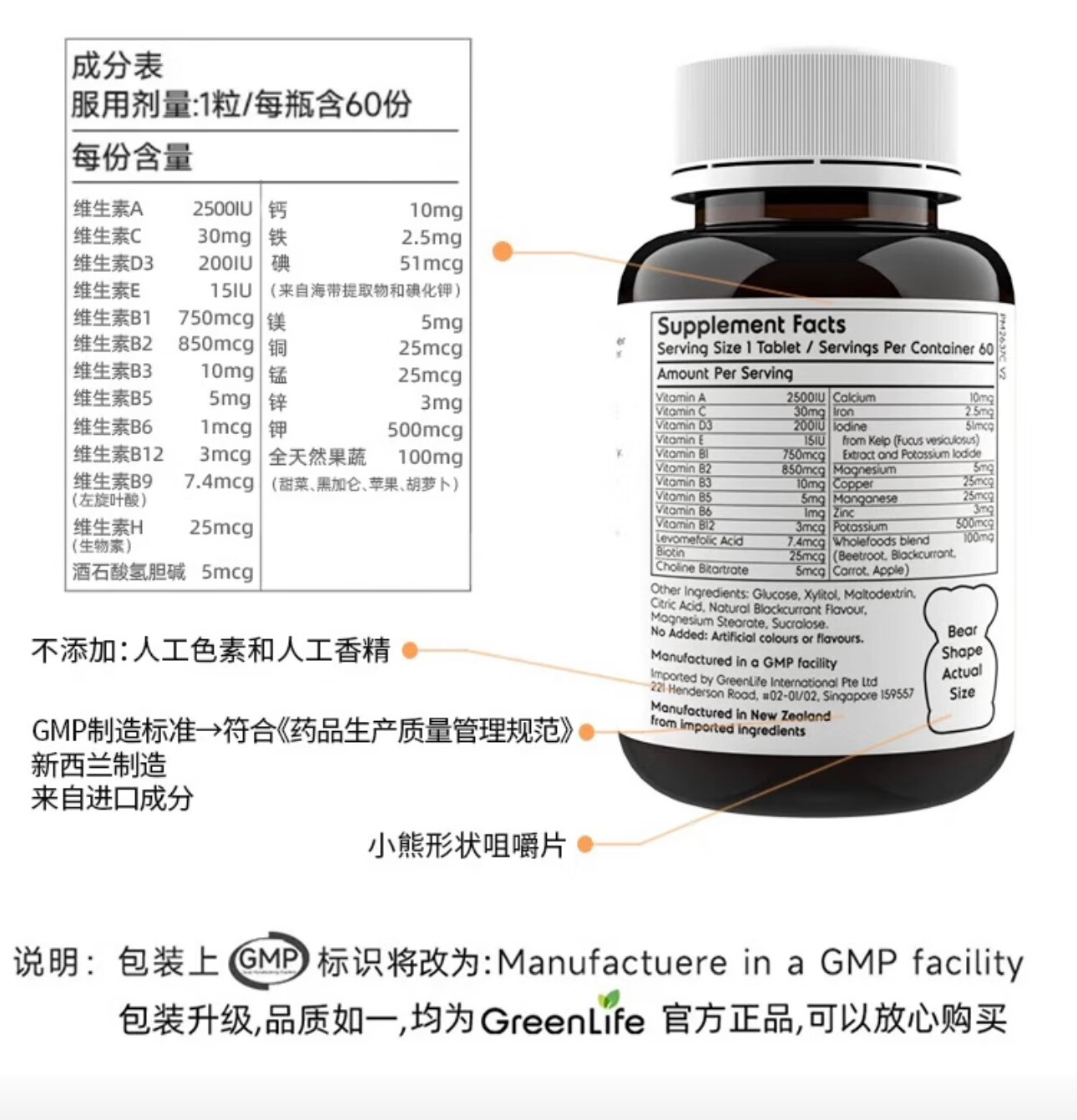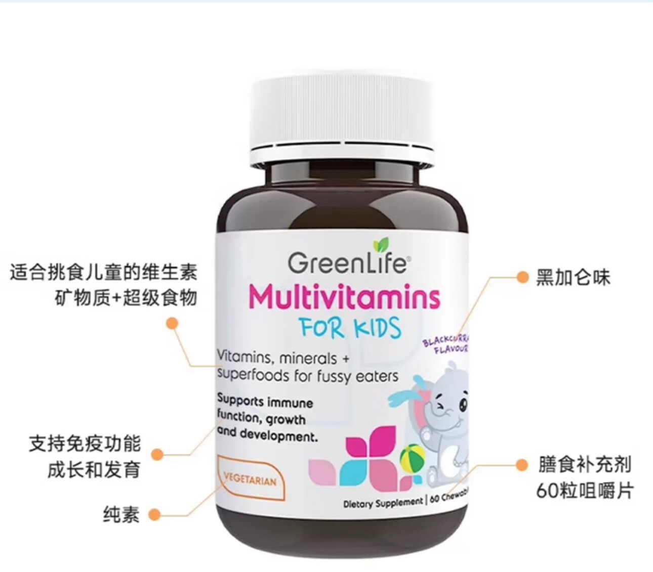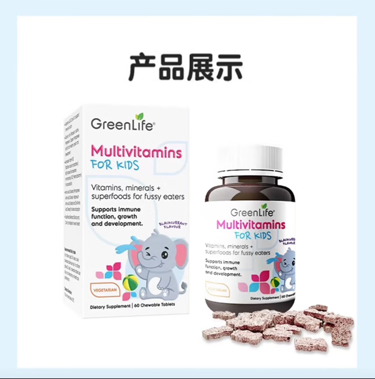 GreenLife儿童复合维生素C咀嚼片补铁补锌维生素B柠檬酸钙进口 3-17岁60粒 60粒/瓶