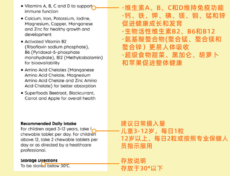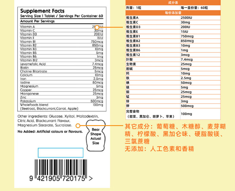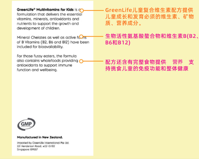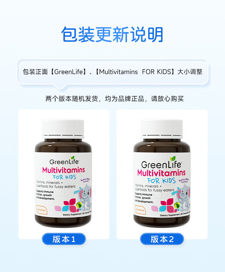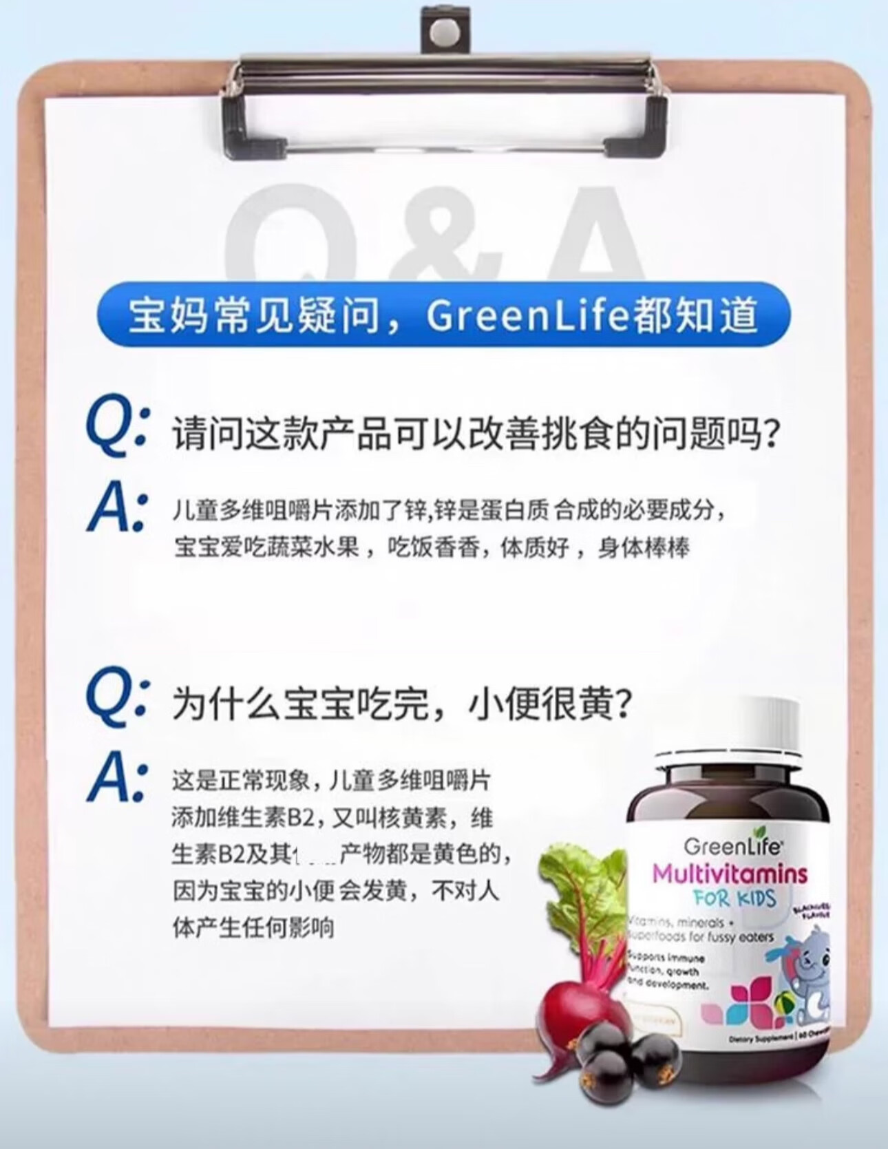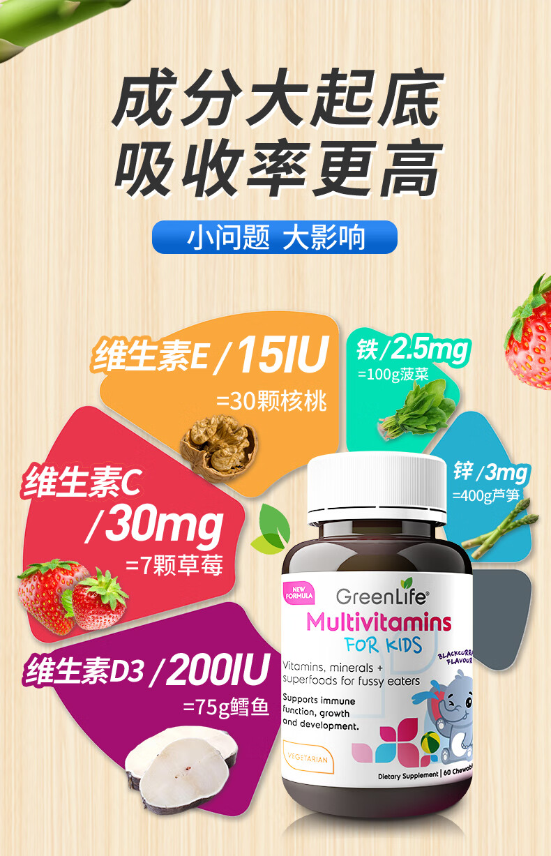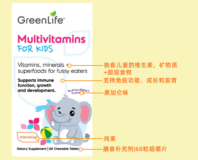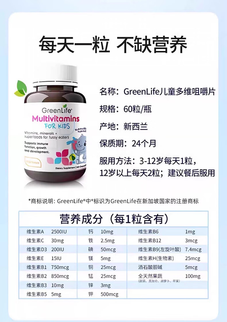 GreenLife儿童复合维生素C咀嚼片补铁补锌维生素B柠檬酸钙进口 3-17岁60粒 60粒/瓶