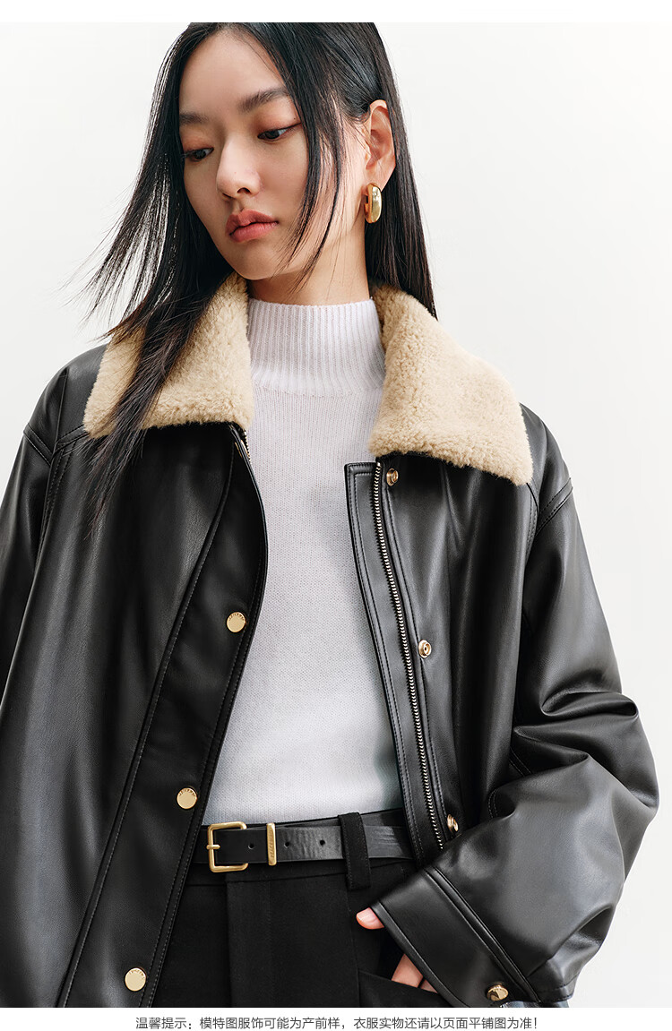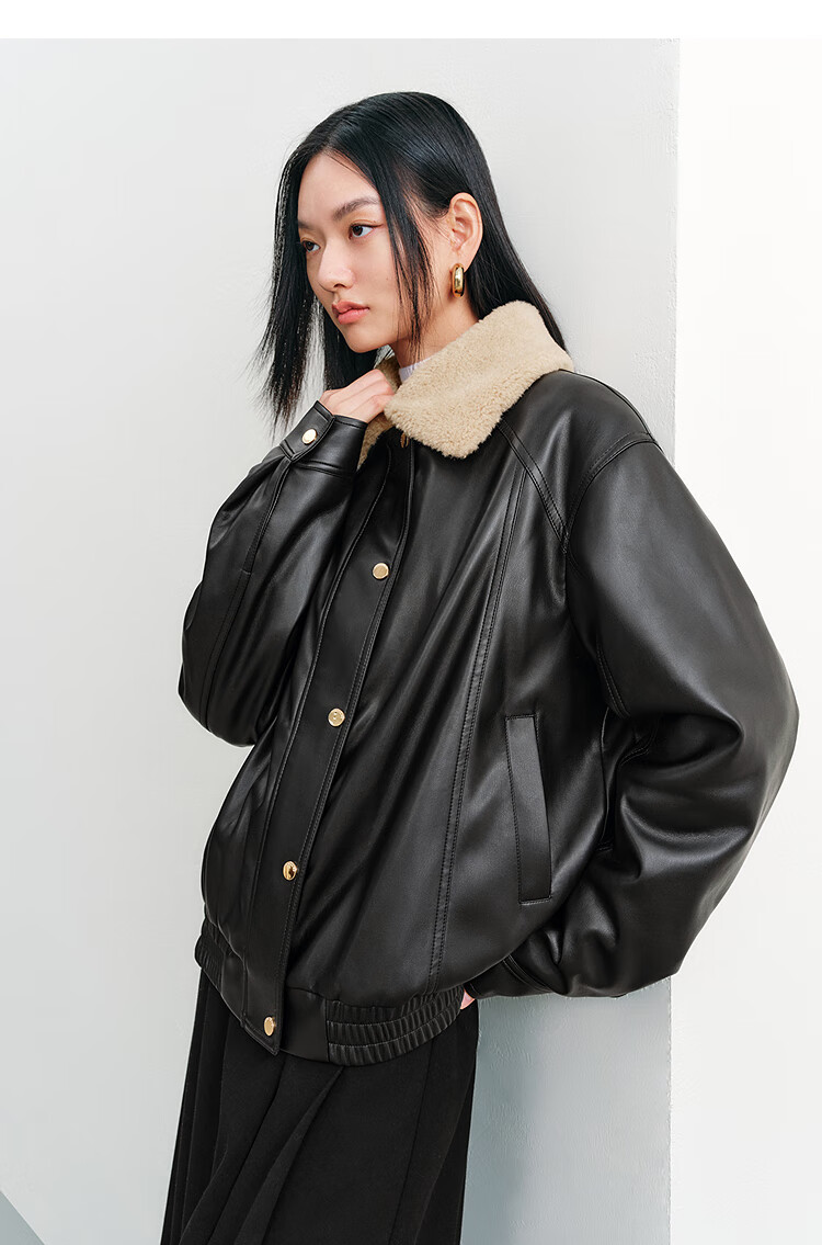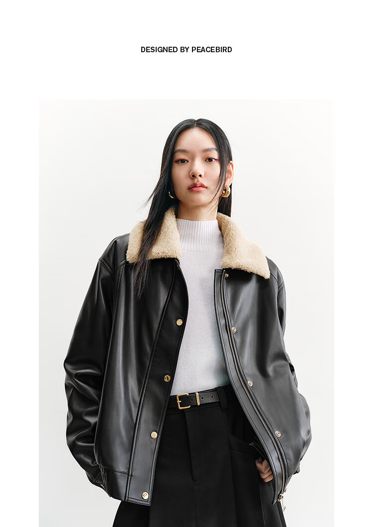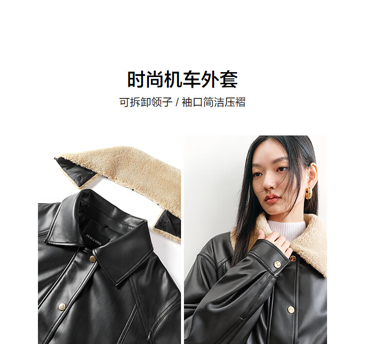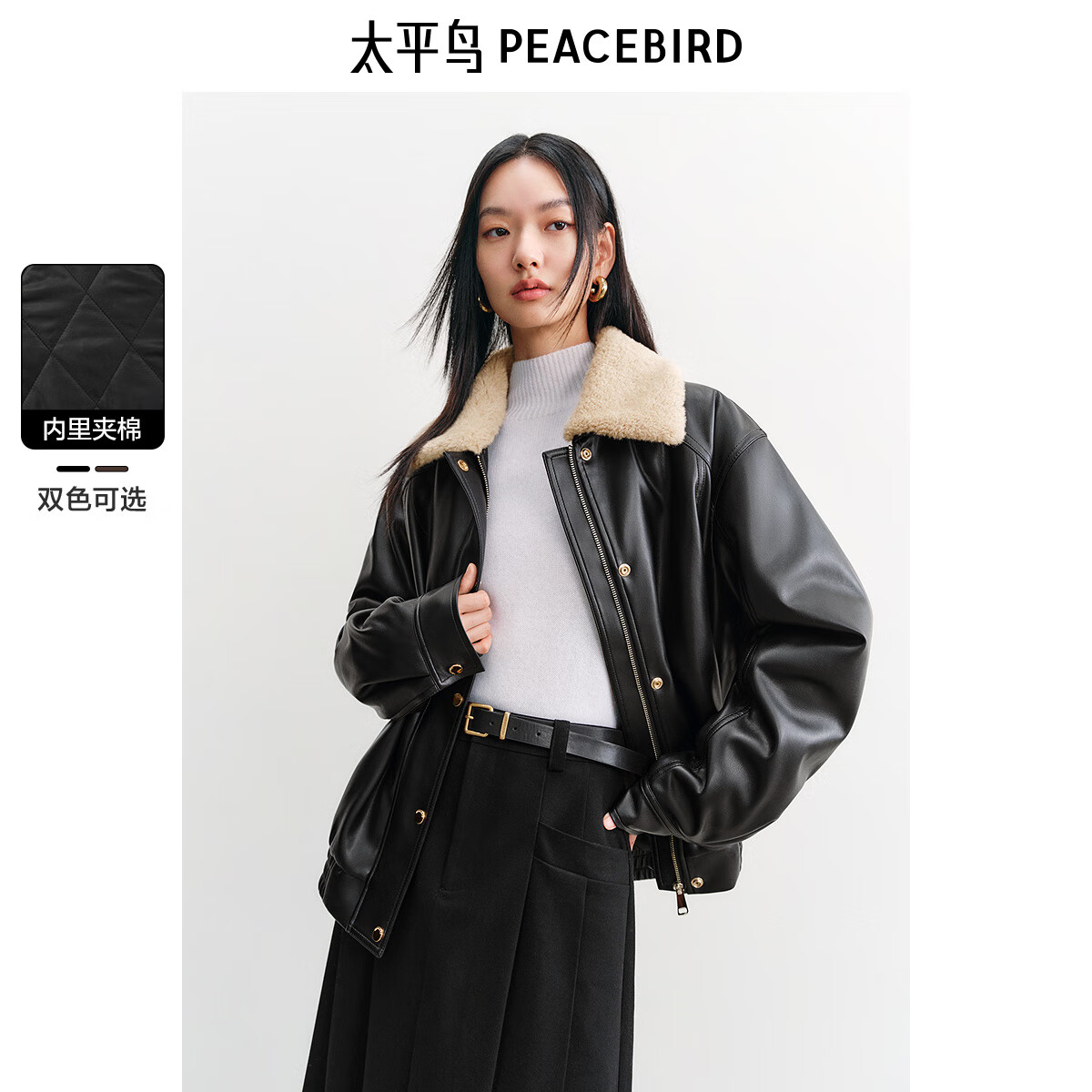 太平鸟女装短外套时髦PU皮机车风女冬装时尚衣服夹棉夹克 黑色 S