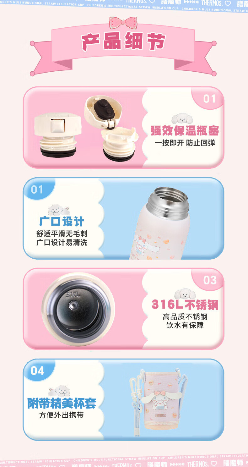 膳魔师(THERMOS)儿童保温杯三丽鸥316L不锈钢大容量多功能吸管直饮学生杯上学TCKA