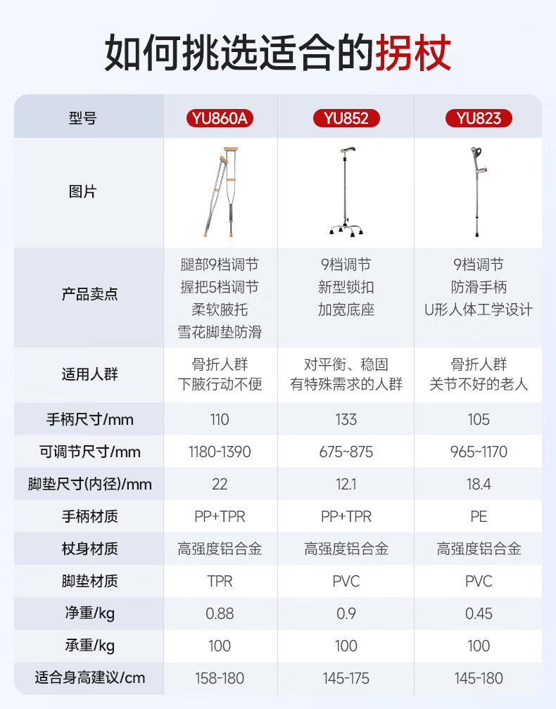 鱼跃(Yuwell)老人拐杖YU852助行器手杖 铝合金可伸缩拐棍 四脚防滑稳定舒心