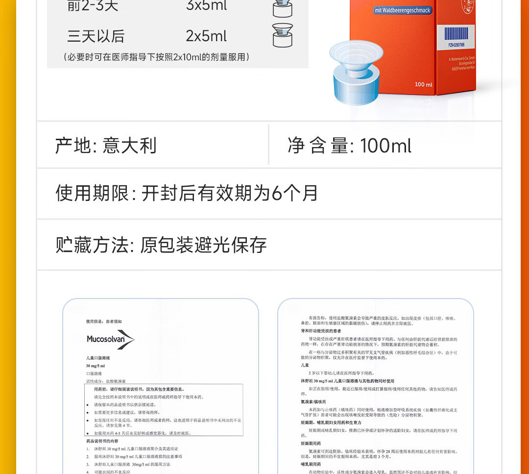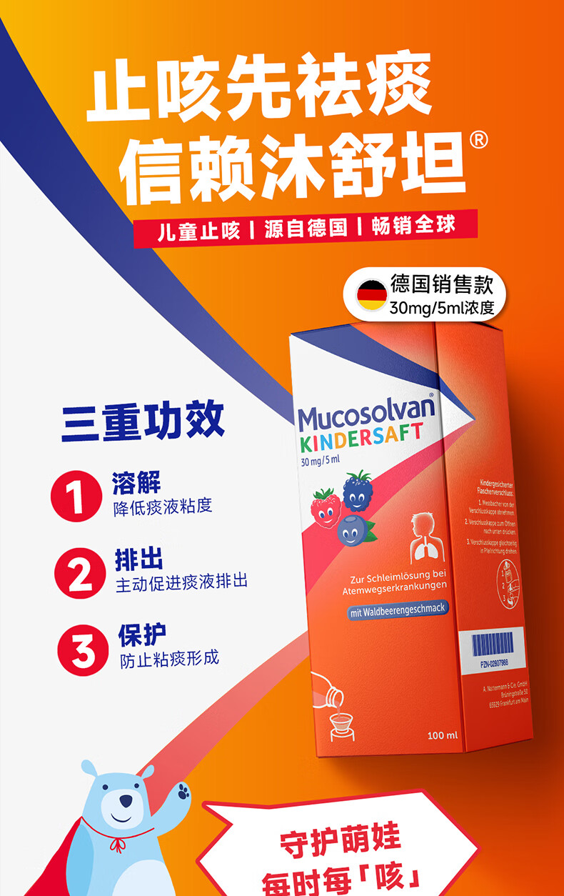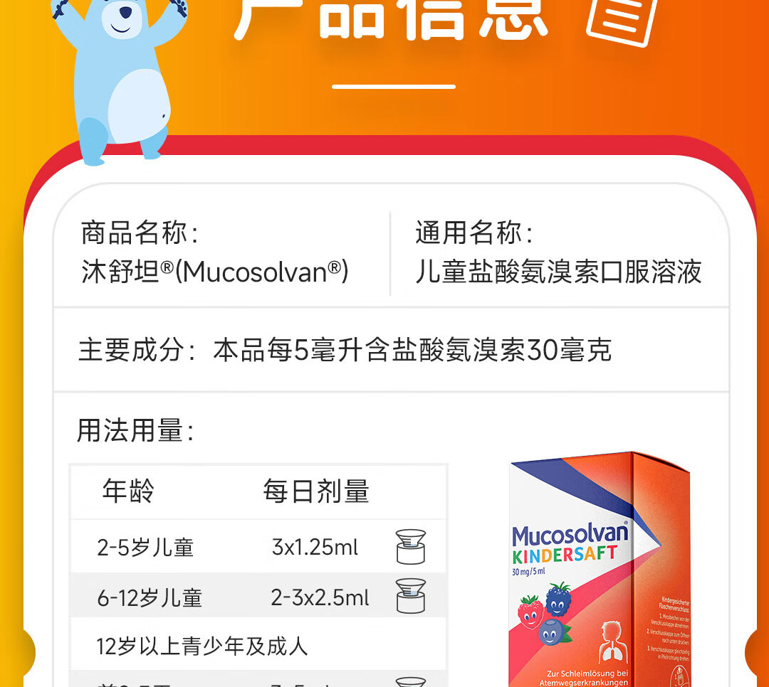 【原研进口】沐舒坦德国原装进口原研盐酸氨溴索化痰清肺感冒咳嗽祛痰止咳儿童糖浆口服液100ml