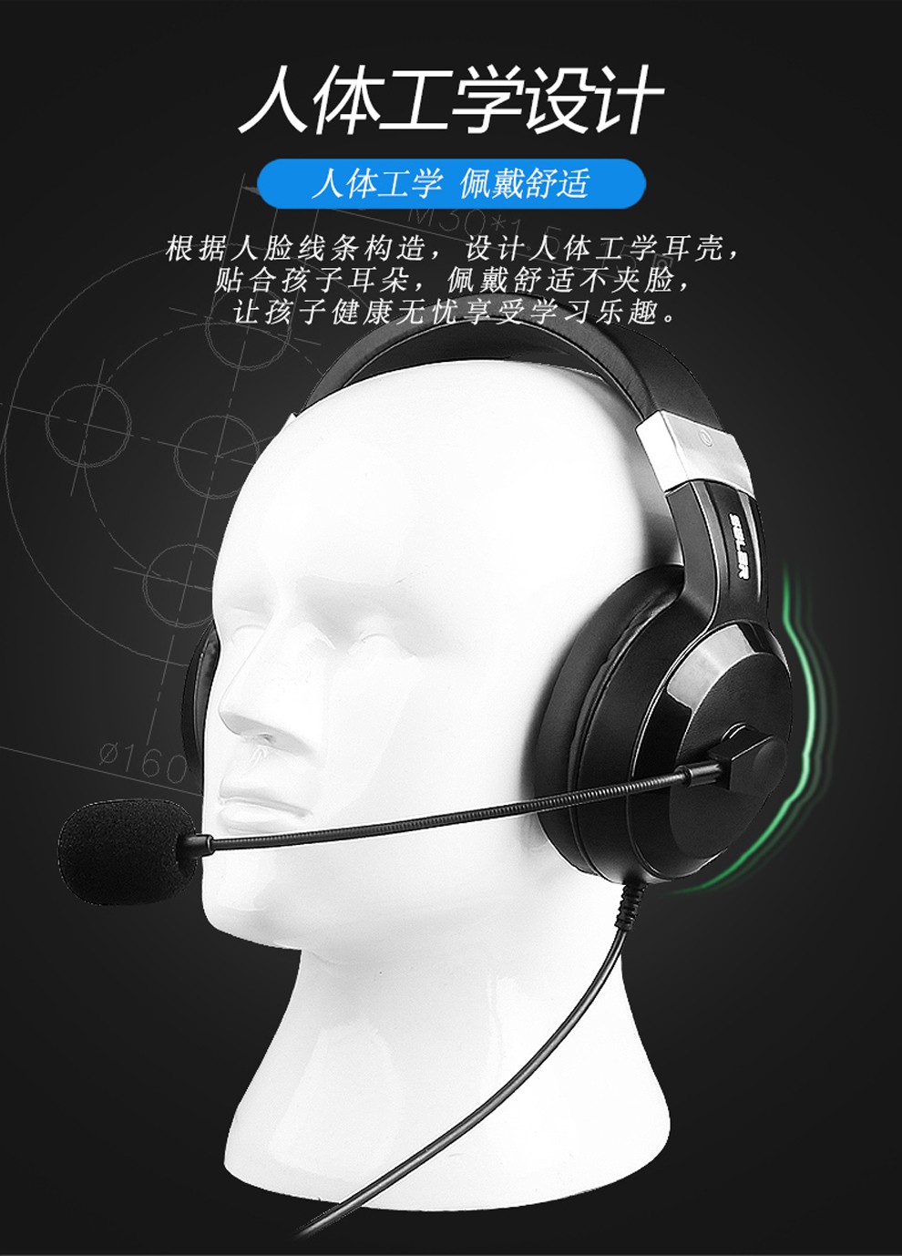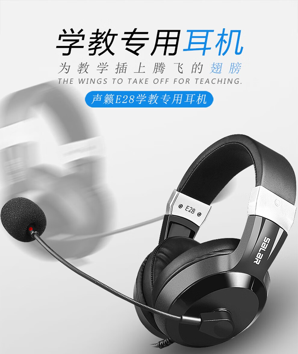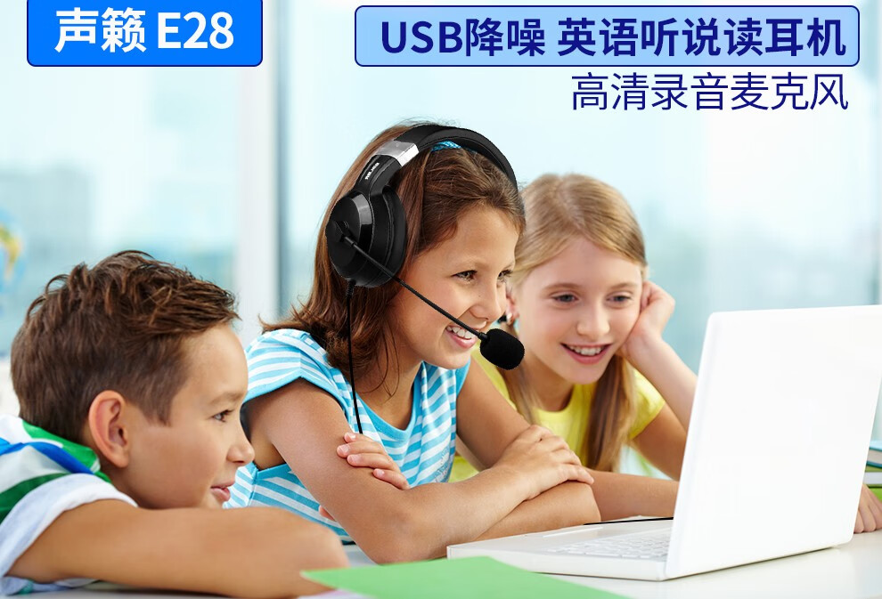 声籁 E28 USB接口头戴式电脑有线耳机 学英语口语听力听说考试 带麦克风跟读网课口语学习带声卡耳麦 USB插头降噪-高清麦-听说考试