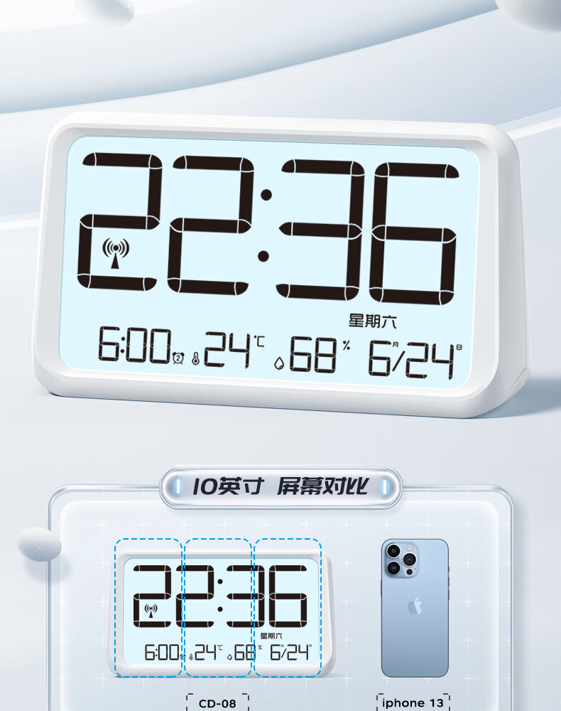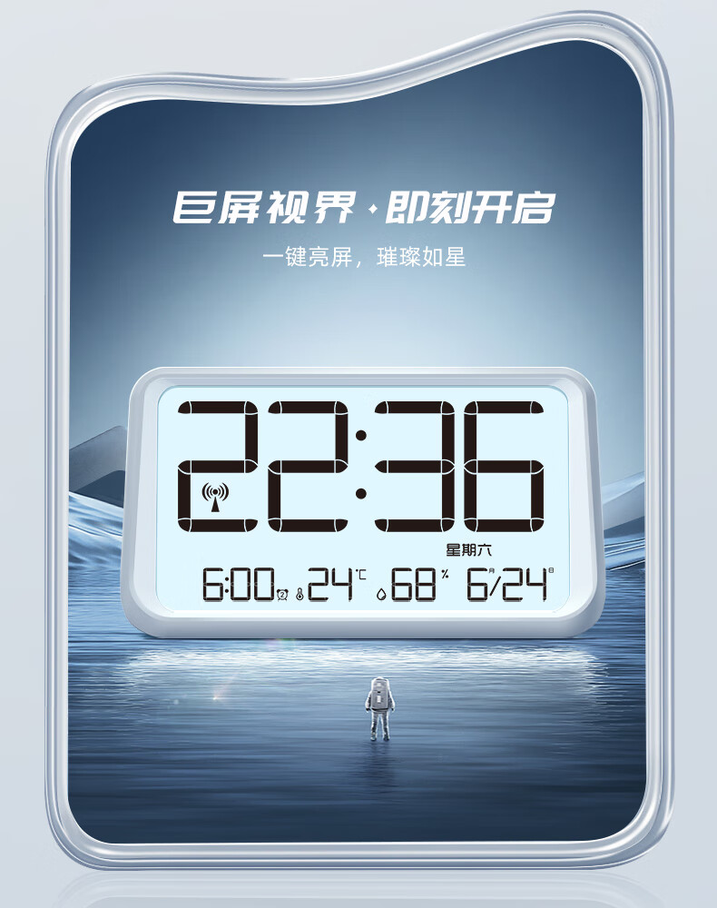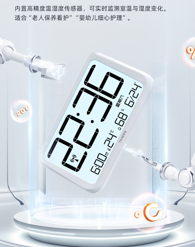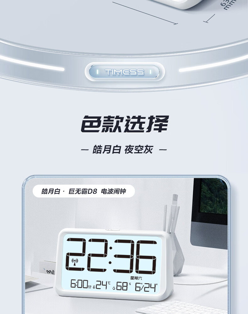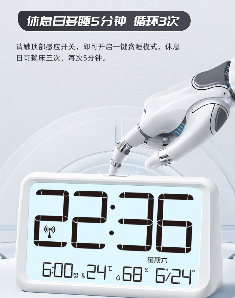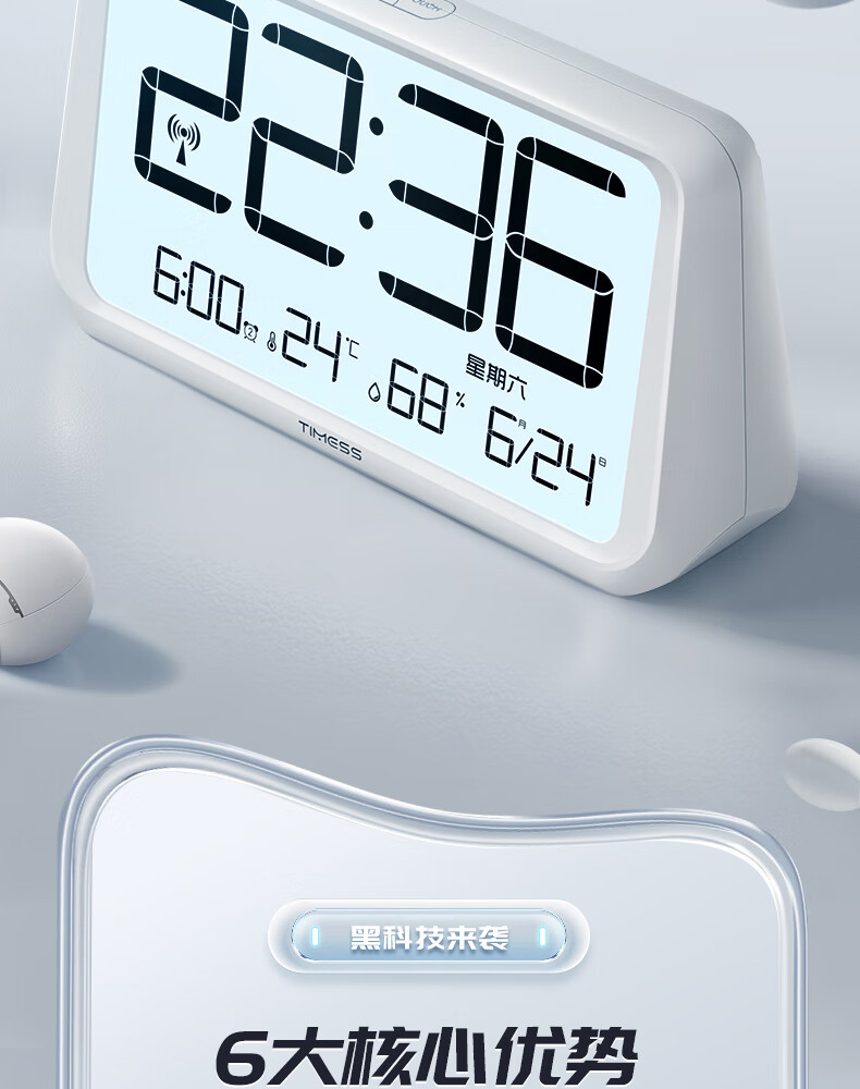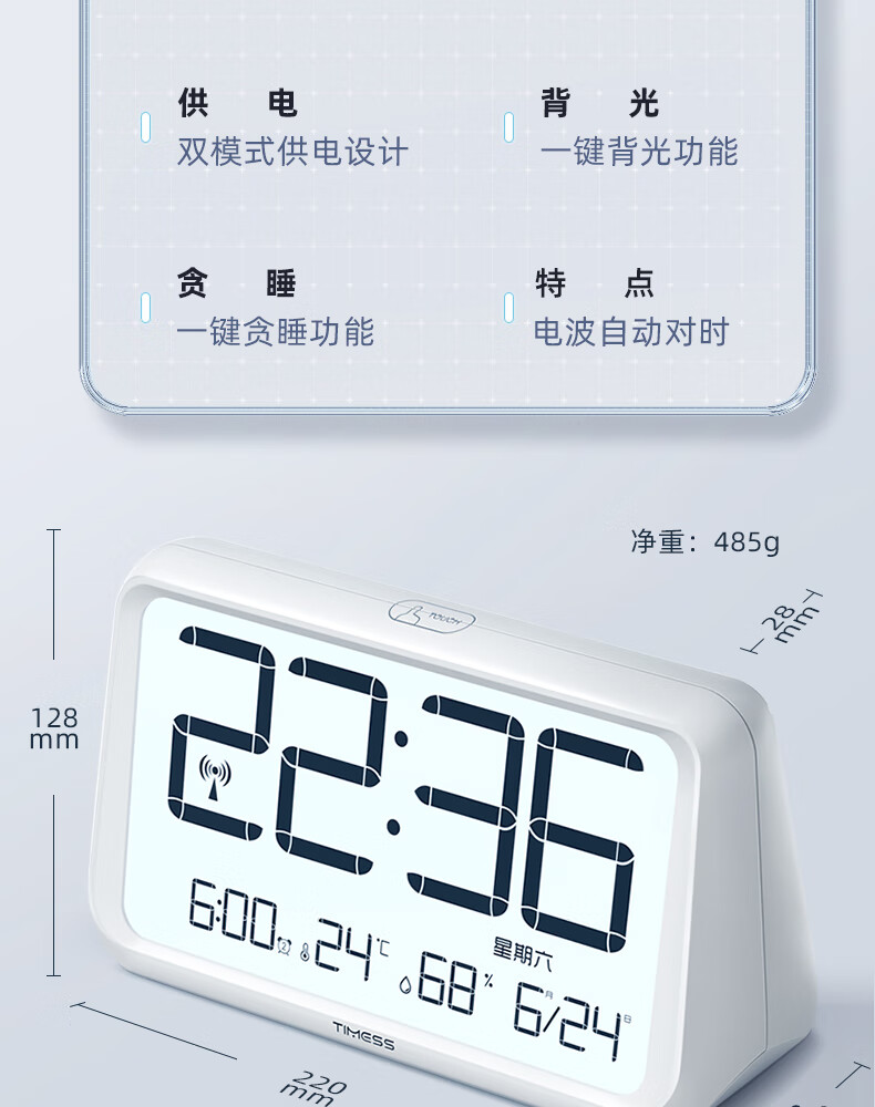 Timess电波自动对时超大屏智能温湿度闹钟儿童学生专用起床神器背光贪睡时钟大音量床头钟开学季礼物22cm