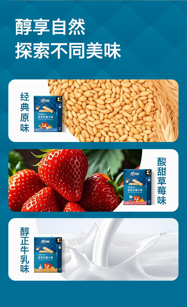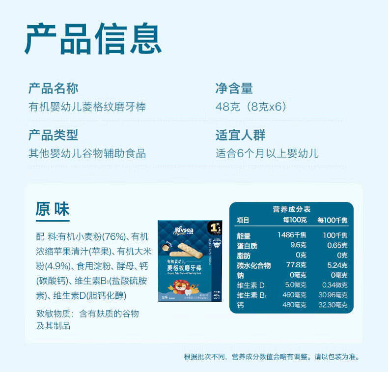 禾泱泱有机婴幼儿菱格纹磨牙棒原味 初尝高钙宝宝零食48g 6月+