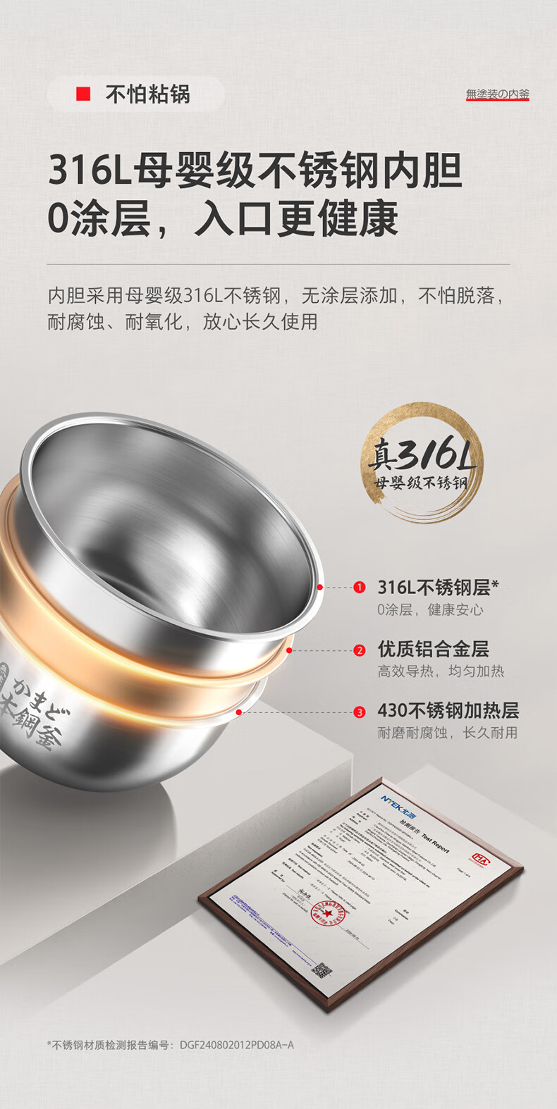 美的(Midea)低糖电饭煲电饭锅0涂层3升2-3人无涂层316L不锈钢内胆一键柴火饭微压家用多功能MB-3E91LS