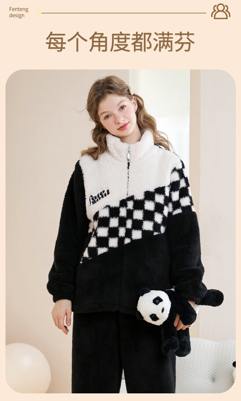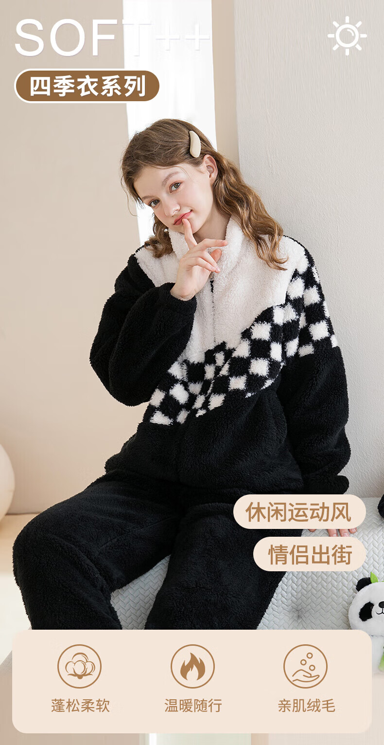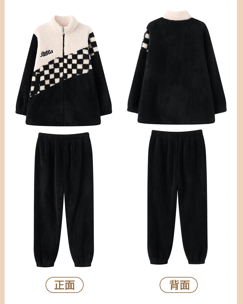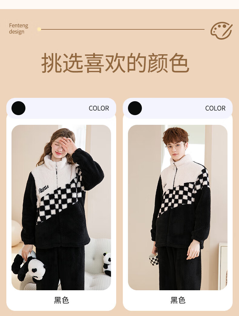 芬腾情侣睡衣秋冬立领拉链长袖开衫暖绒家居服情侣睡衣套装 黑色(女款) M