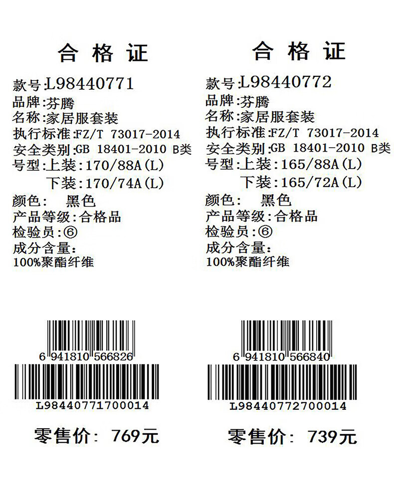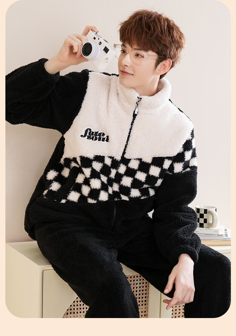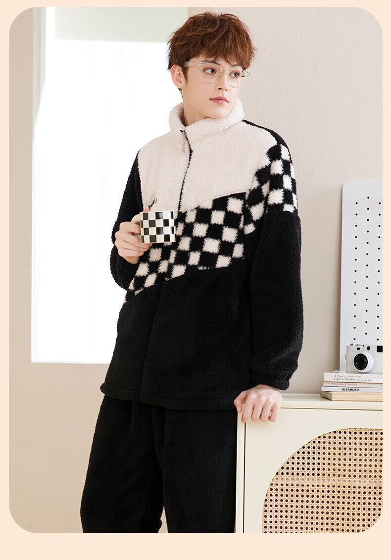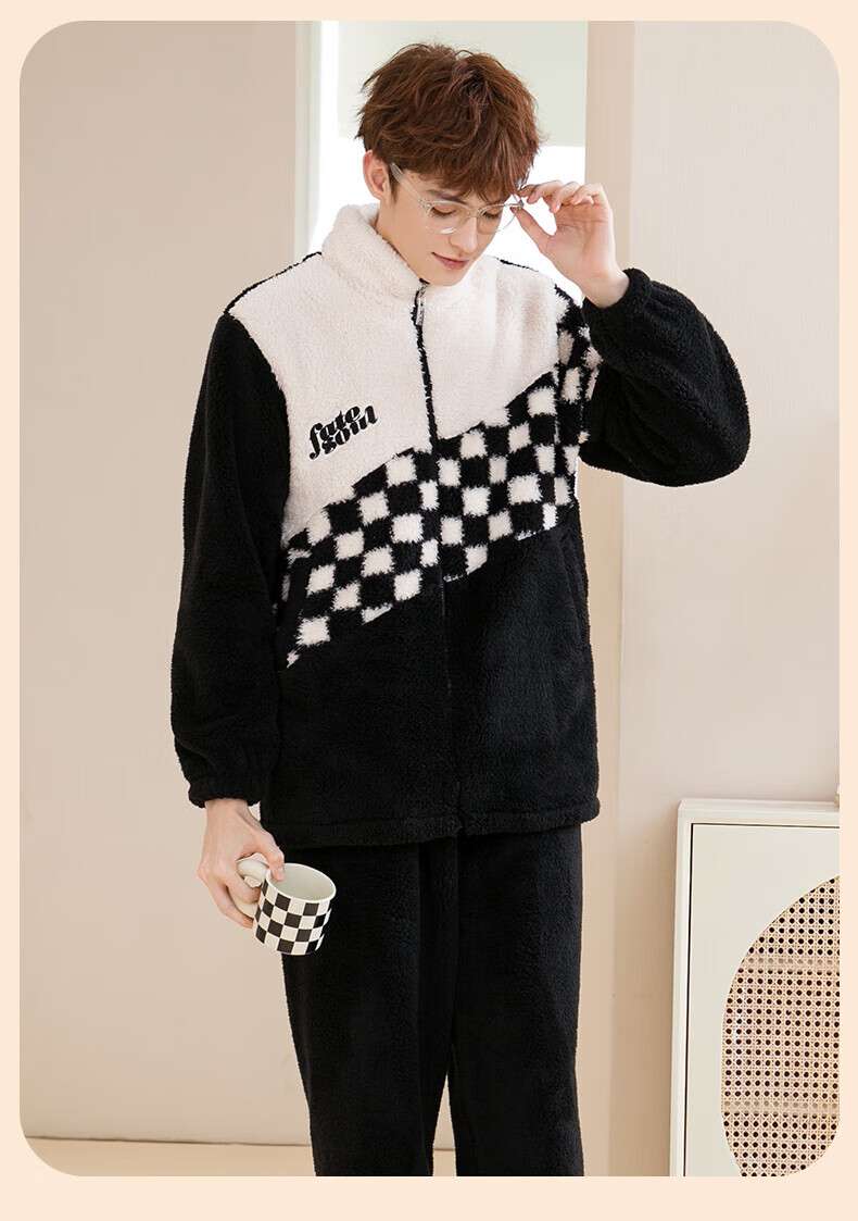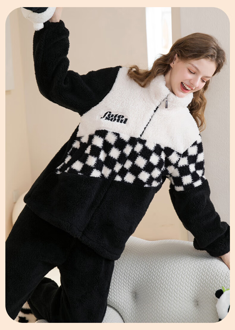 芬腾情侣睡衣秋冬立领拉链长袖开衫暖绒家居服情侣睡衣套装 黑色(女款) M