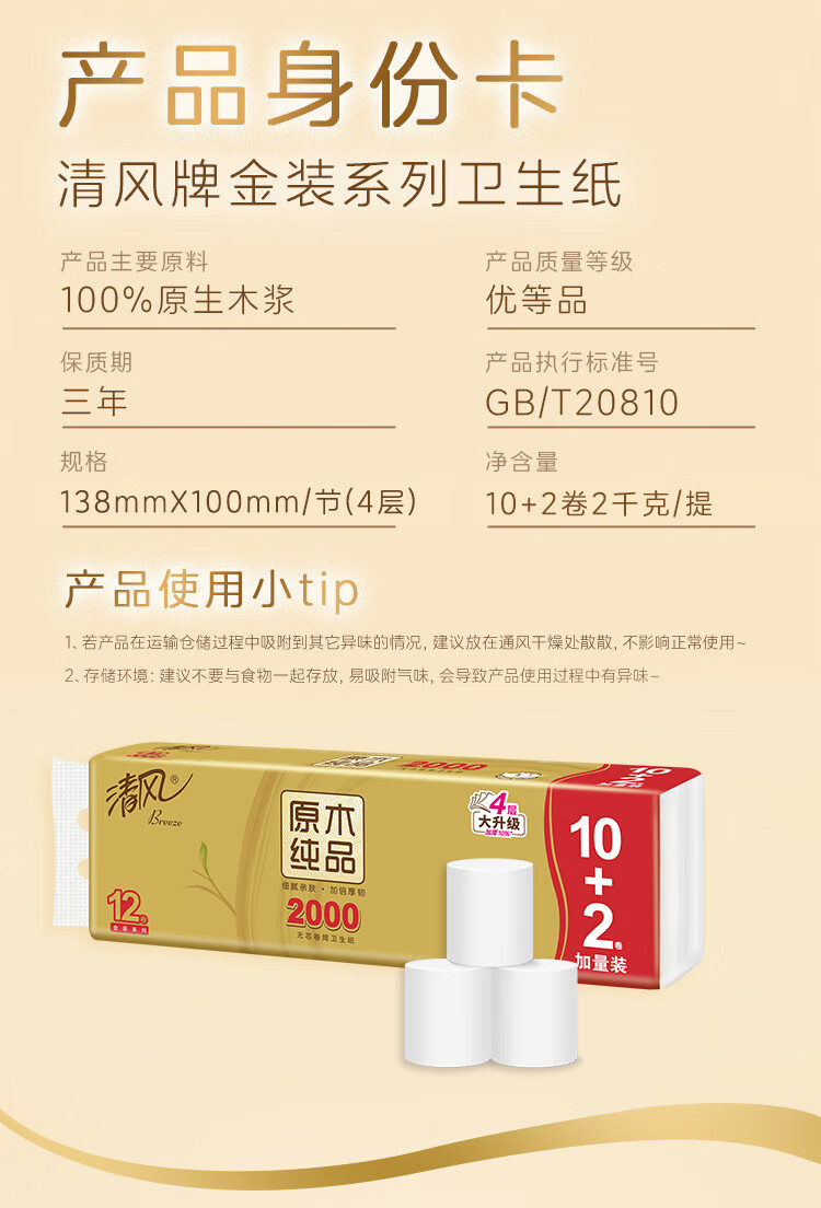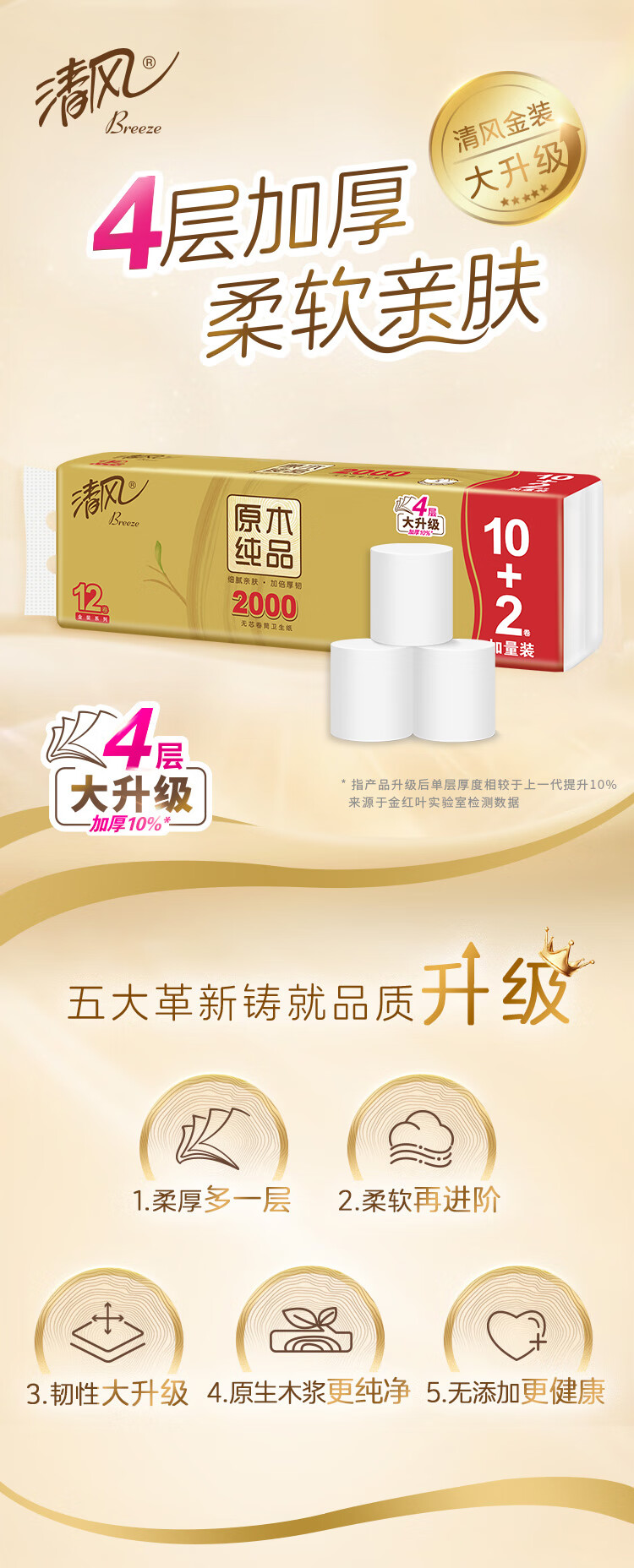 清风【李昀锐同款】无芯卷纸 原木金装4层加厚2000克/12卷 卫生纸