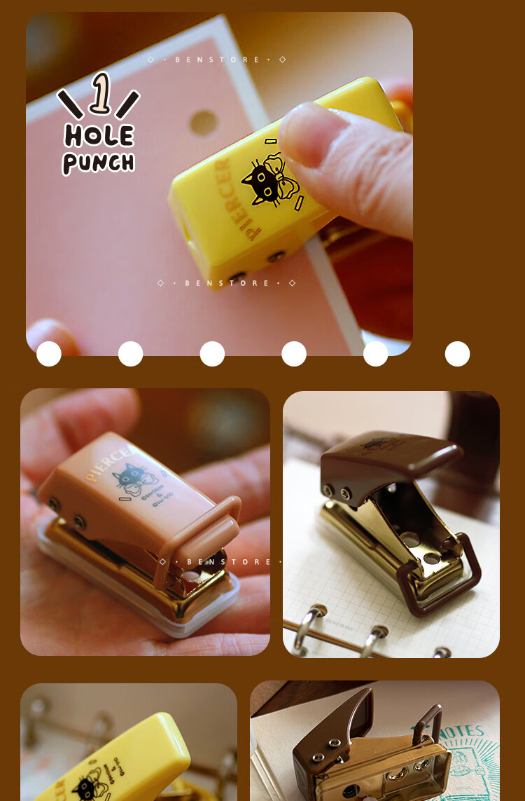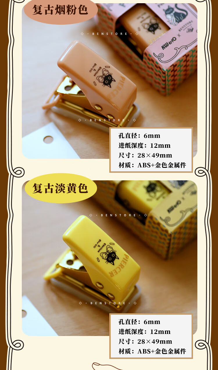 可得优本子事多单孔打孔器限定复古色mini圆孔卡通猫咪图案DIY手工打孔机可打6张 复古淡黄色