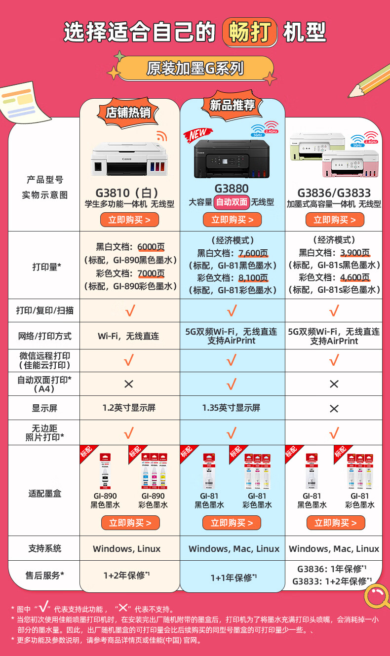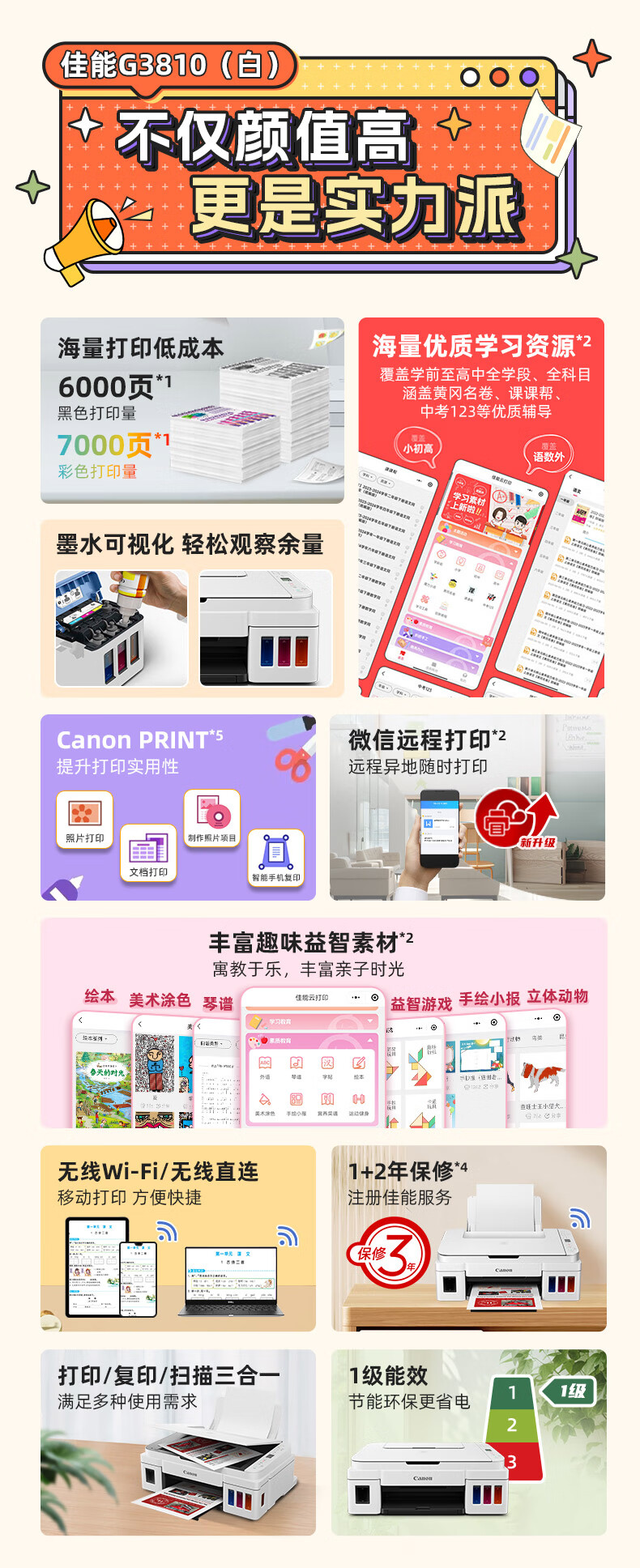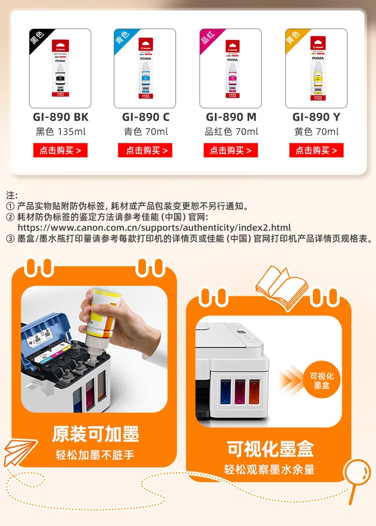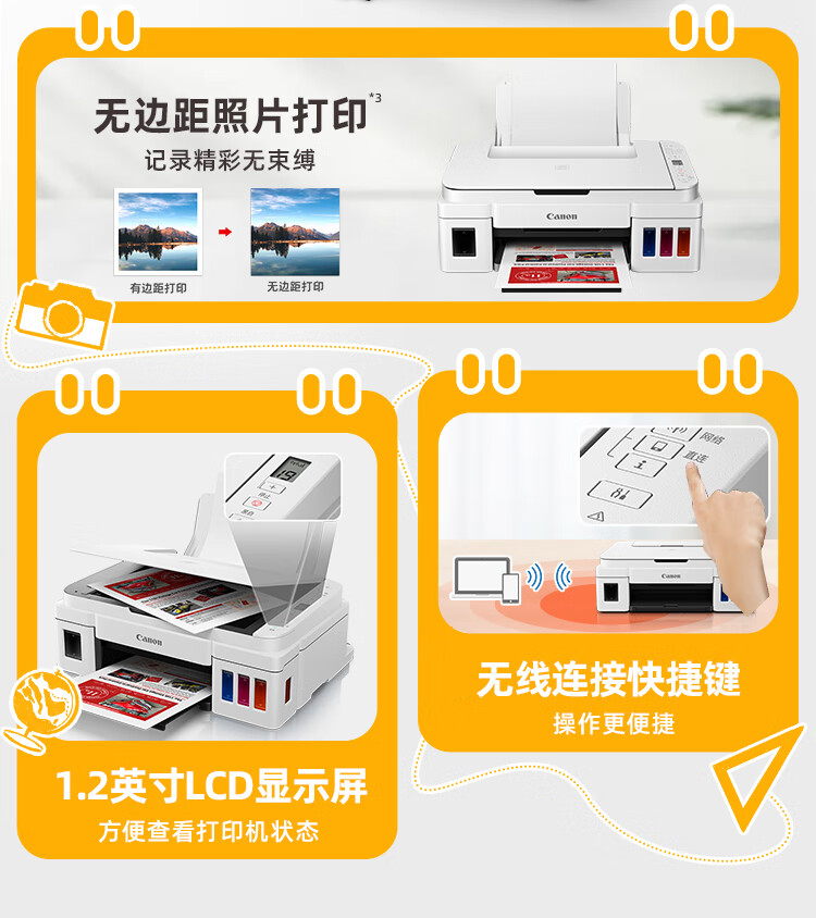 佳能(Canon)G3810大容量可加墨打印机打印复印扫描一体机家用家庭学生作业办公彩色喷墨墨仓式手机无线连接 【G3810 白】3in1-无线打印-7000页 官方标配