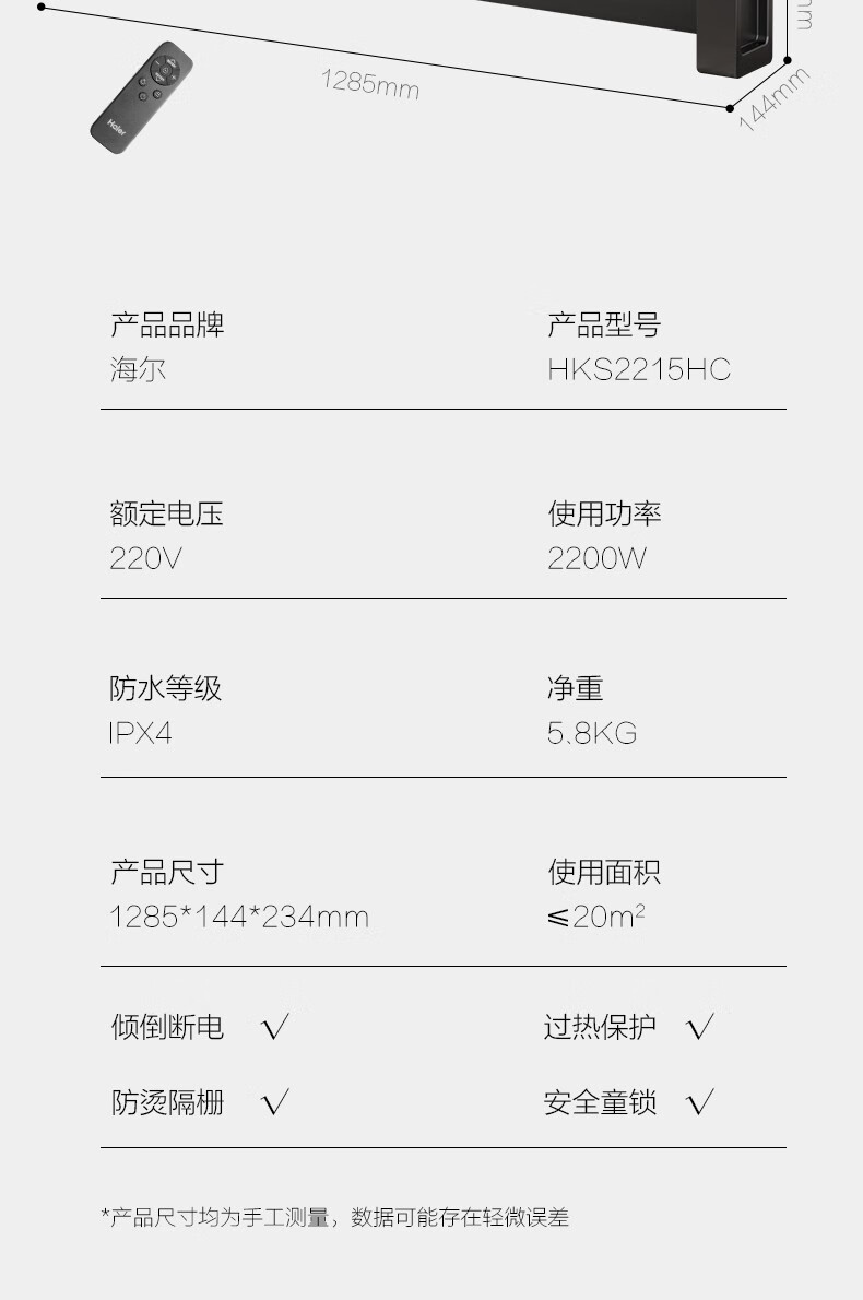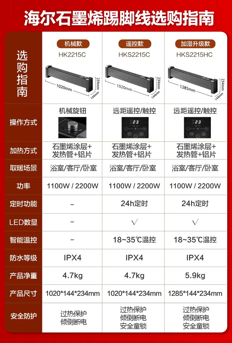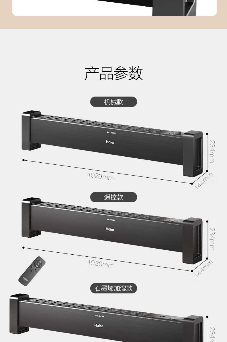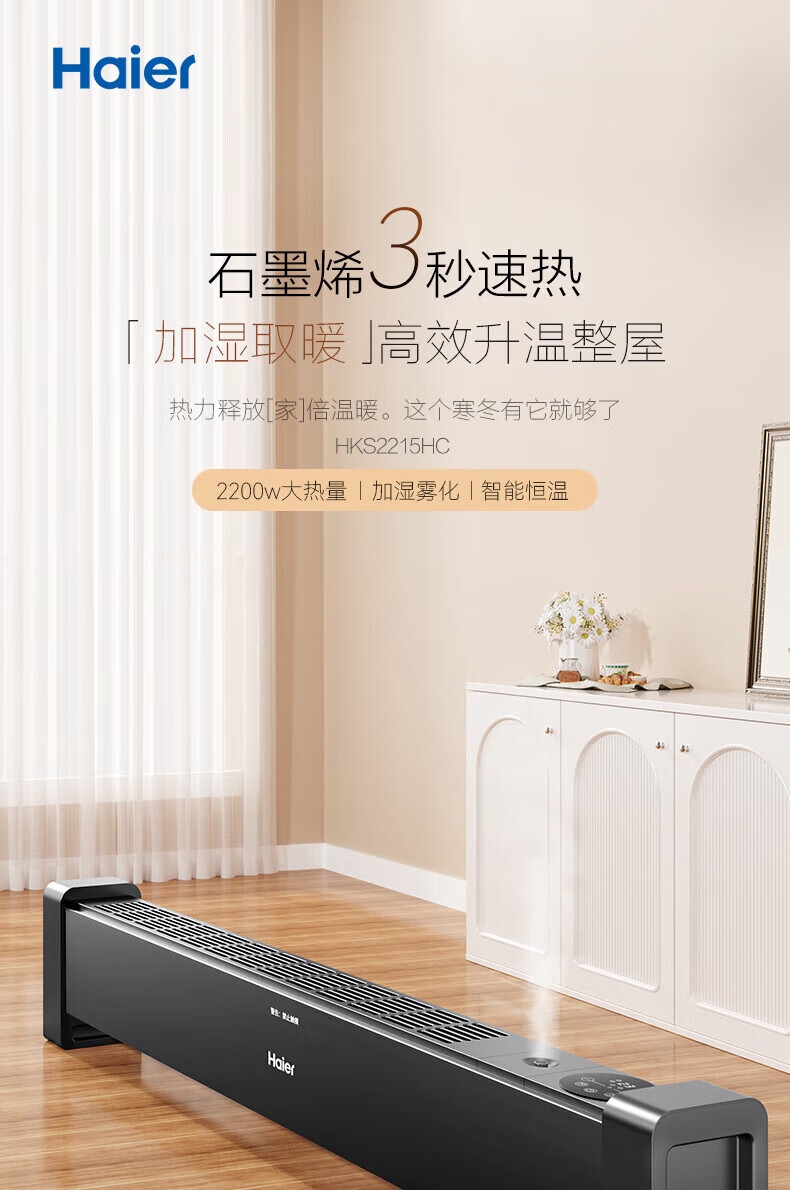海尔(Haier)石墨烯踢脚线取暖器家用电暖器电暖气片节能取暖神器遥控加湿4级防水浴室干衣速热移动地暖烤火炉 【石墨烯速热-恒温遥控款】HKS2215C
