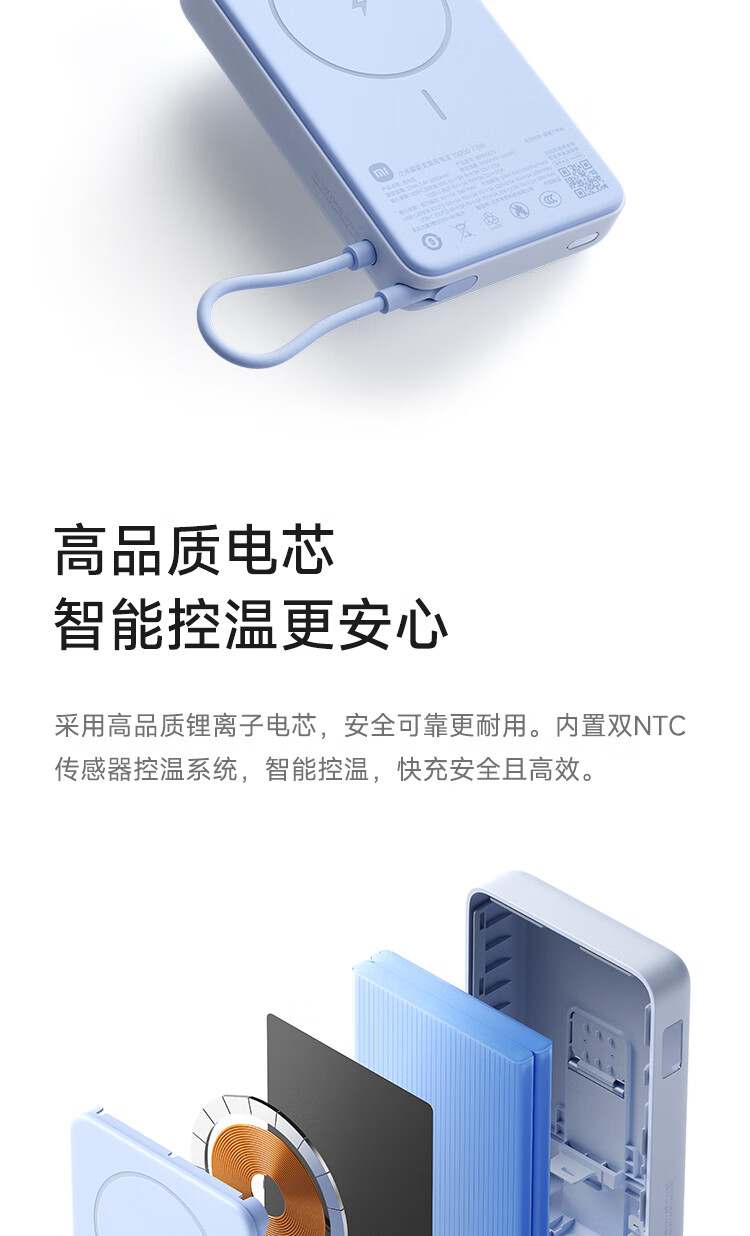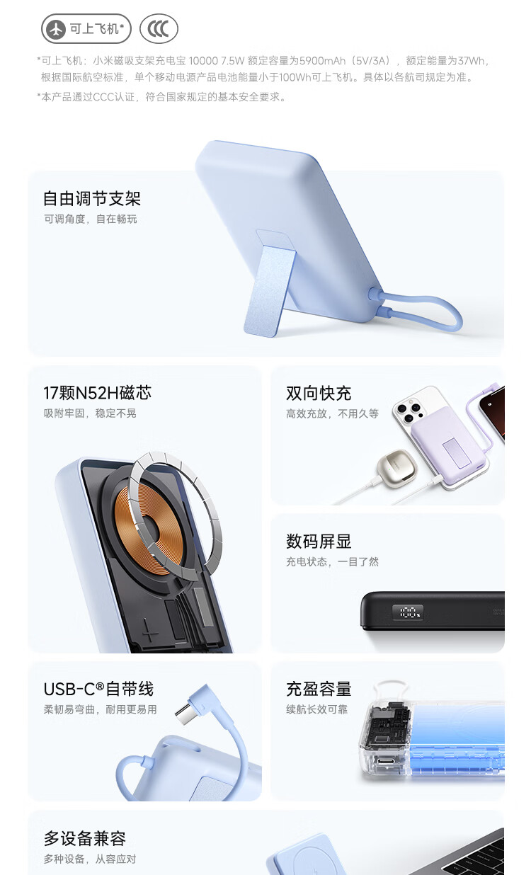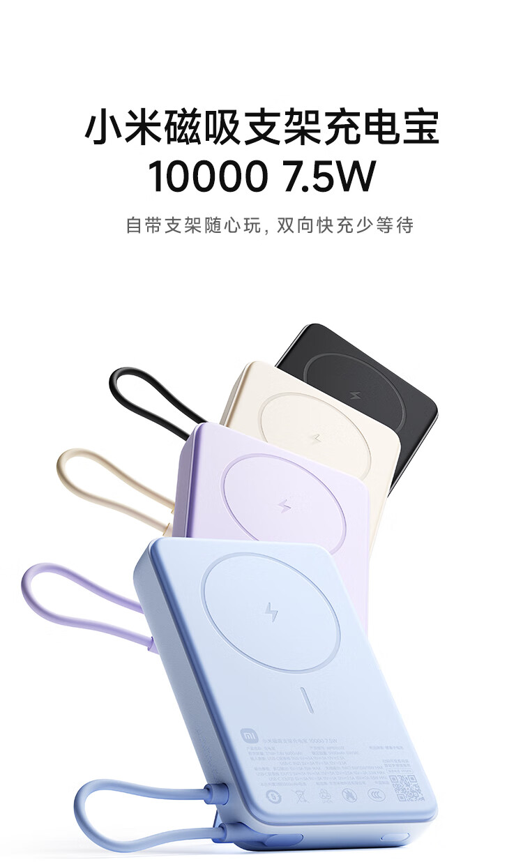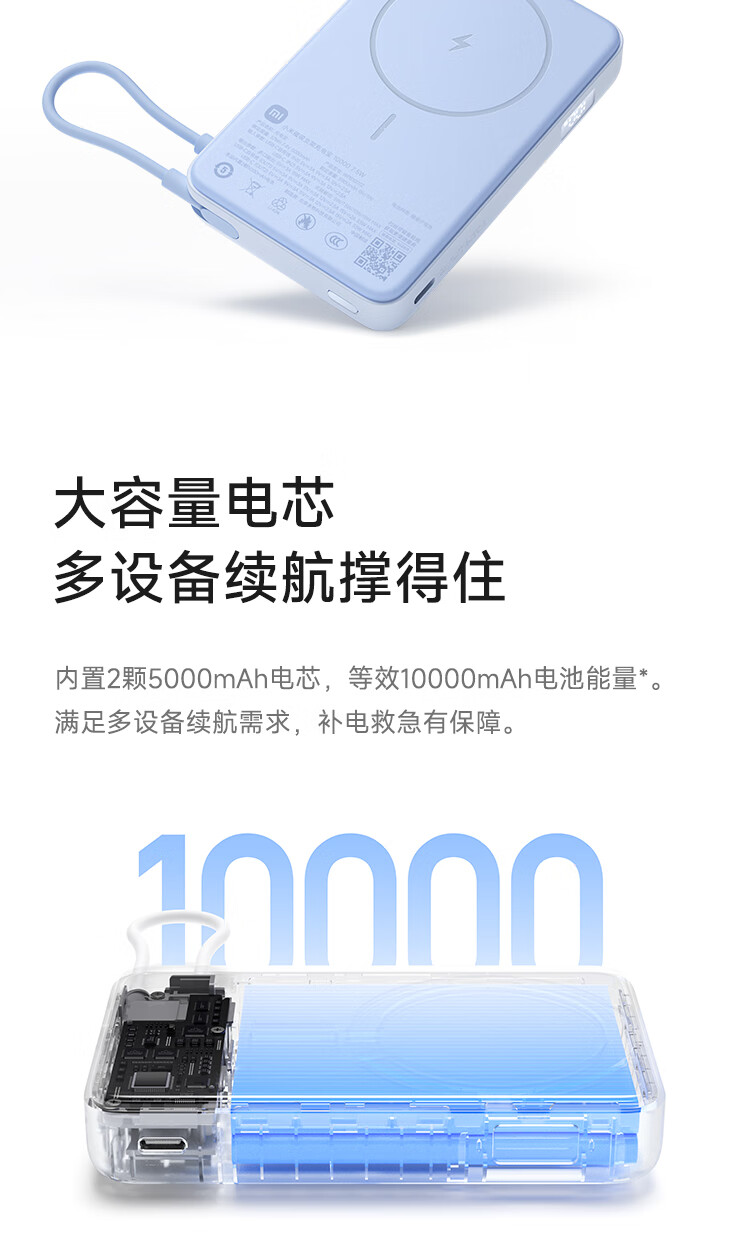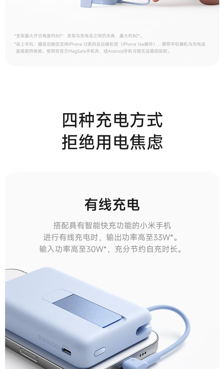 小米(MI)【3C认证】磁吸支架充电宝 10000 7.5W 浅蓝色 可上飞机 有线33W快充 iPhone安卓可用