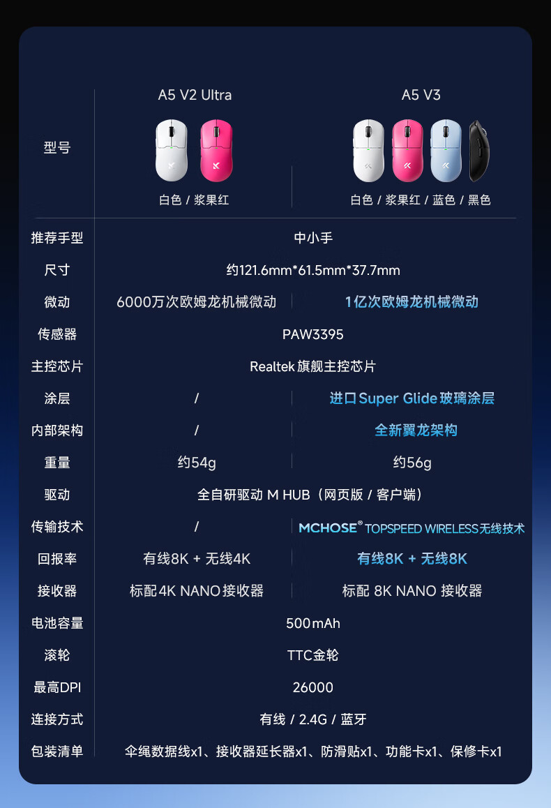 迈从(MCHOSE)A5 V3/V2 Ultra无线鼠标 游戏鼠标 有线/2.4G/蓝牙三模 电竞可充电长续航PAW3395轻量化设计 A5 V2 Ultra 浆果红