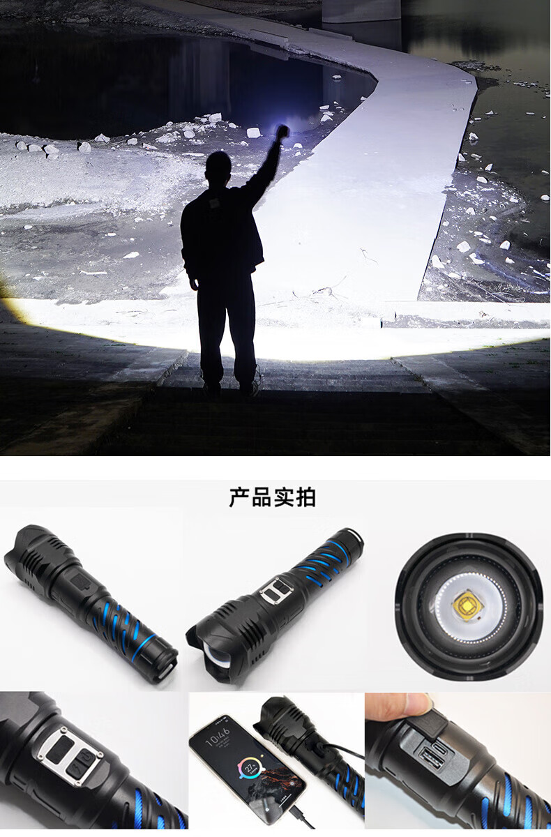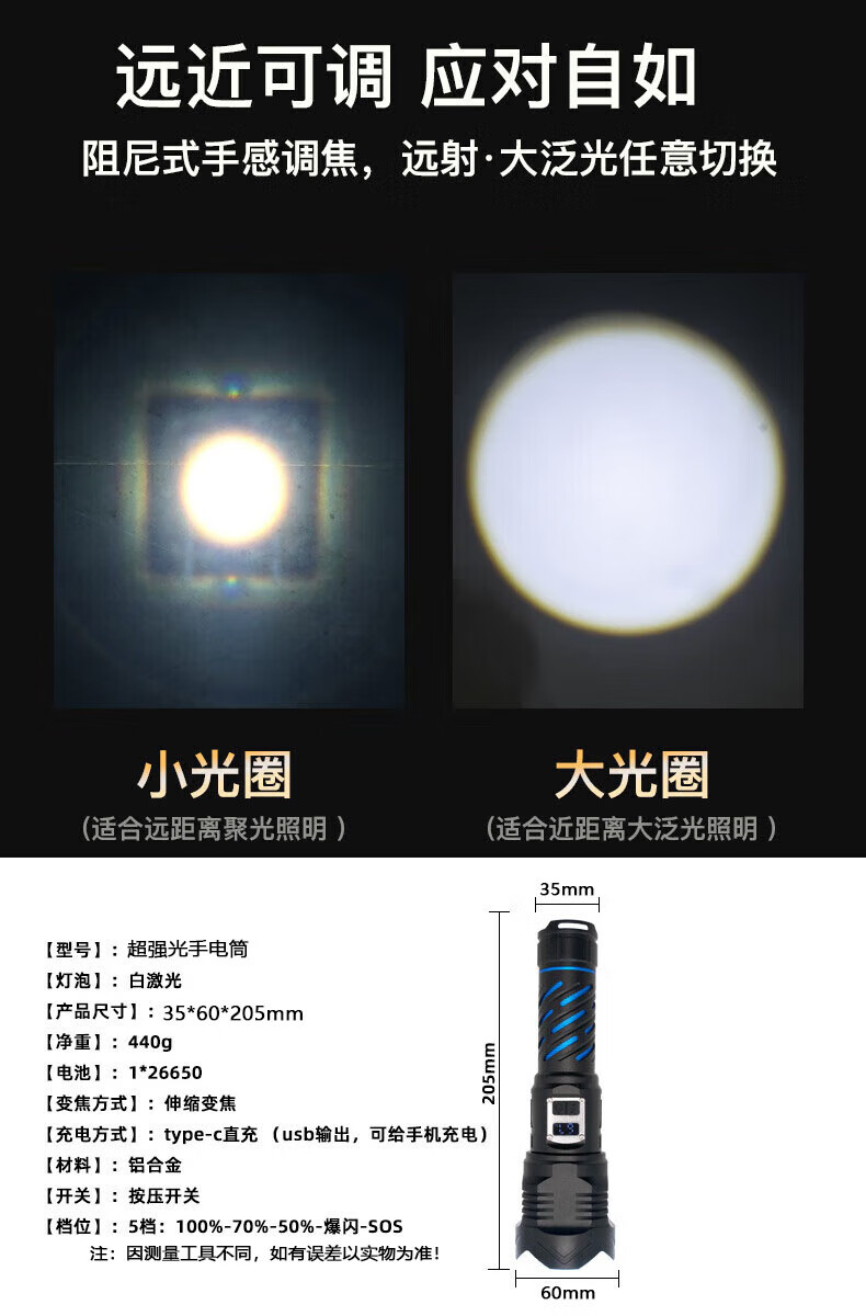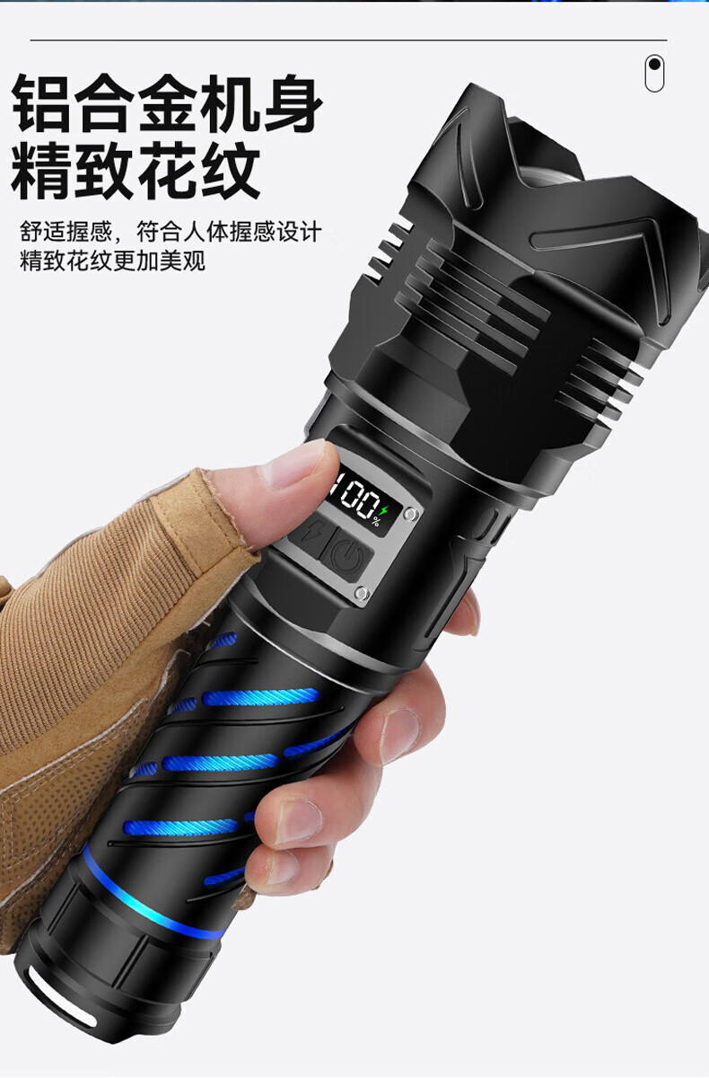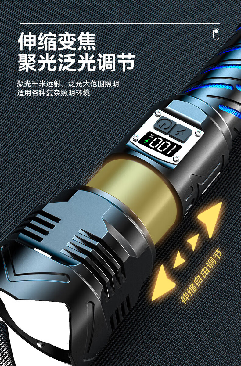 兆燊 强光手电筒 户外长续航超亮白激光远射1500米充电手电筒可伸缩变焦 26650锂电池+液晶电显【京仓发】