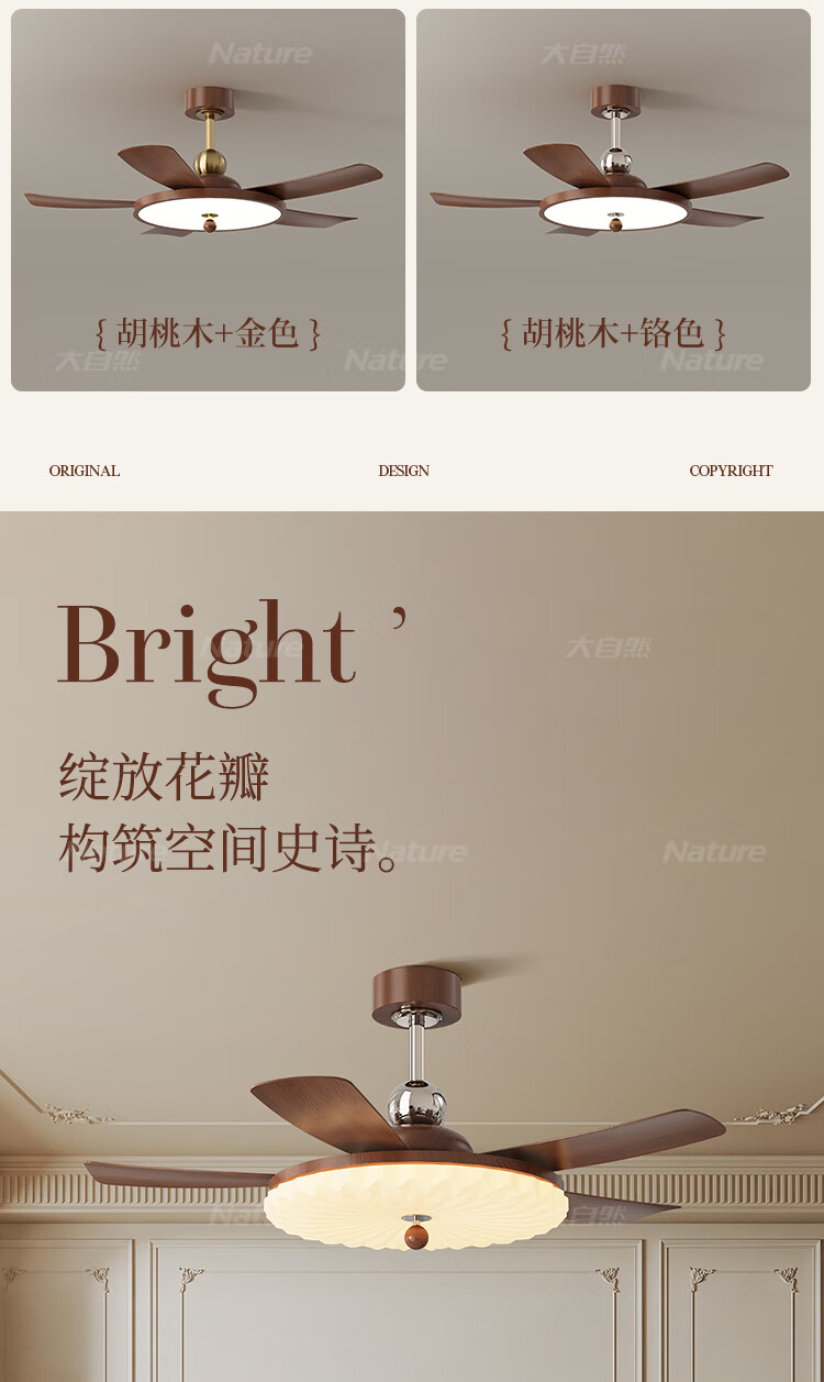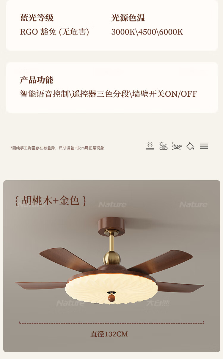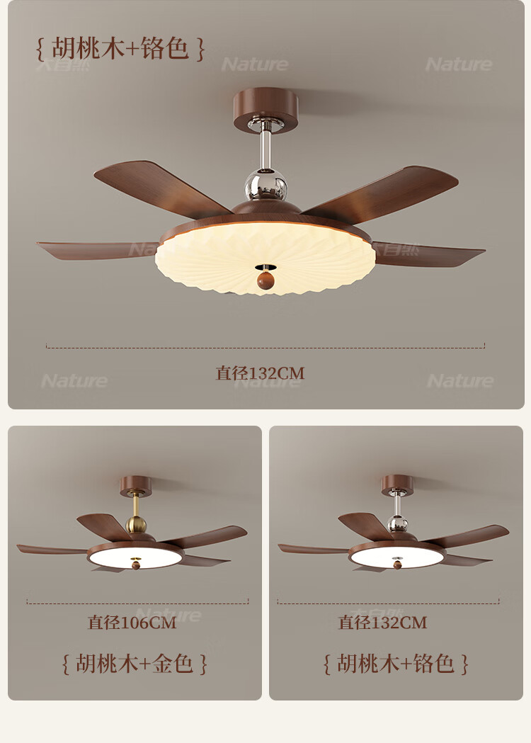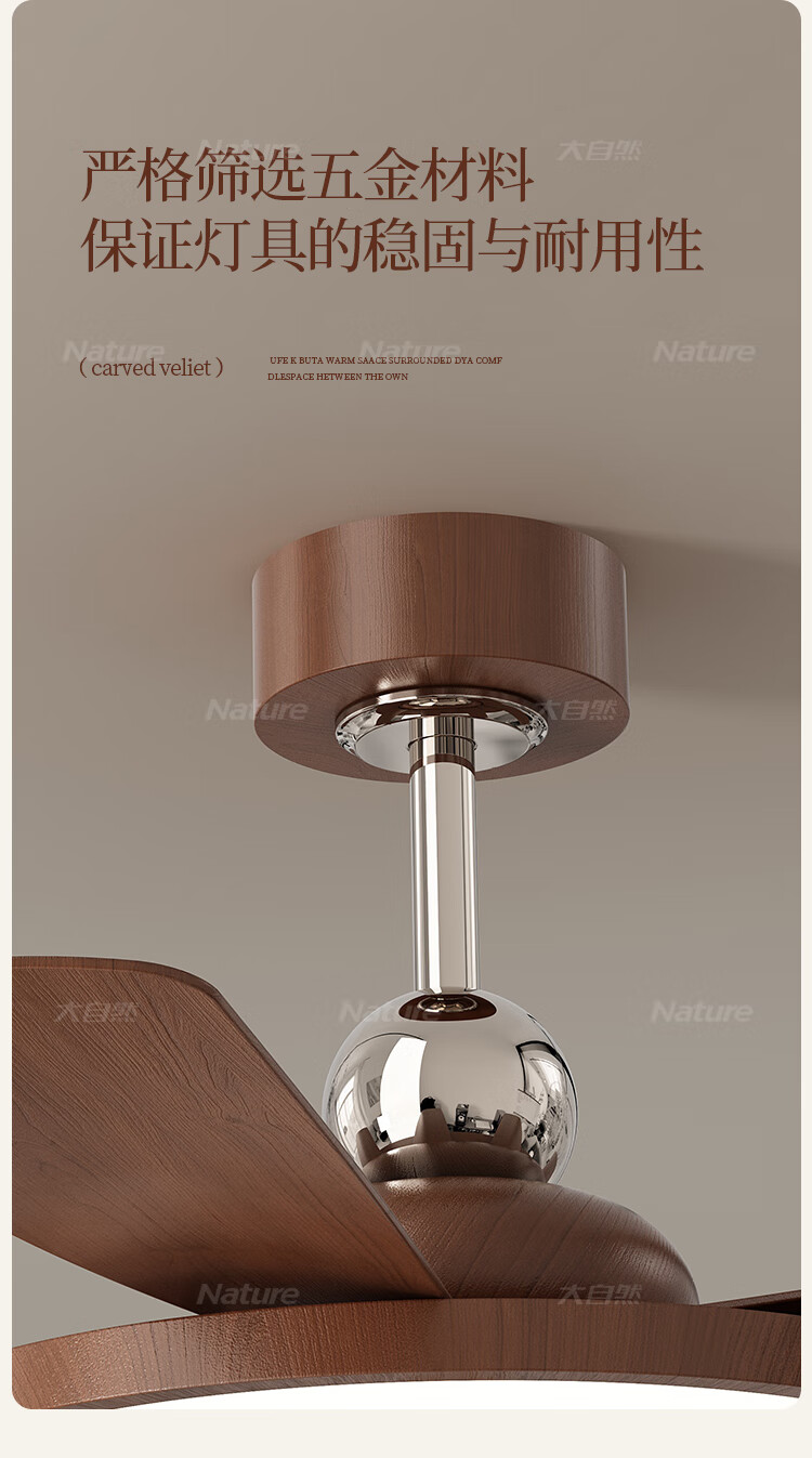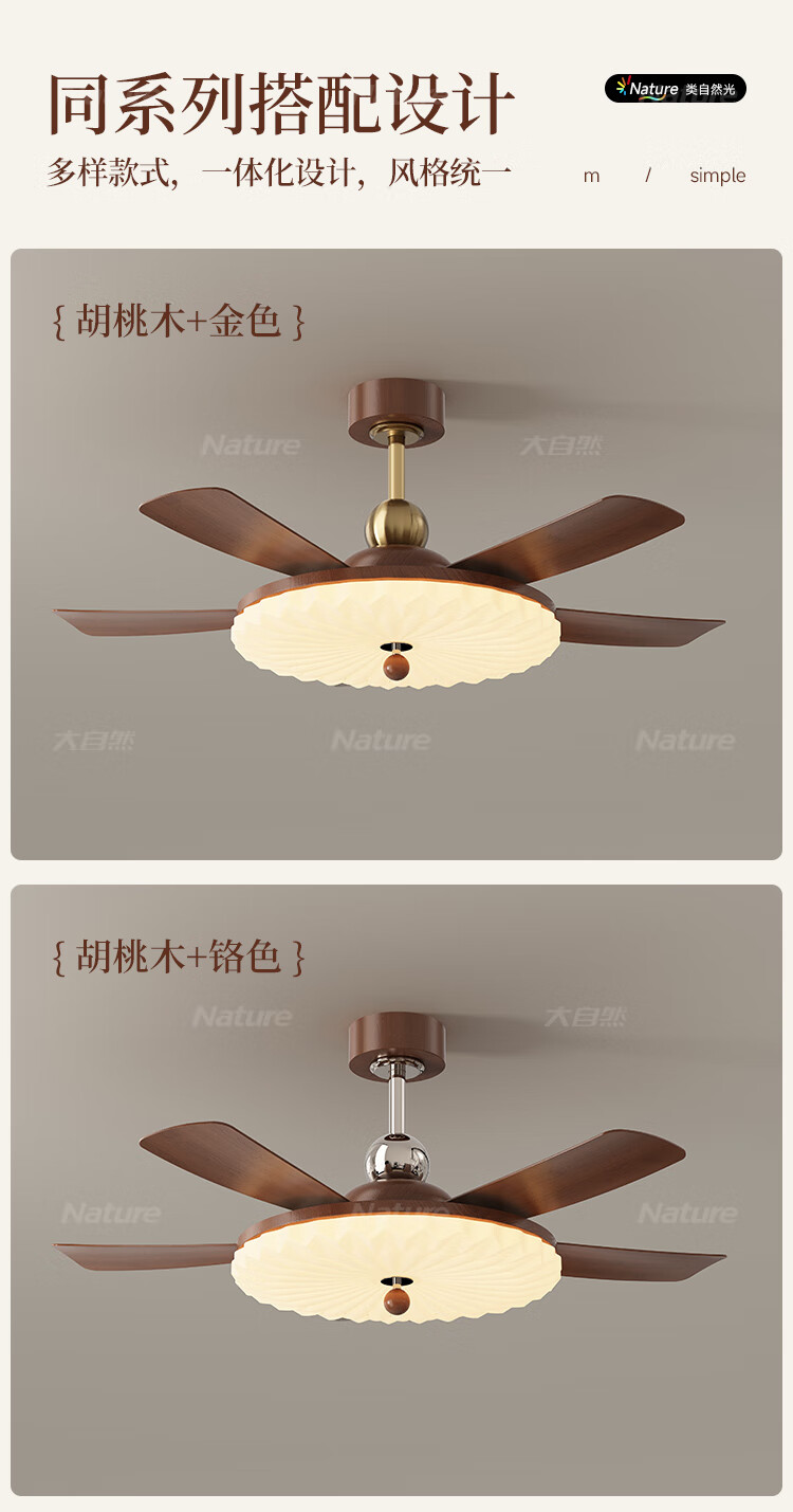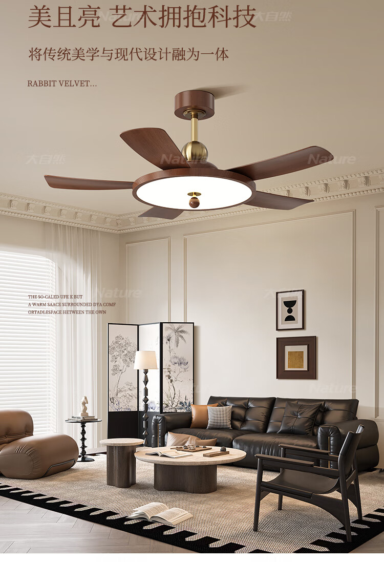 大自然照明52寸客厅风扇灯中古风胡桃木色复古2025年新款直叶一体吊扇餐厅灯 【3020】胡桃木色+电镀金色 42寸 TM精灵