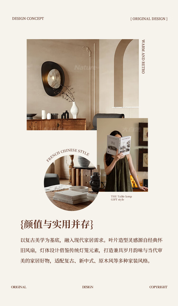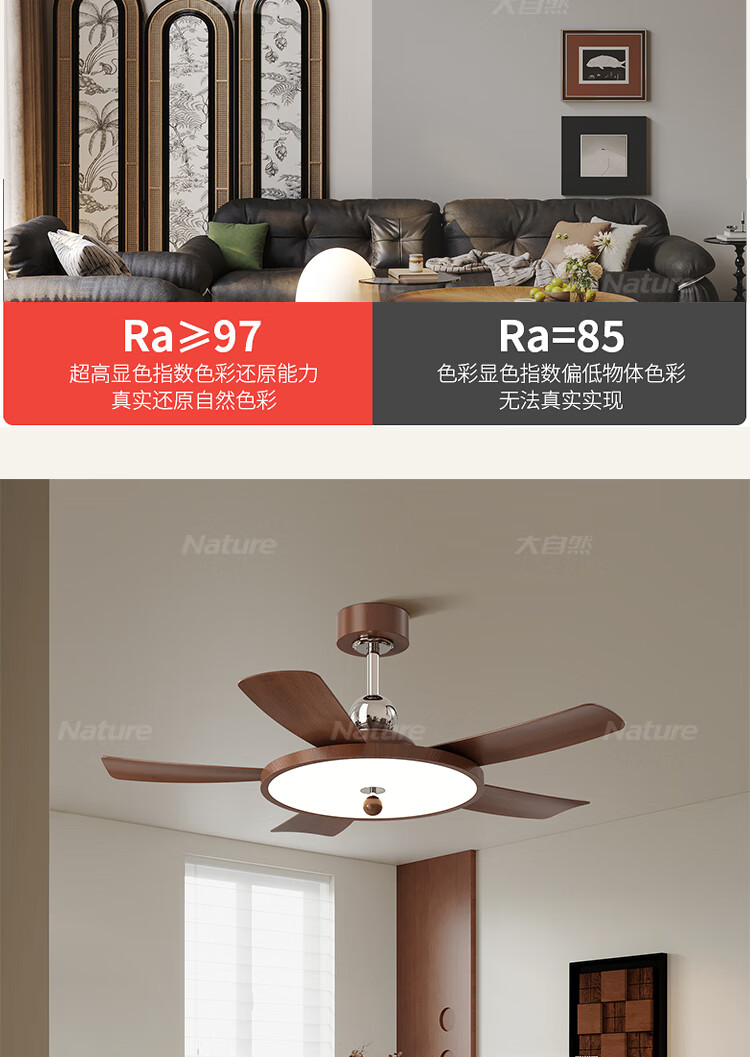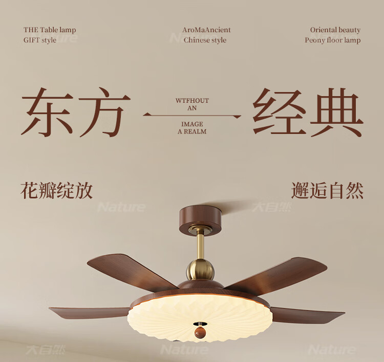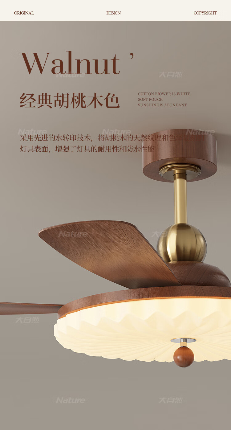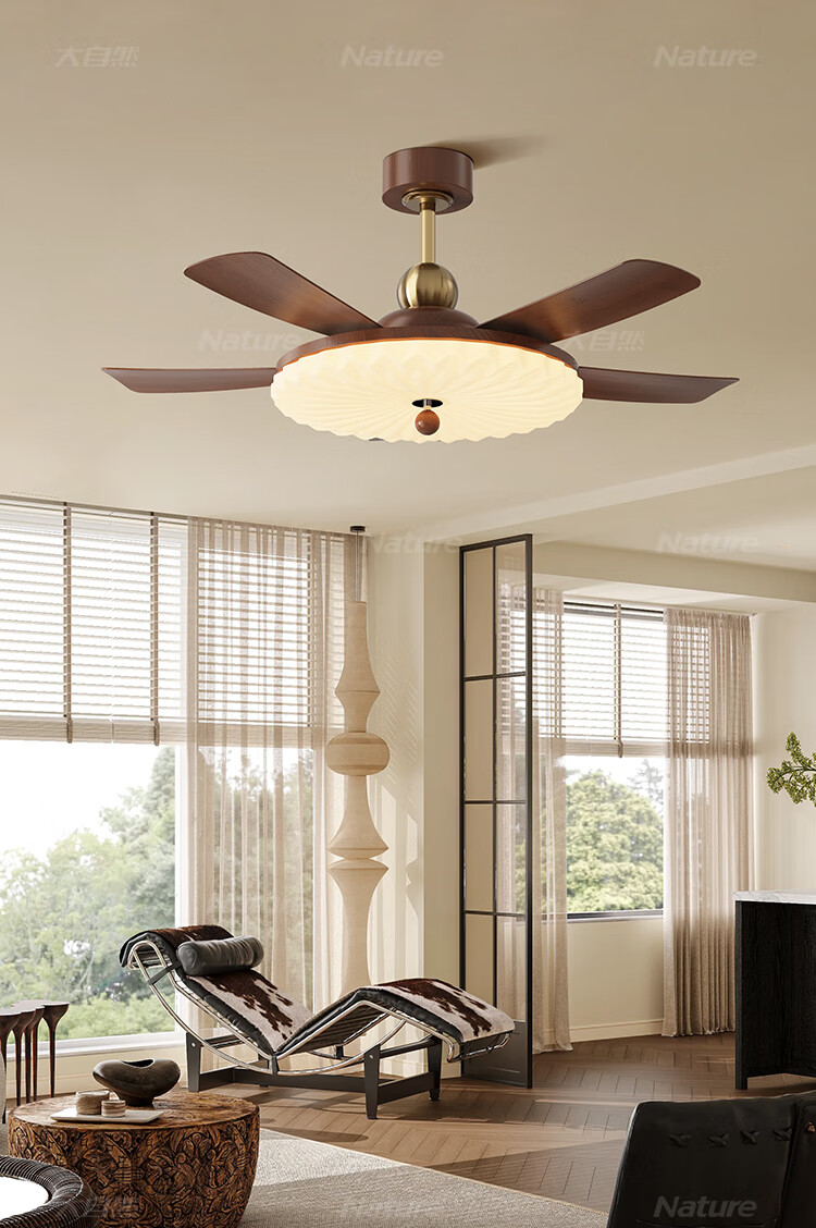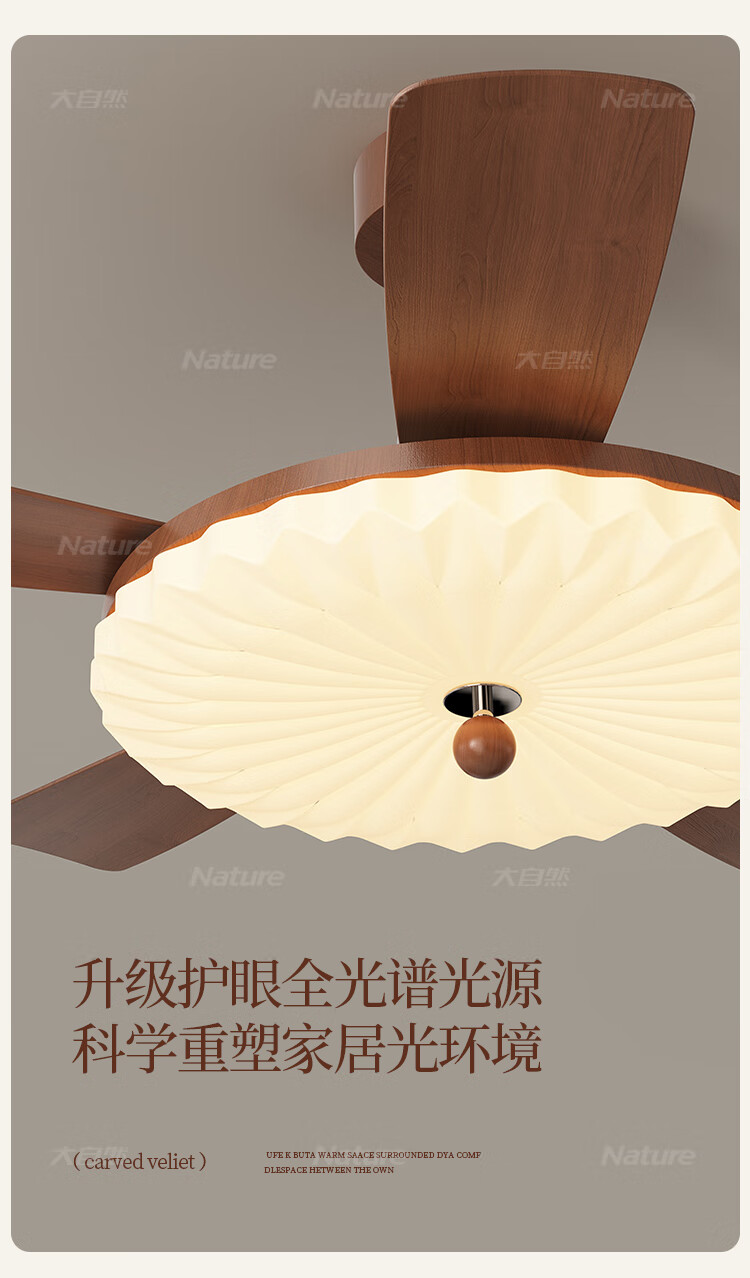 大自然照明52寸客厅风扇灯中古风胡桃木色复古2025年新款直叶一体吊扇餐厅灯 【3020】胡桃木色+电镀金色 42寸 TM精灵