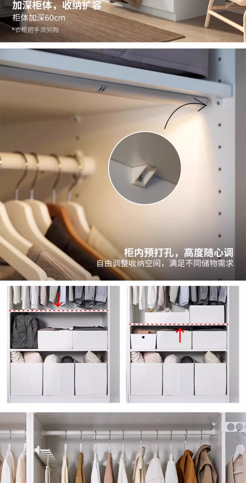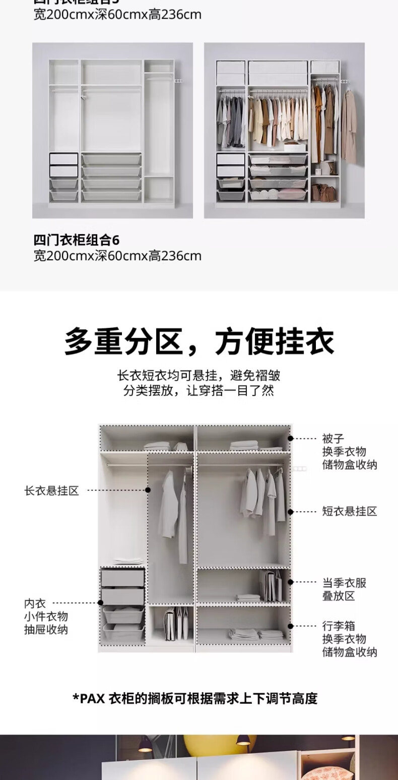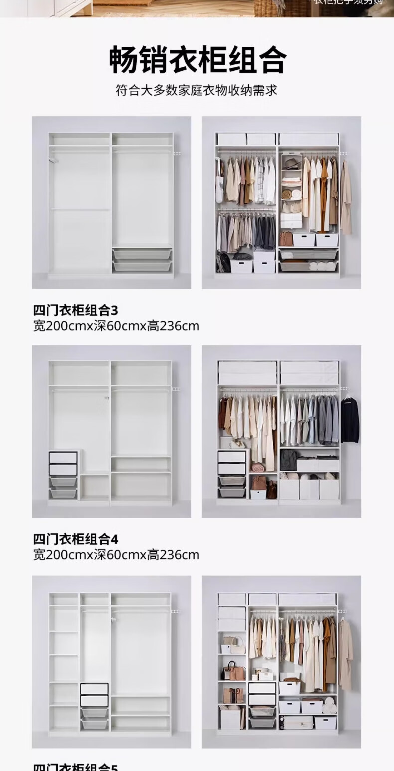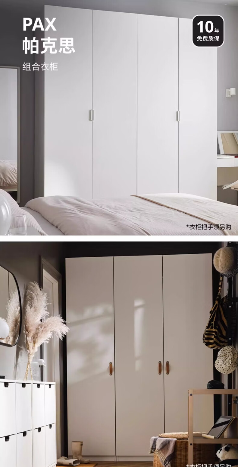 宜家(IKEA)PAX帕克思家用卧室组合衣柜小户型衣橱储物柜白色四门柜 三门衣柜组合4(125宽x60深x236高)