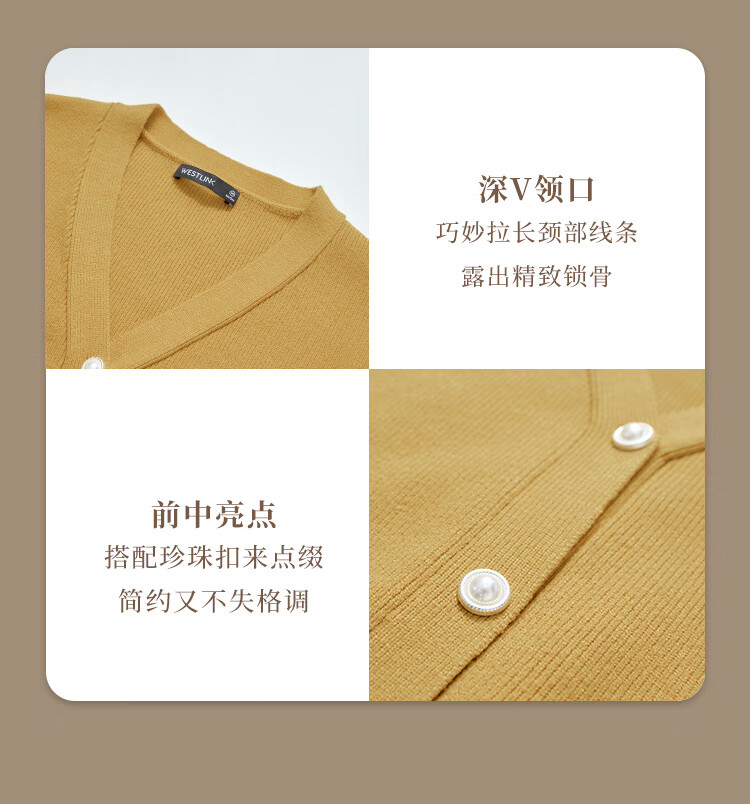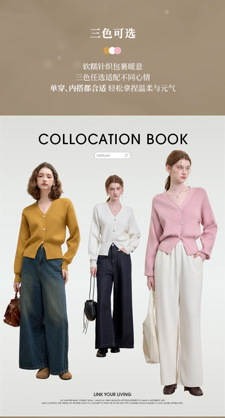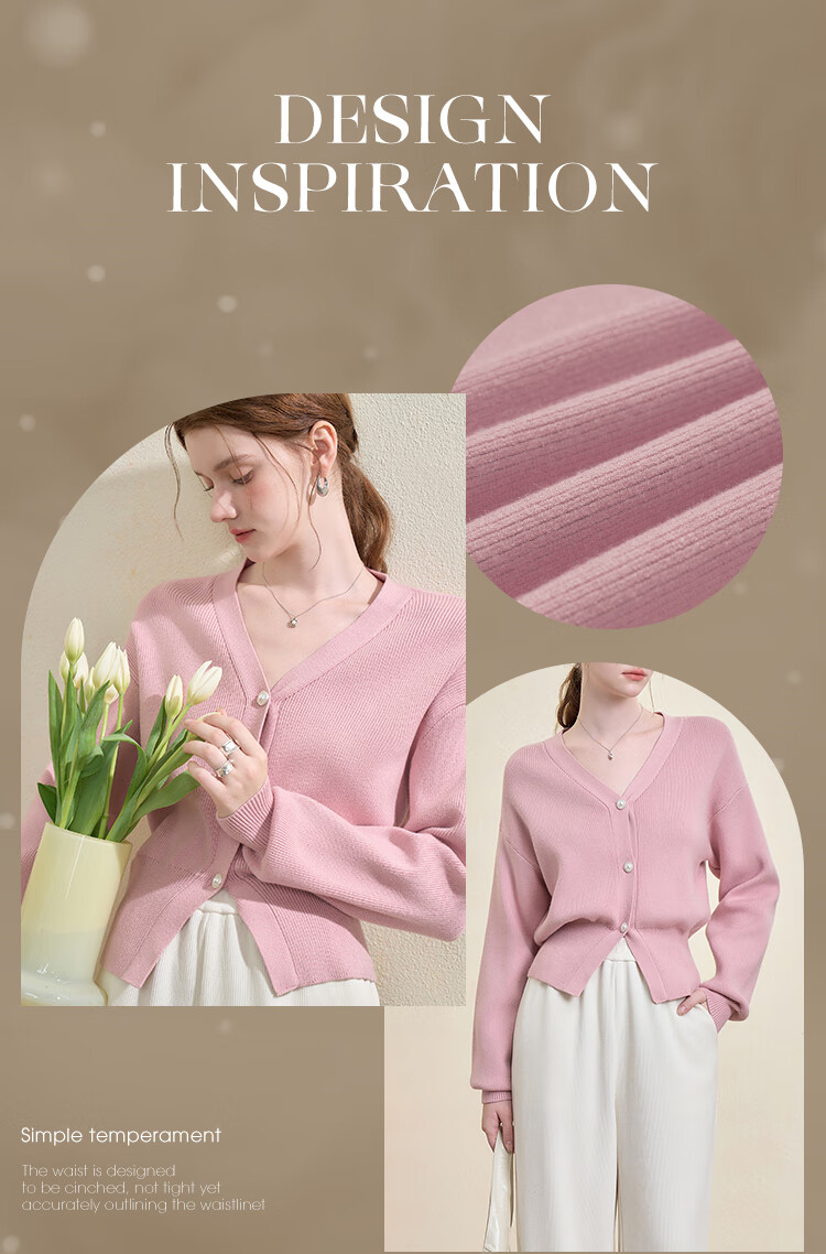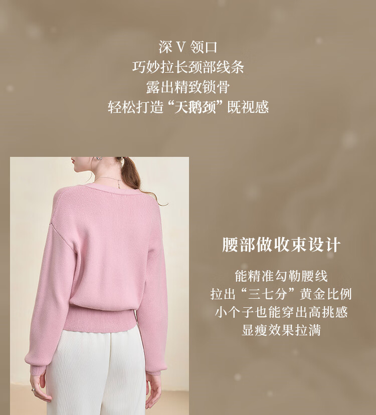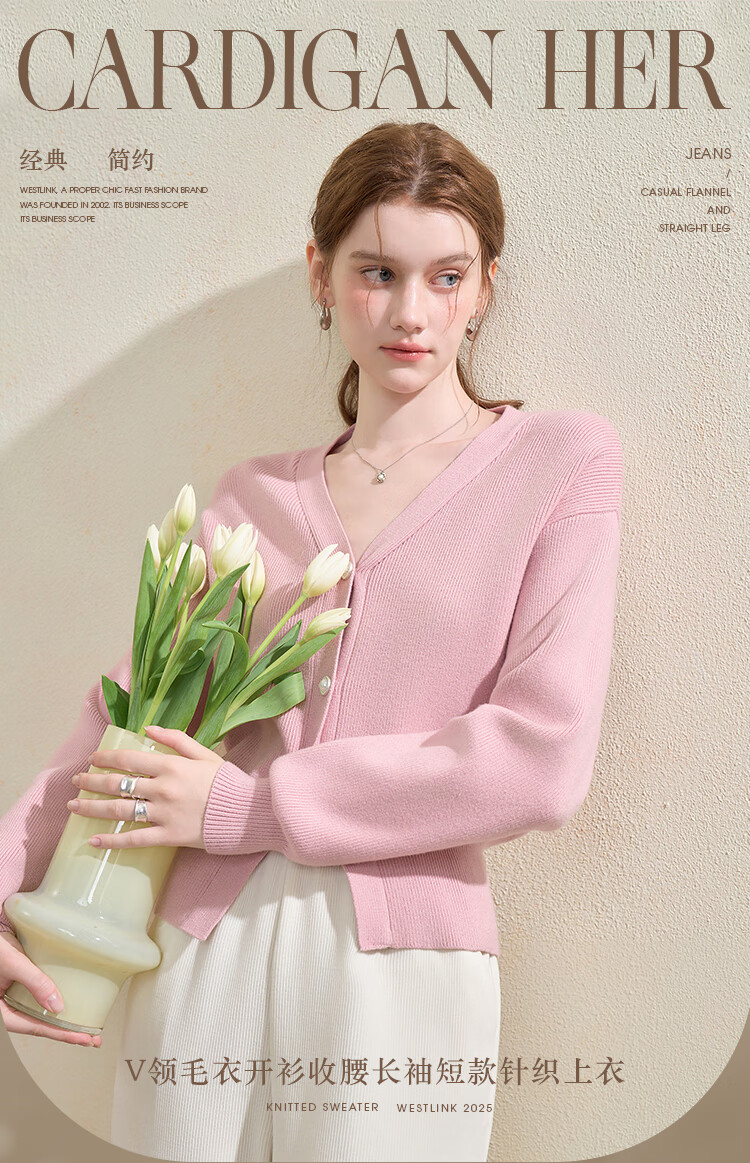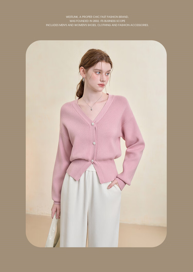 西遇(Westlink)法式气质V领针织开衫女秋季百搭收腰显瘦毛衣外套上衣 粉色 M/L/XL11月20日 M