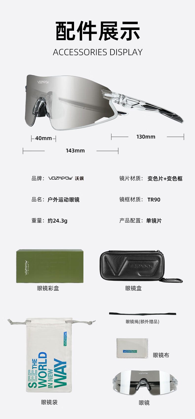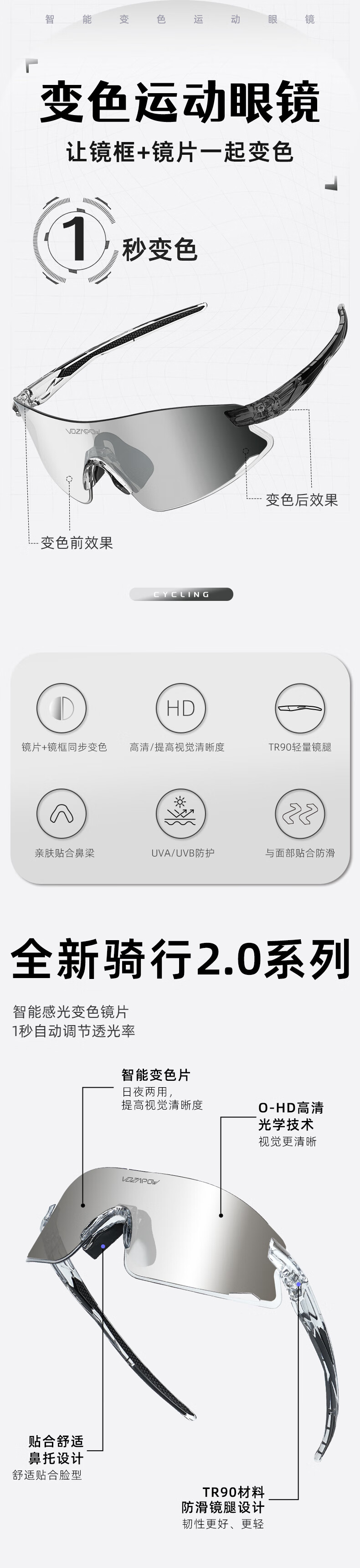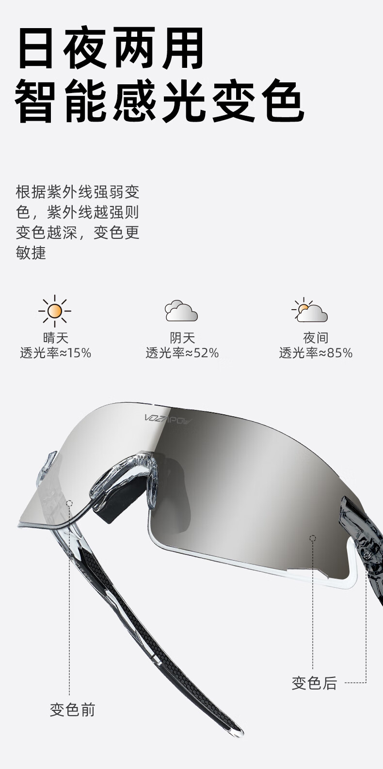 VOZAPOW沃飒骑行眼镜框变色日夜两用公路自行车跑步运动护目镜男女太阳镜