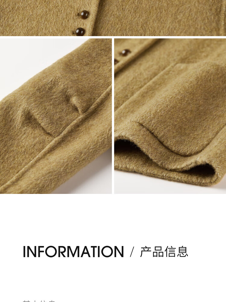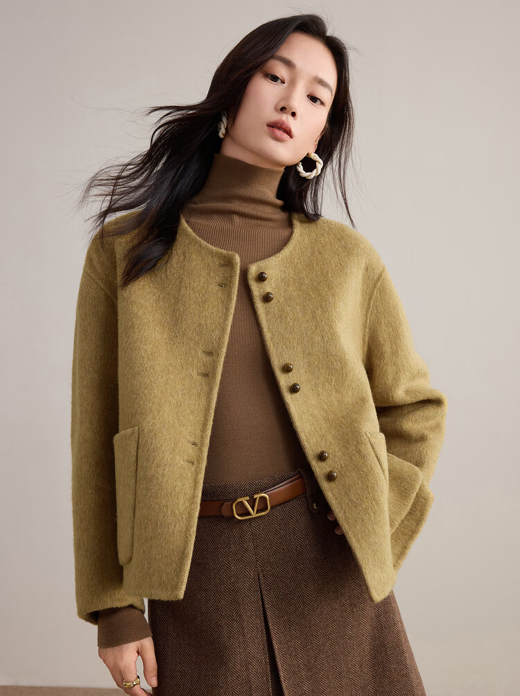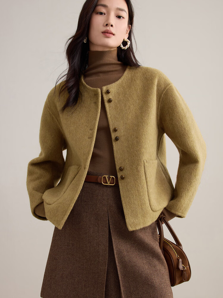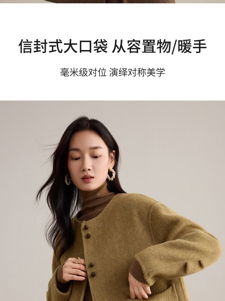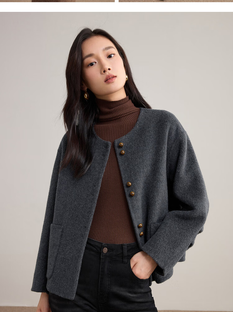 尚都比拉保暖厚双面呢大衣女冬季含羊毛轻奢圆领直筒外套撞色设计开衫上衣