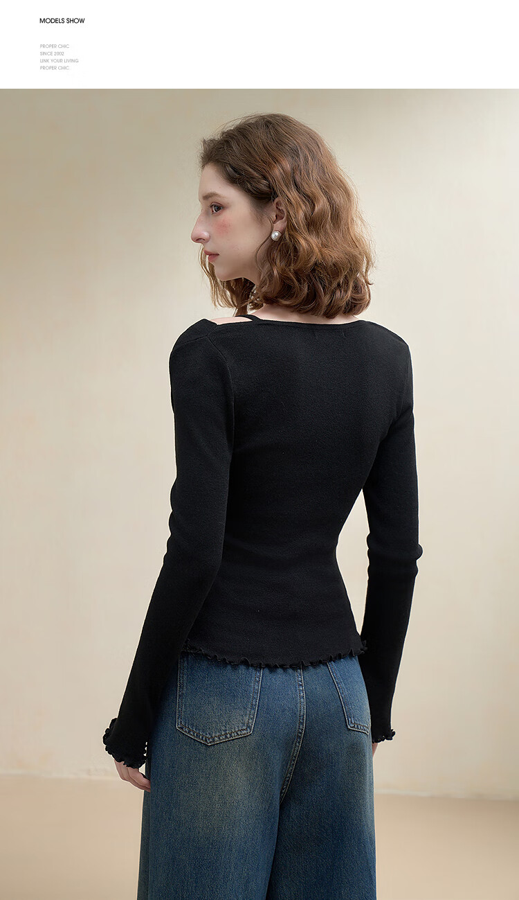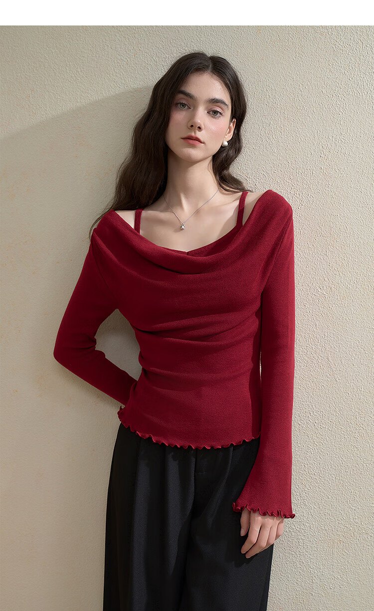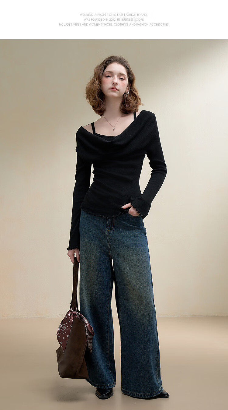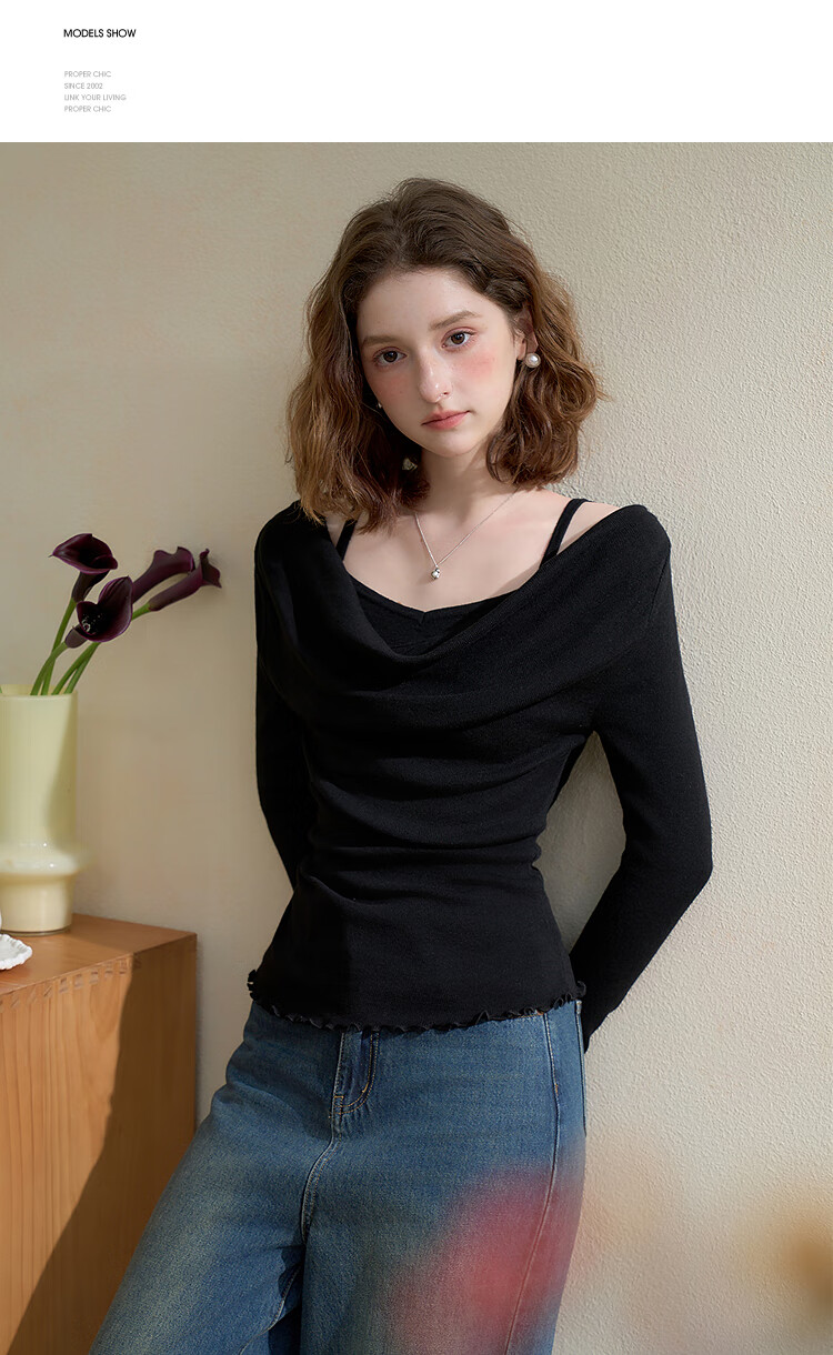 西遇韩系气质荡领假两件长袖针织衫女2025秋季高级感修身显瘦上衣 黑色 M (160)