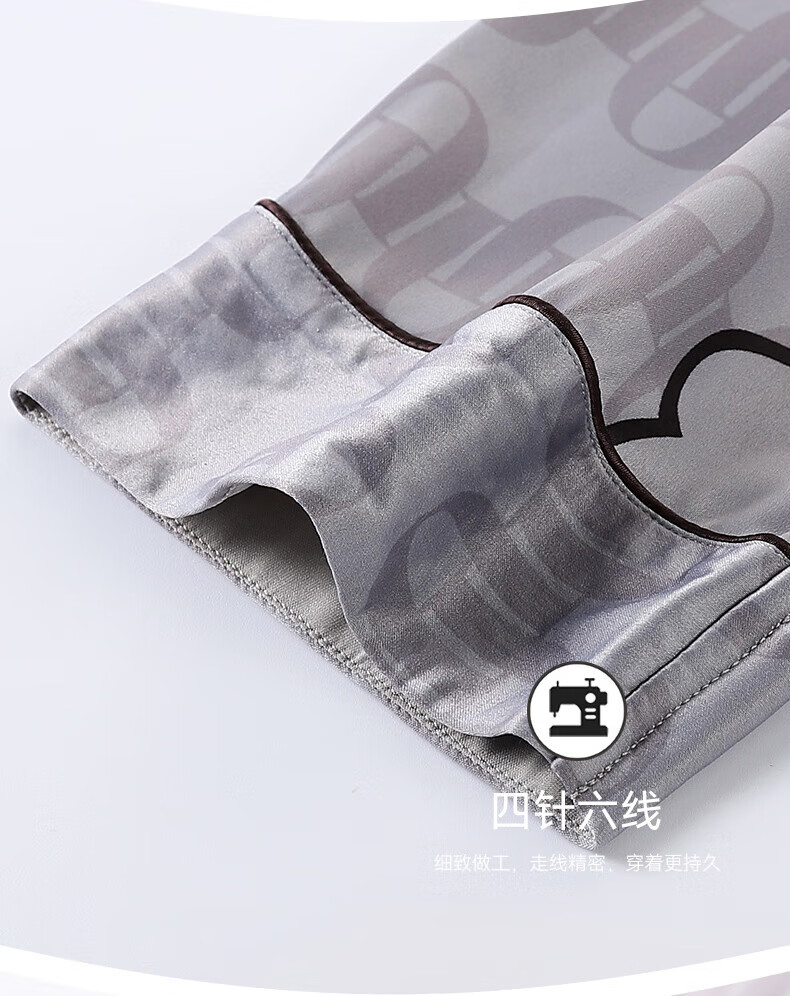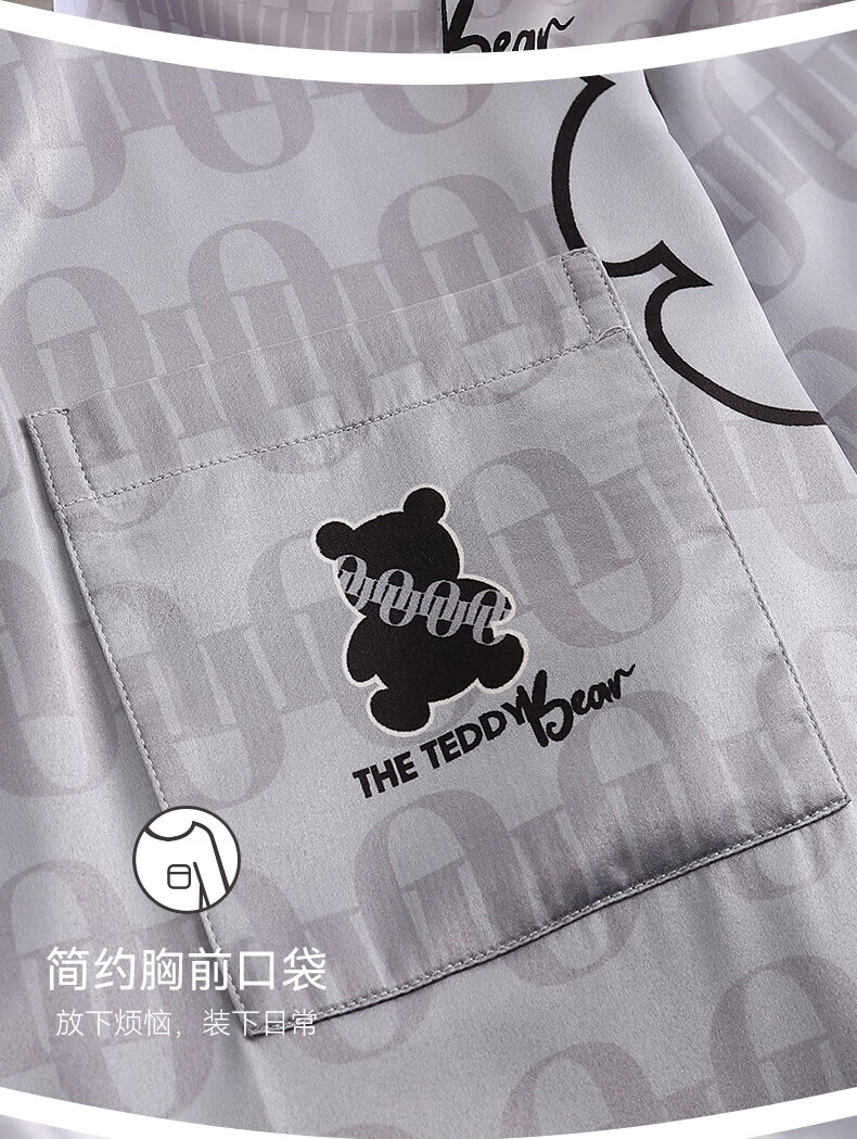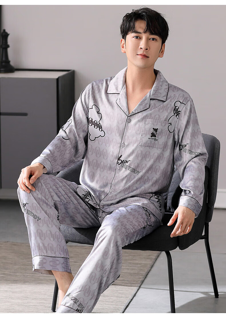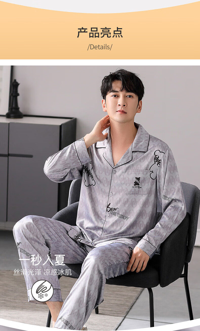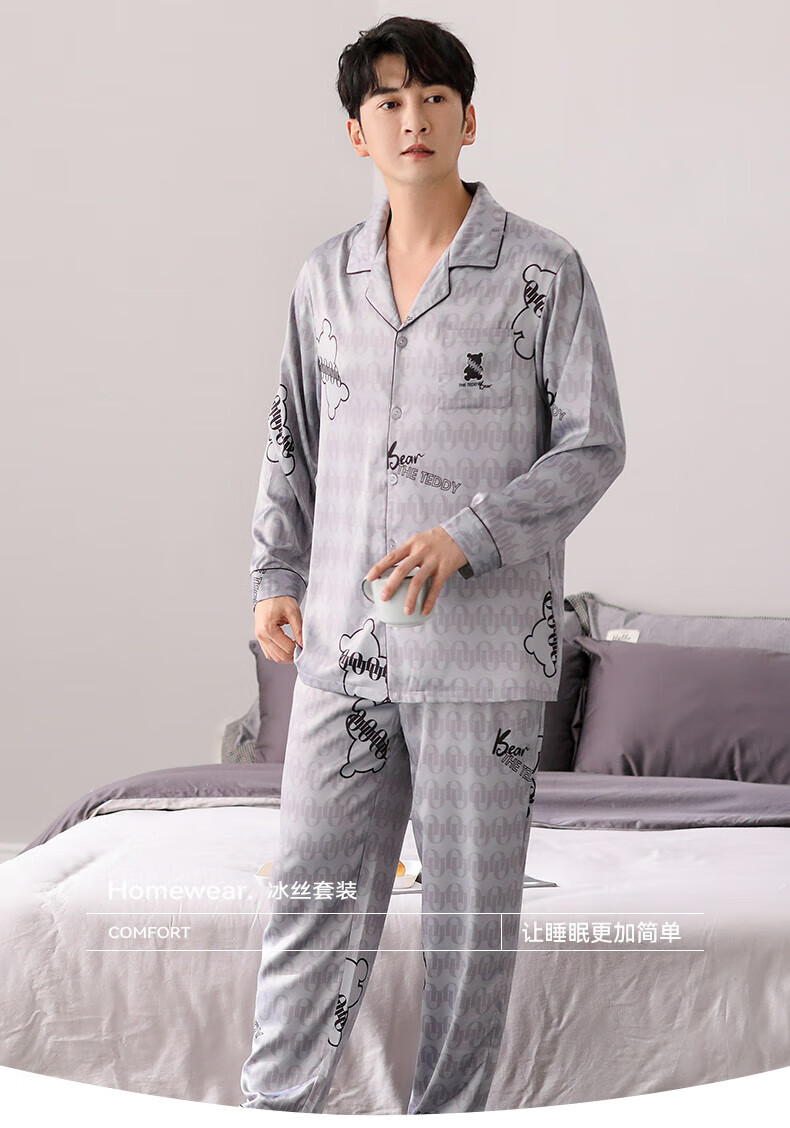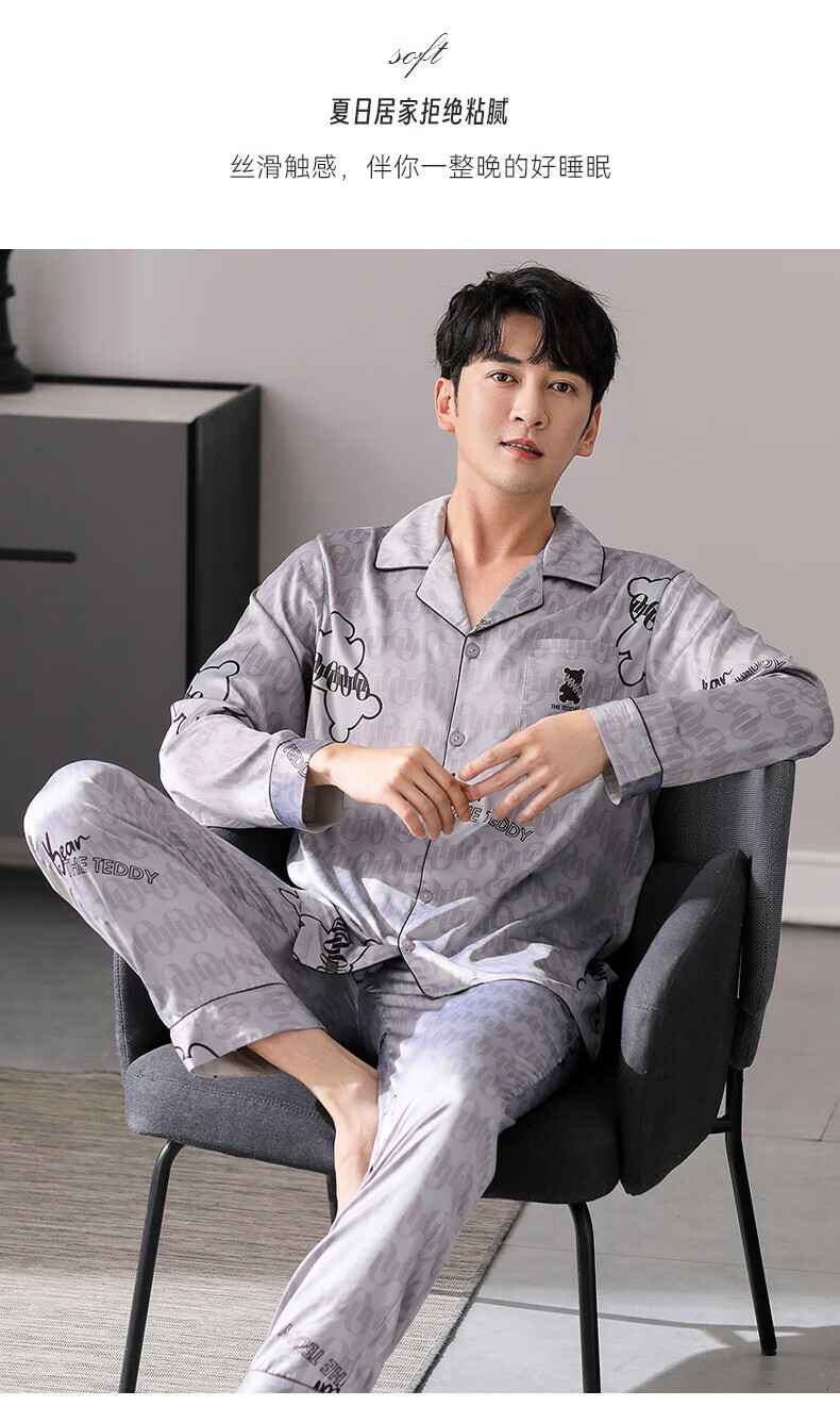 芬腾睡衣男【冰丝】儒雅绅士范透气长袖开衫家居服套装 灰色 3XL