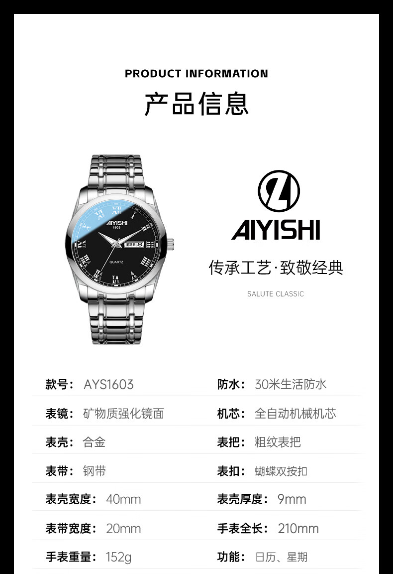 爱依士AIYISHI官网手表男士全自动机械表防水男士腕表