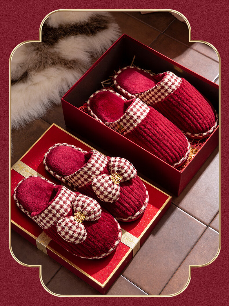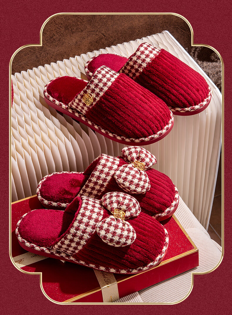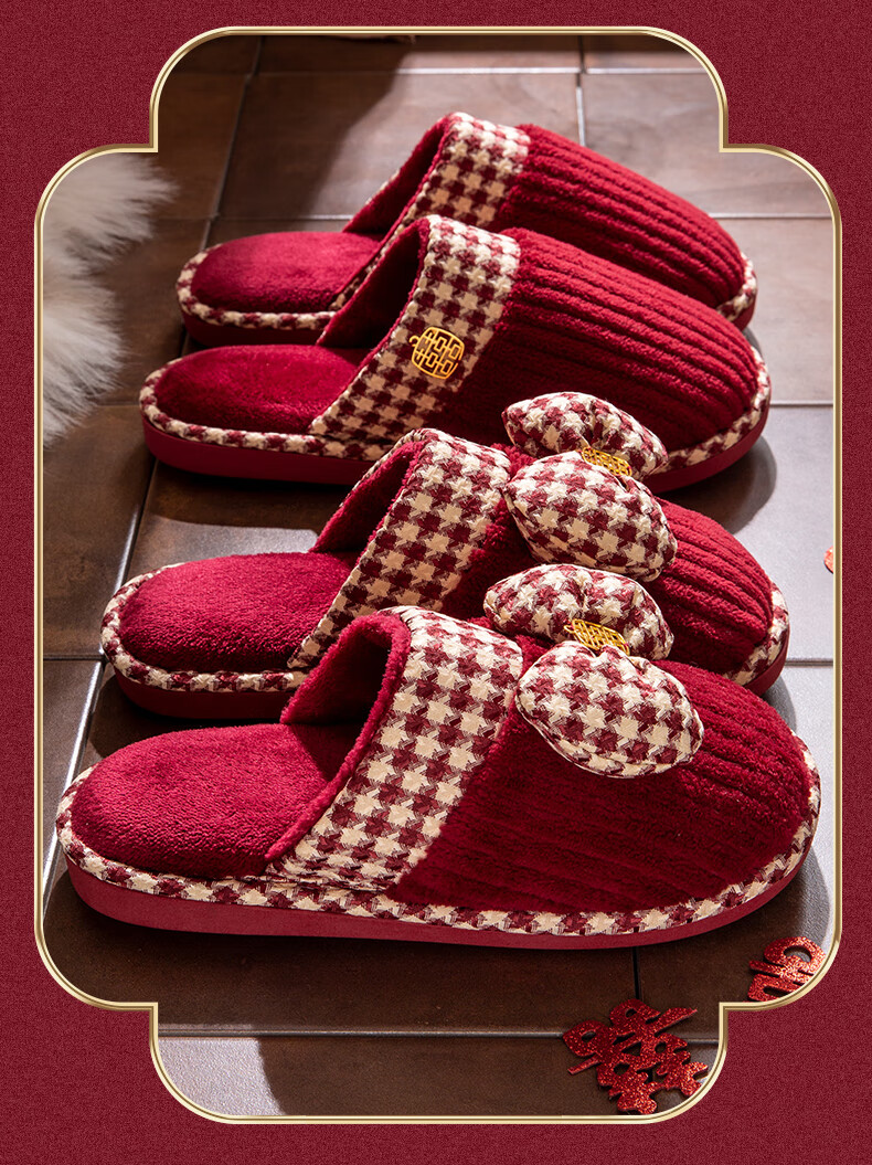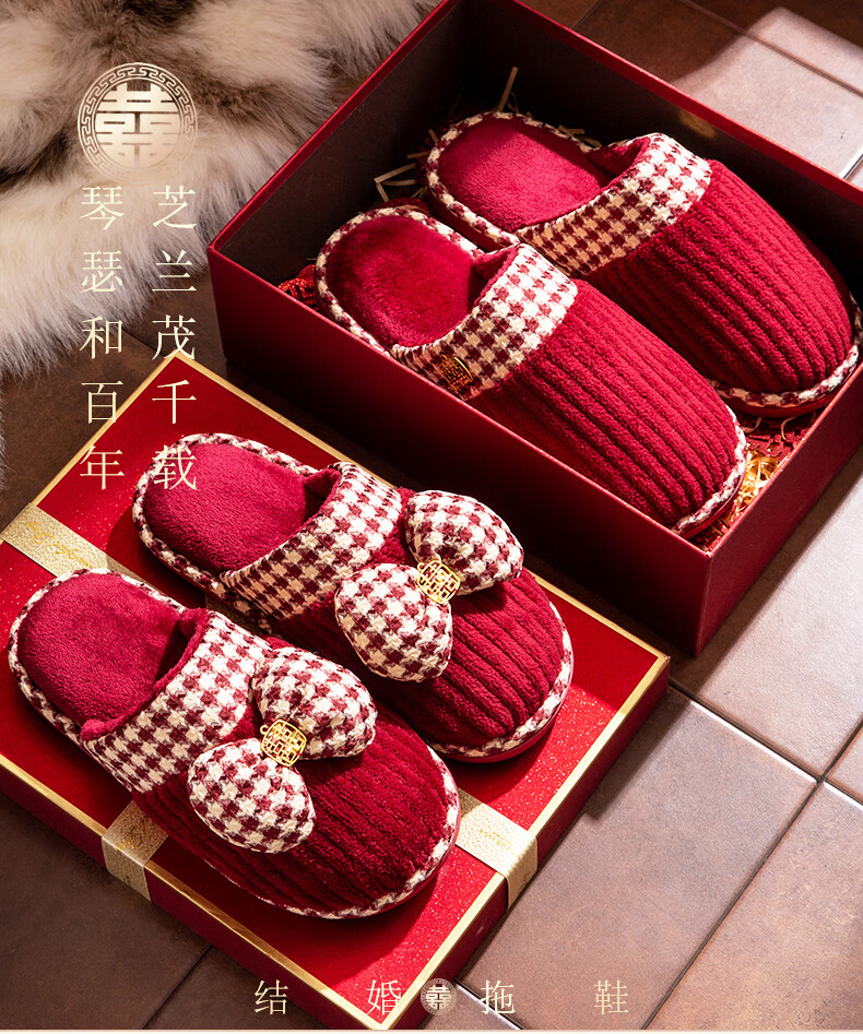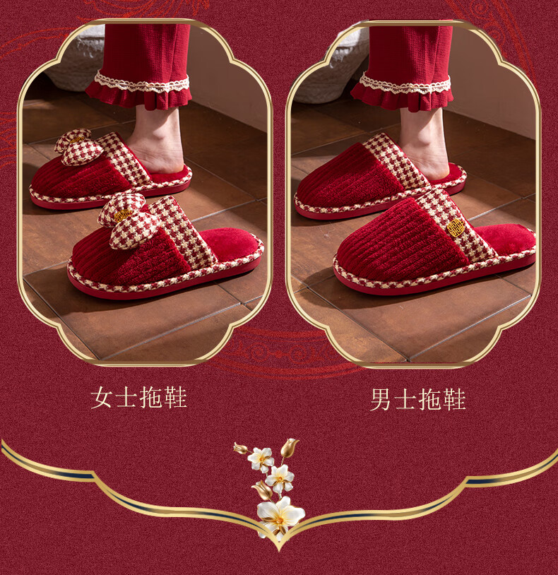 DEATKN德国结婚拖鞋喜庆红色一对冬季新婚礼新娘陪嫁轻奢晨袍棉拖鞋婚鞋 新娘+新郎【圆鼓花蝴蝶结】 36-37 女+男40-41