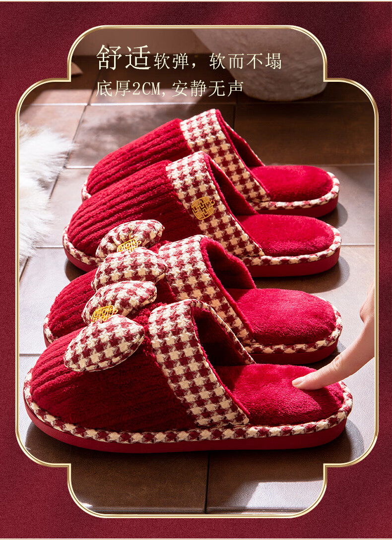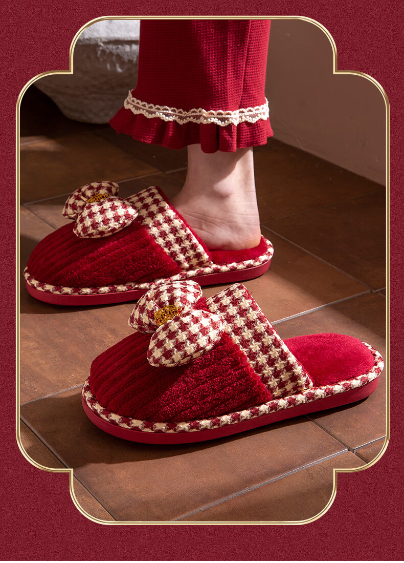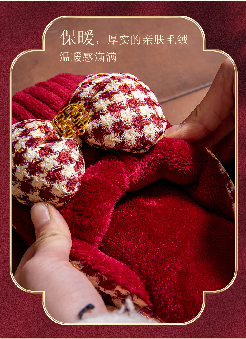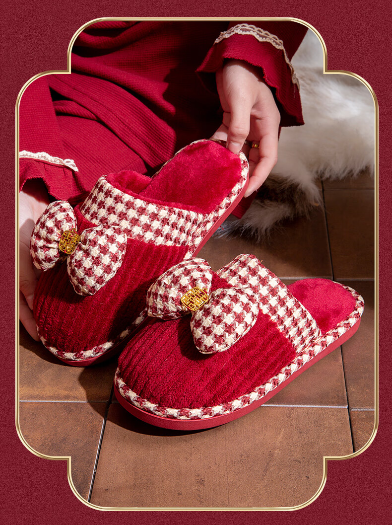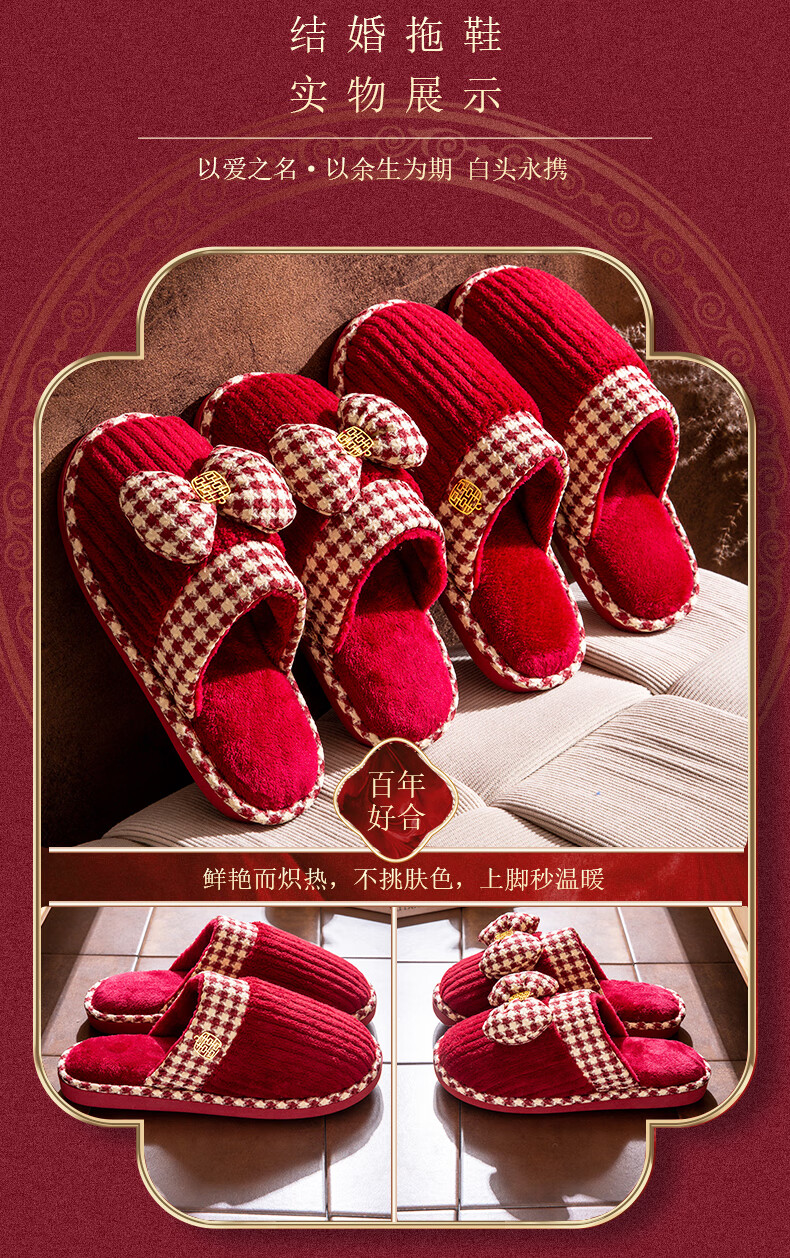 DEATKN德国结婚拖鞋喜庆红色一对冬季新婚礼新娘陪嫁轻奢晨袍棉拖鞋婚鞋 新娘+新郎【圆鼓花蝴蝶结】 36-37 女+男40-41